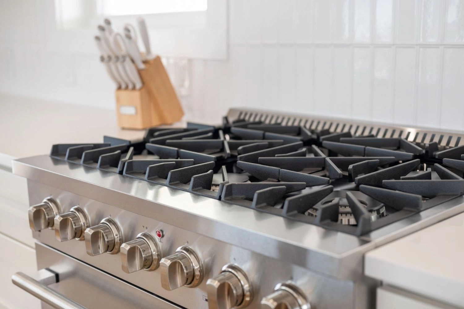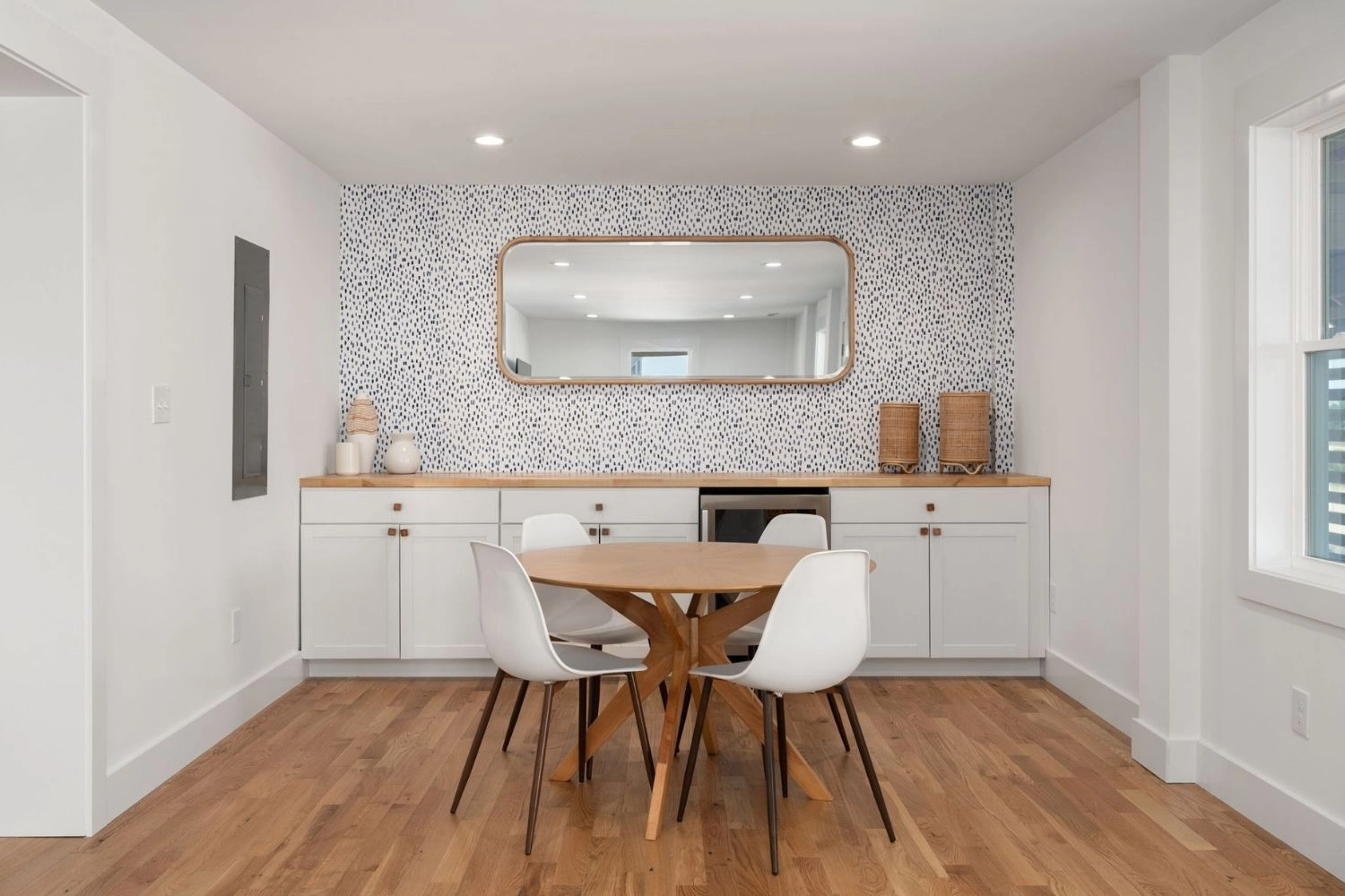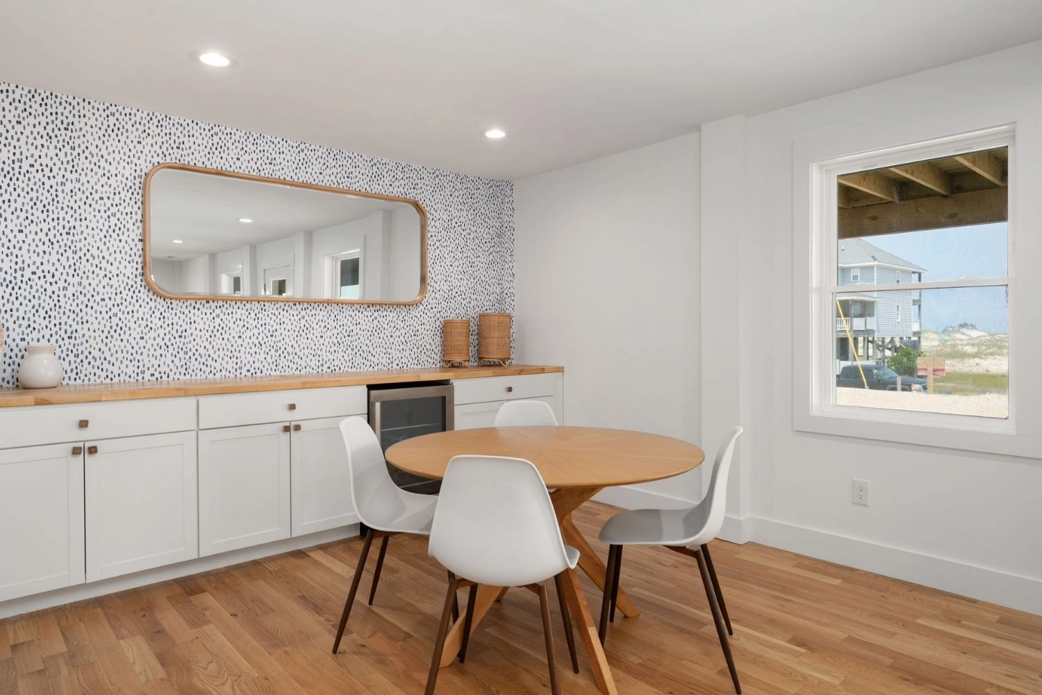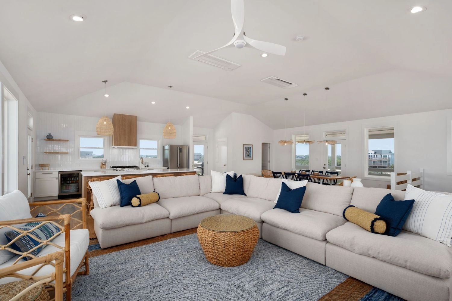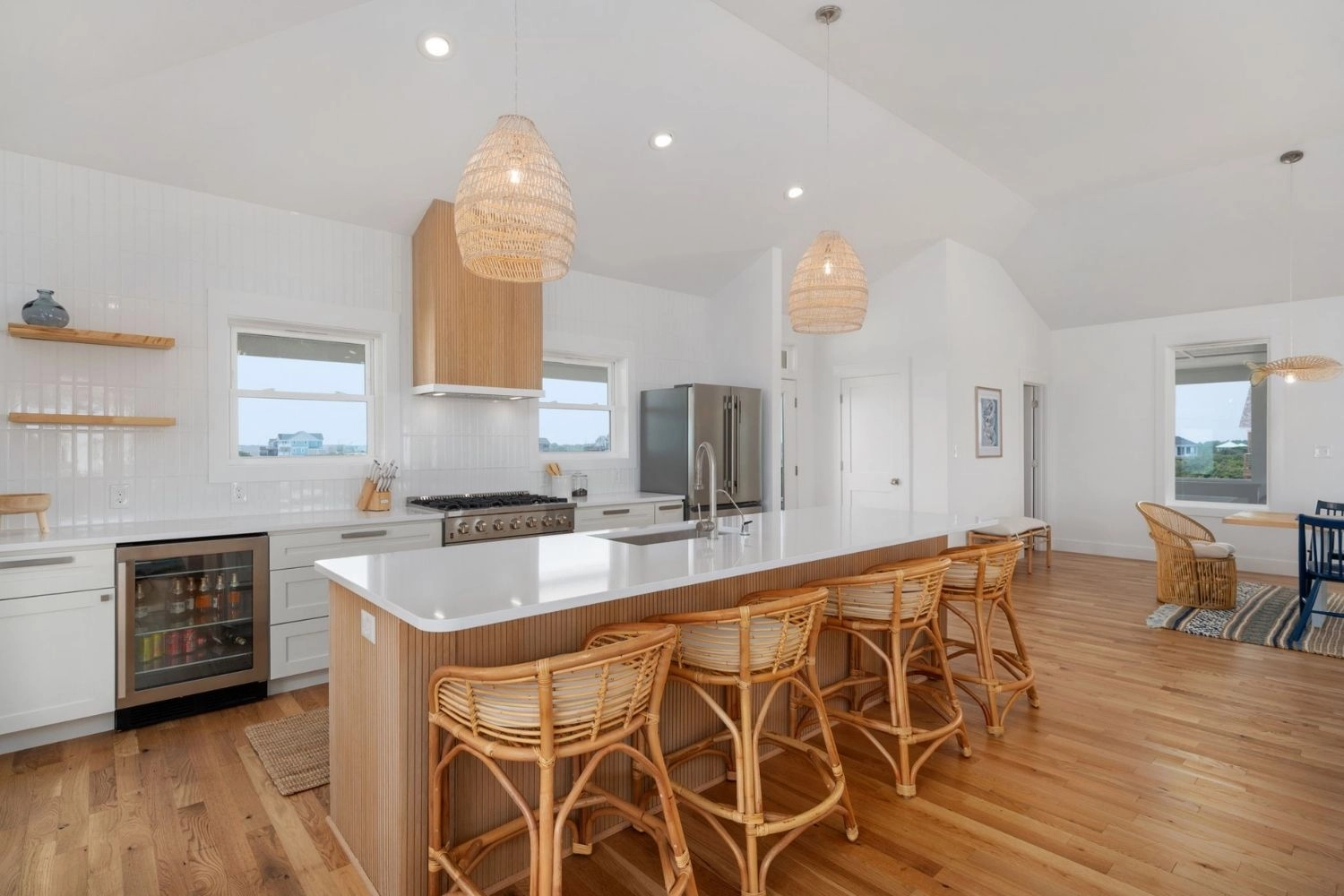 Great room with gas stove and beverage refrigerator; kitchen; dining area.