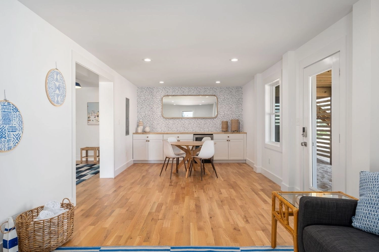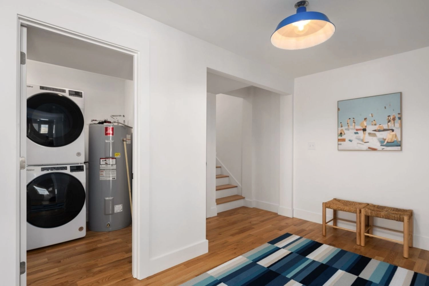 Den with beverage refrigerator; laundry.