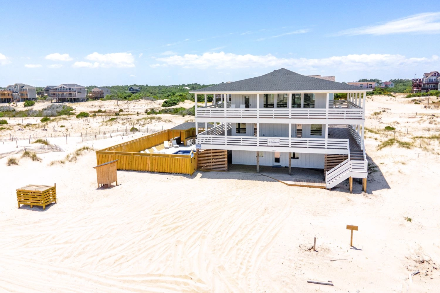 "We enjoyed our stay at St Somewhere. Home was comfortable, well stocked and those wrap around decks on the 2nd and 3rd floor were very nice for relaxing outside in the evening. We appreciated the pool, hot tub and tiki bar for the windy days when we couldn’t get down to the beach. So much wind. 😏 All in all we had a good two week stay and wouldn’t hesitate to visit this home again."