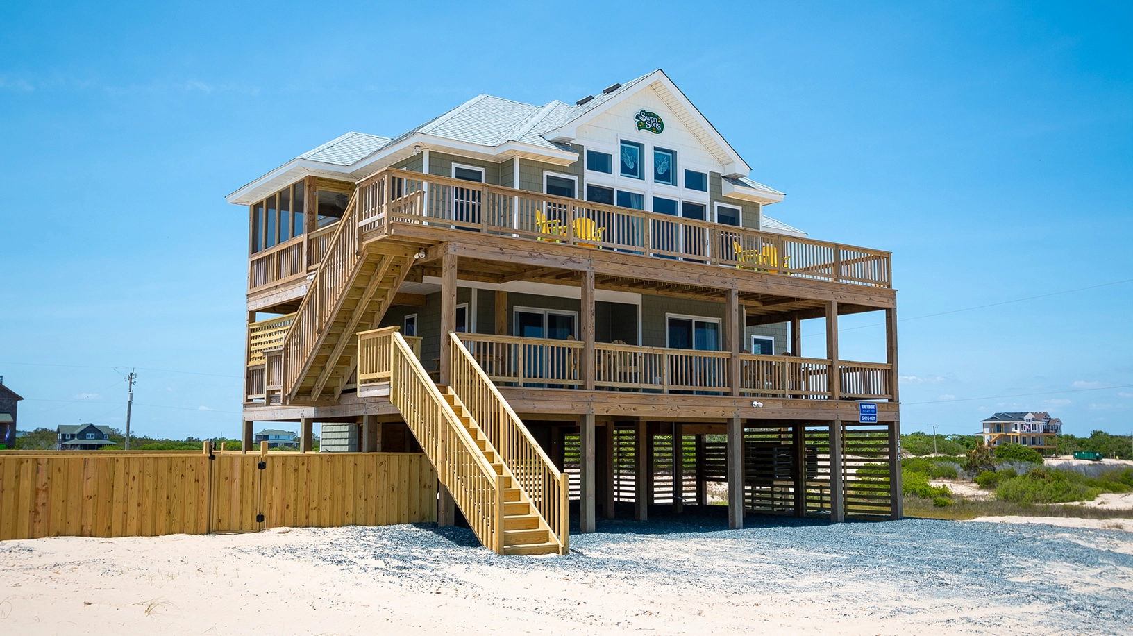 "Swan Song was nicely furnished with a lovely kitchen. It was nice the home had gates before the stairs on both ouyside decks. This allowed for us to spend time outside with our dog without having to worry about her running down to the sand."