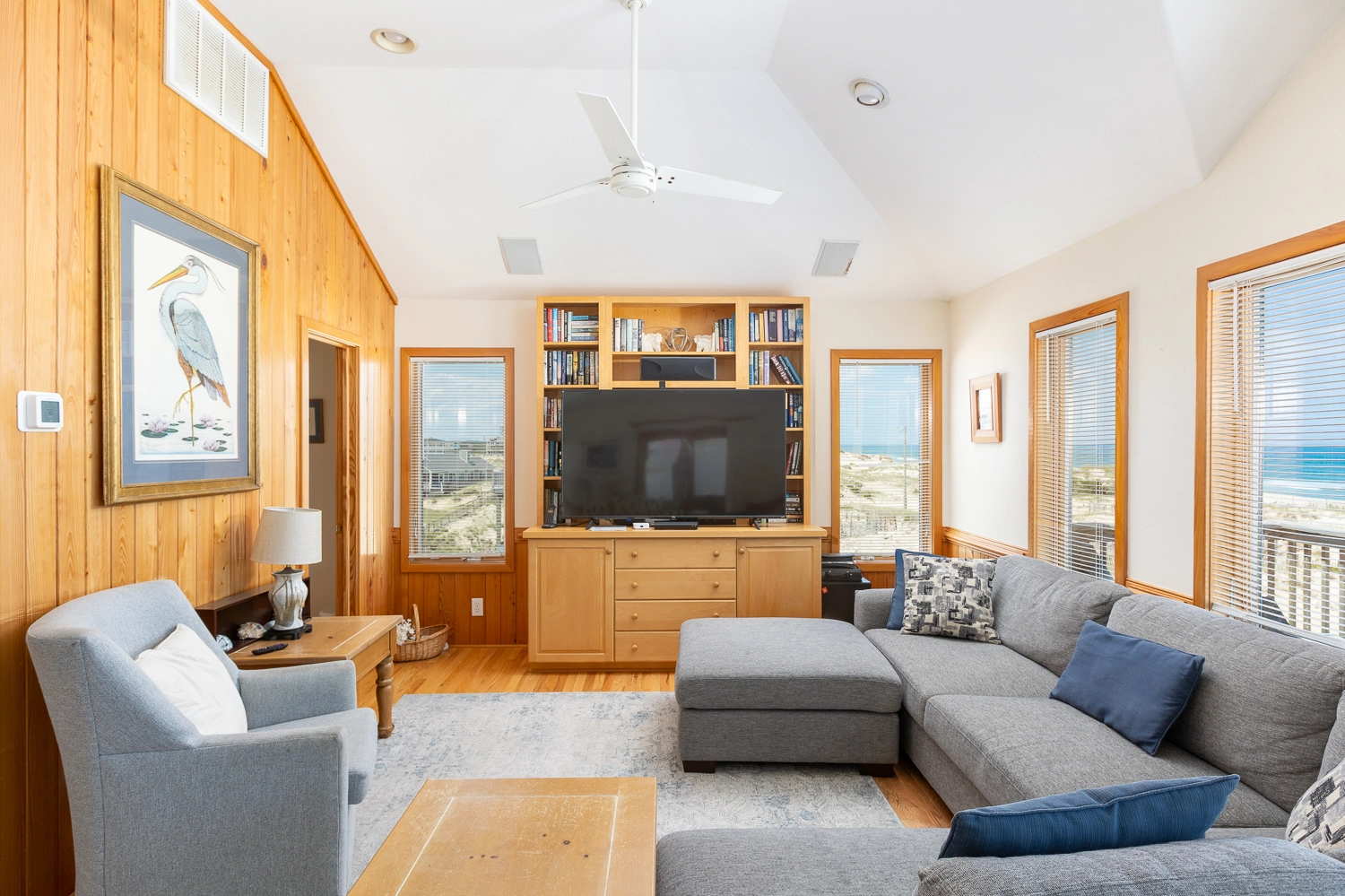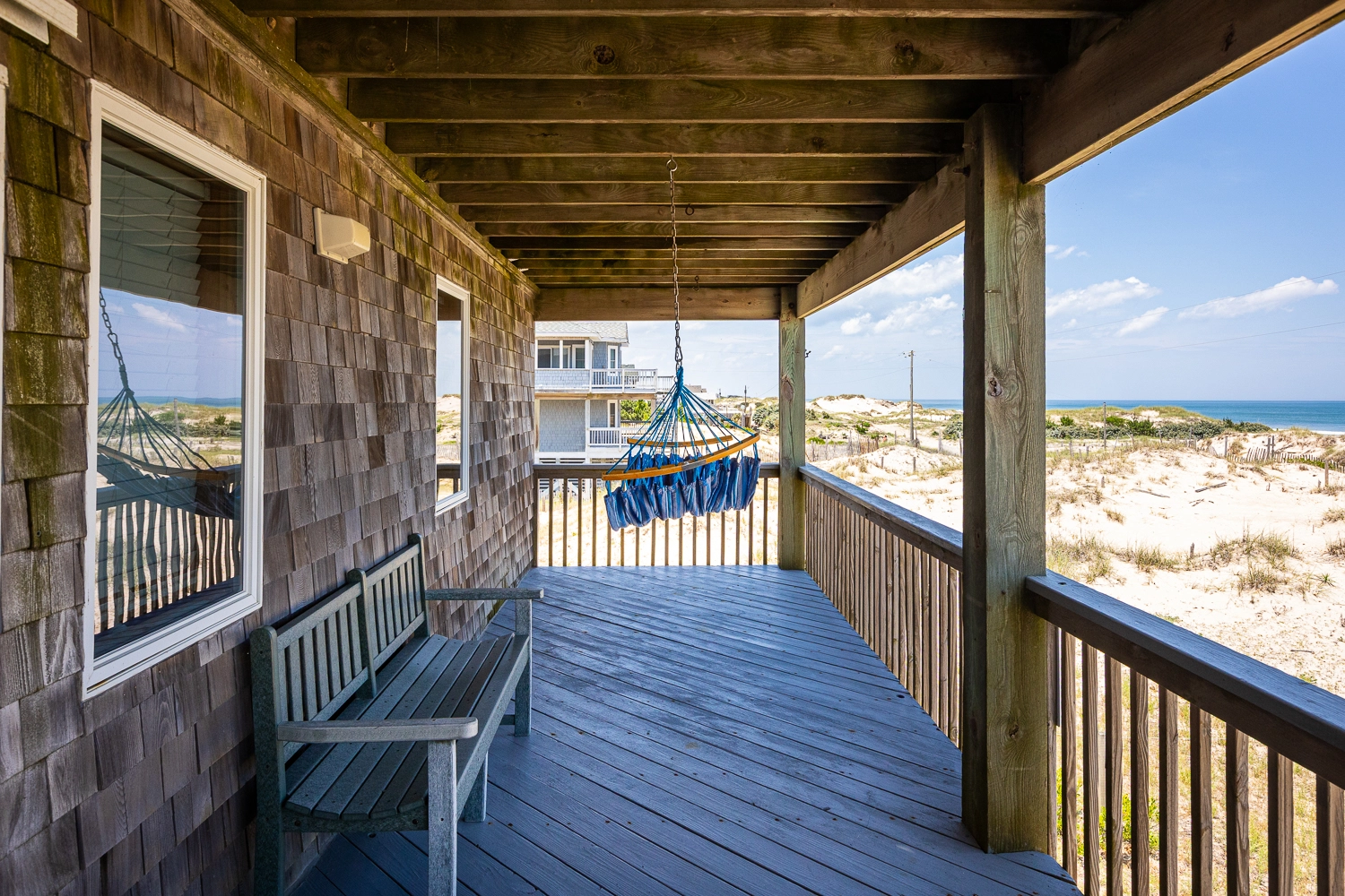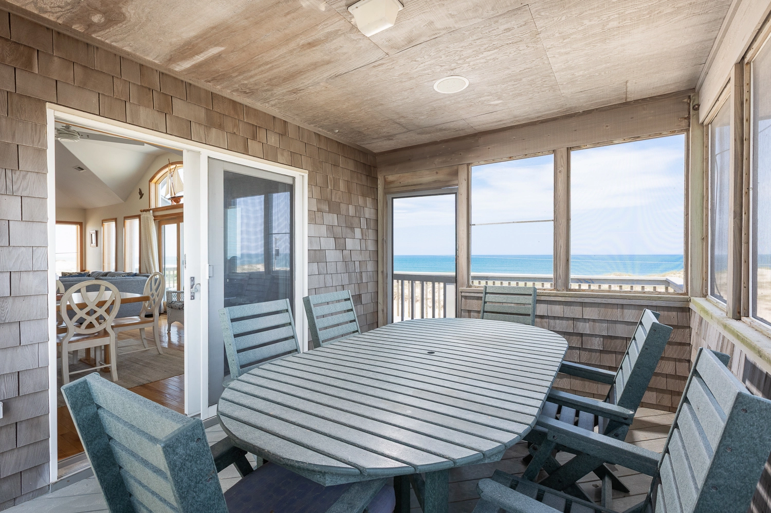 Great room; kitchen; dining area; screened porch; open sun decks facing the ocean and sound.