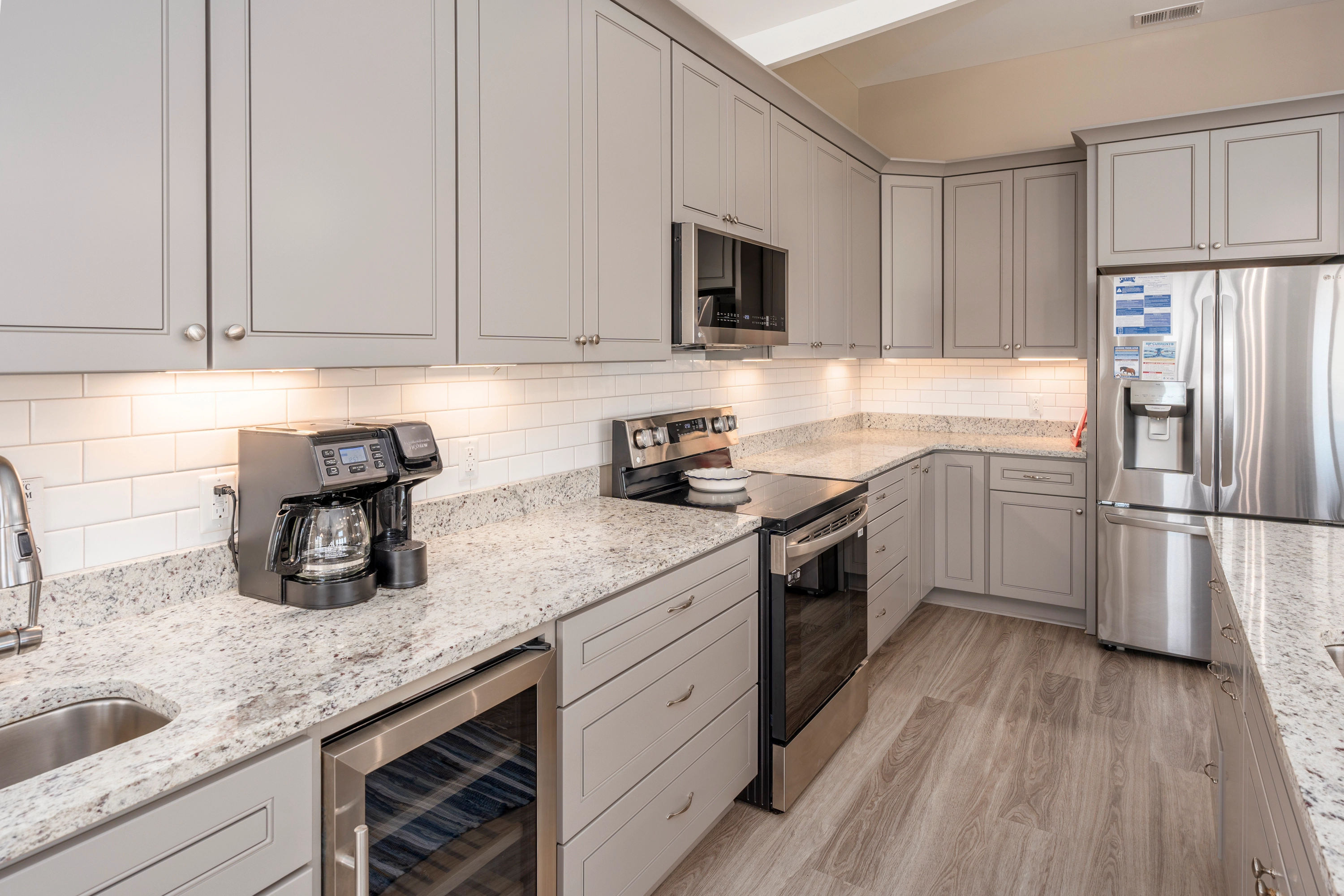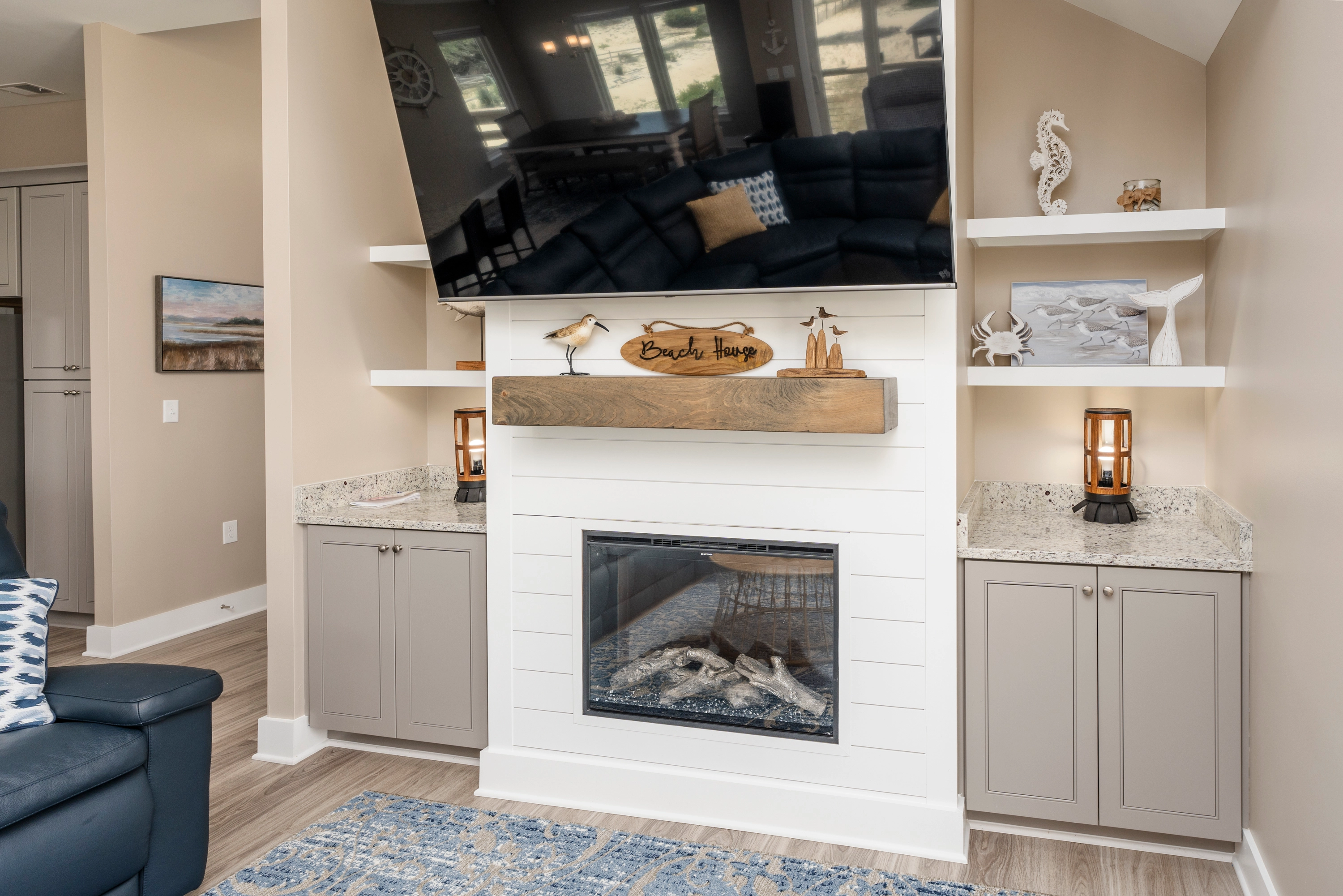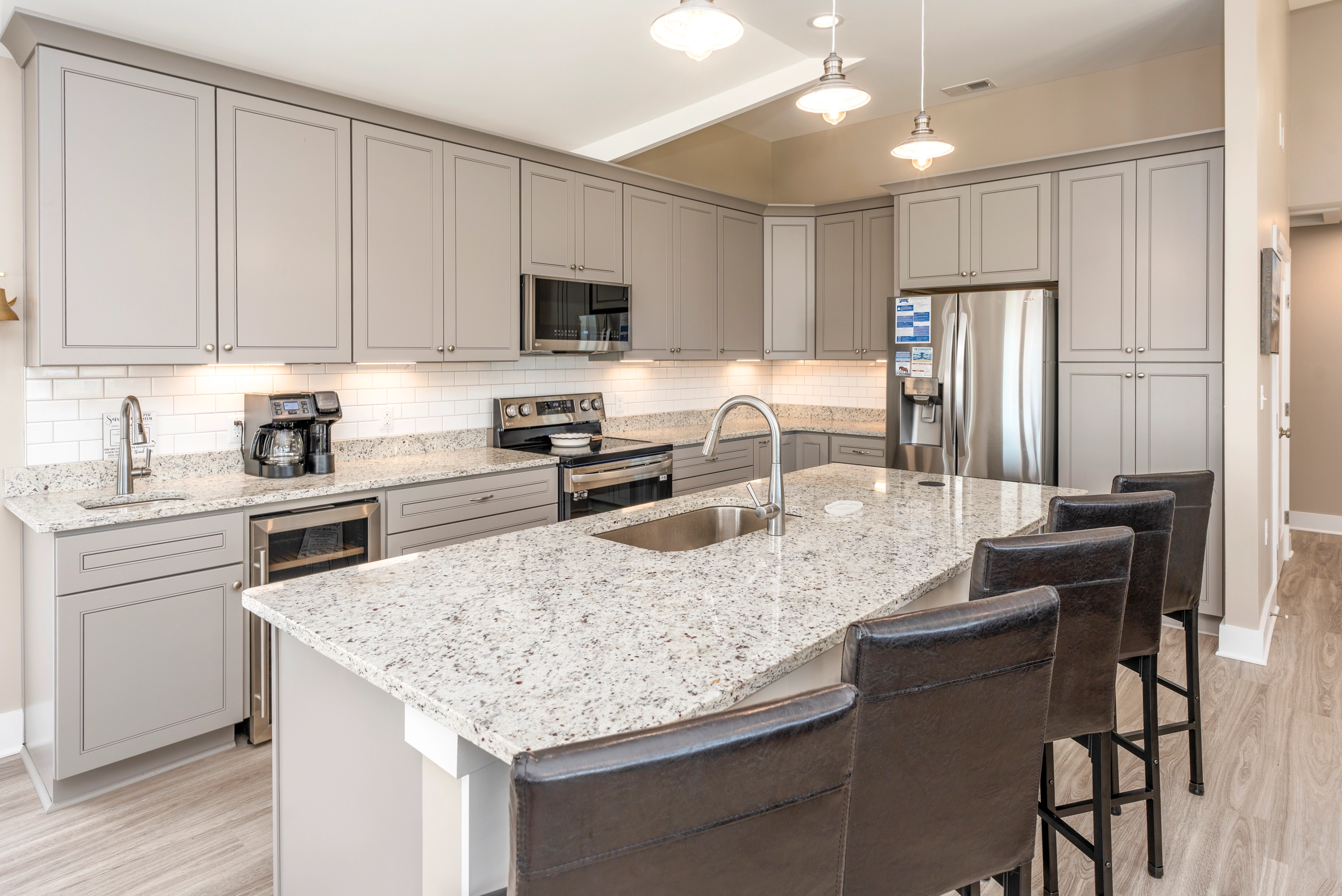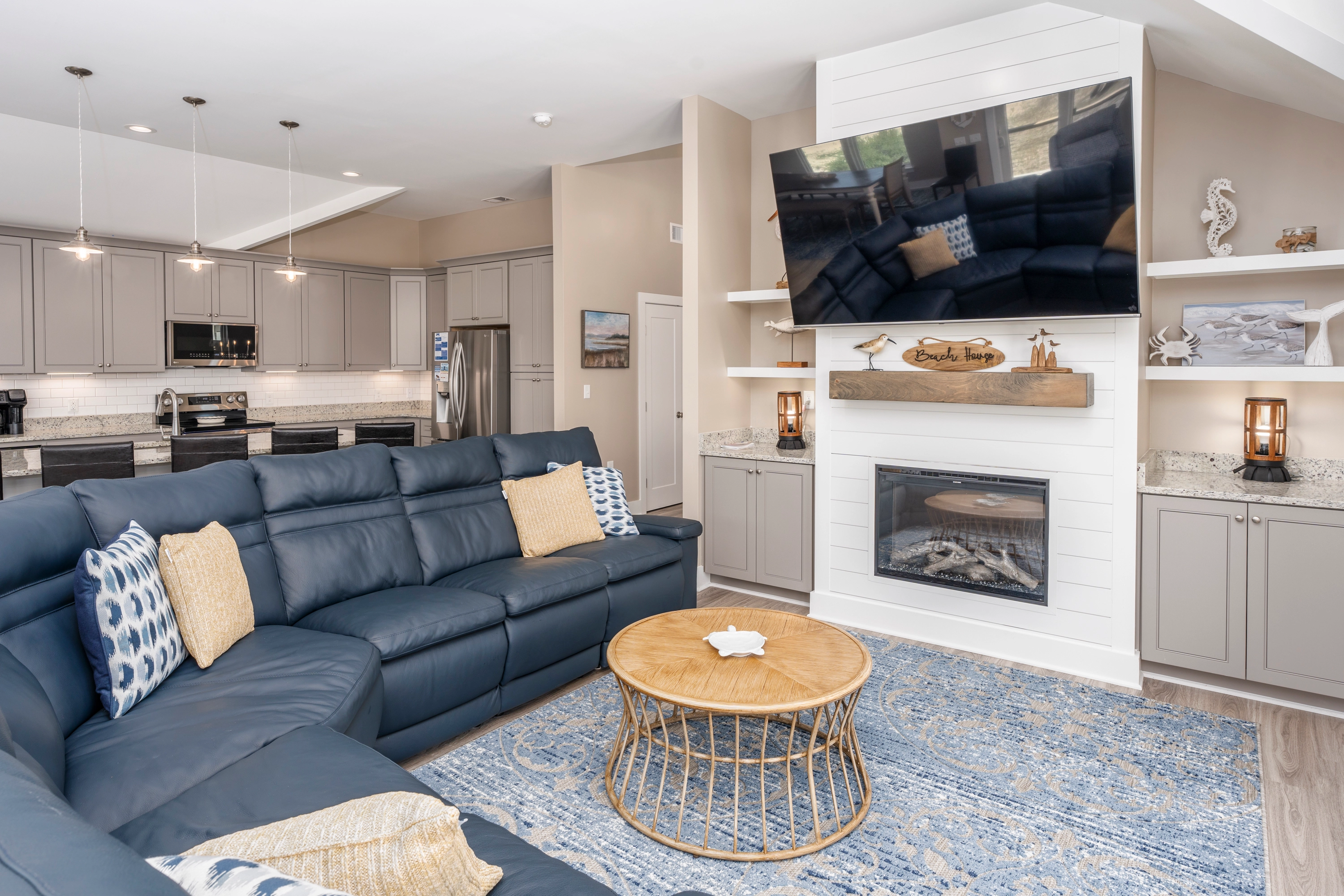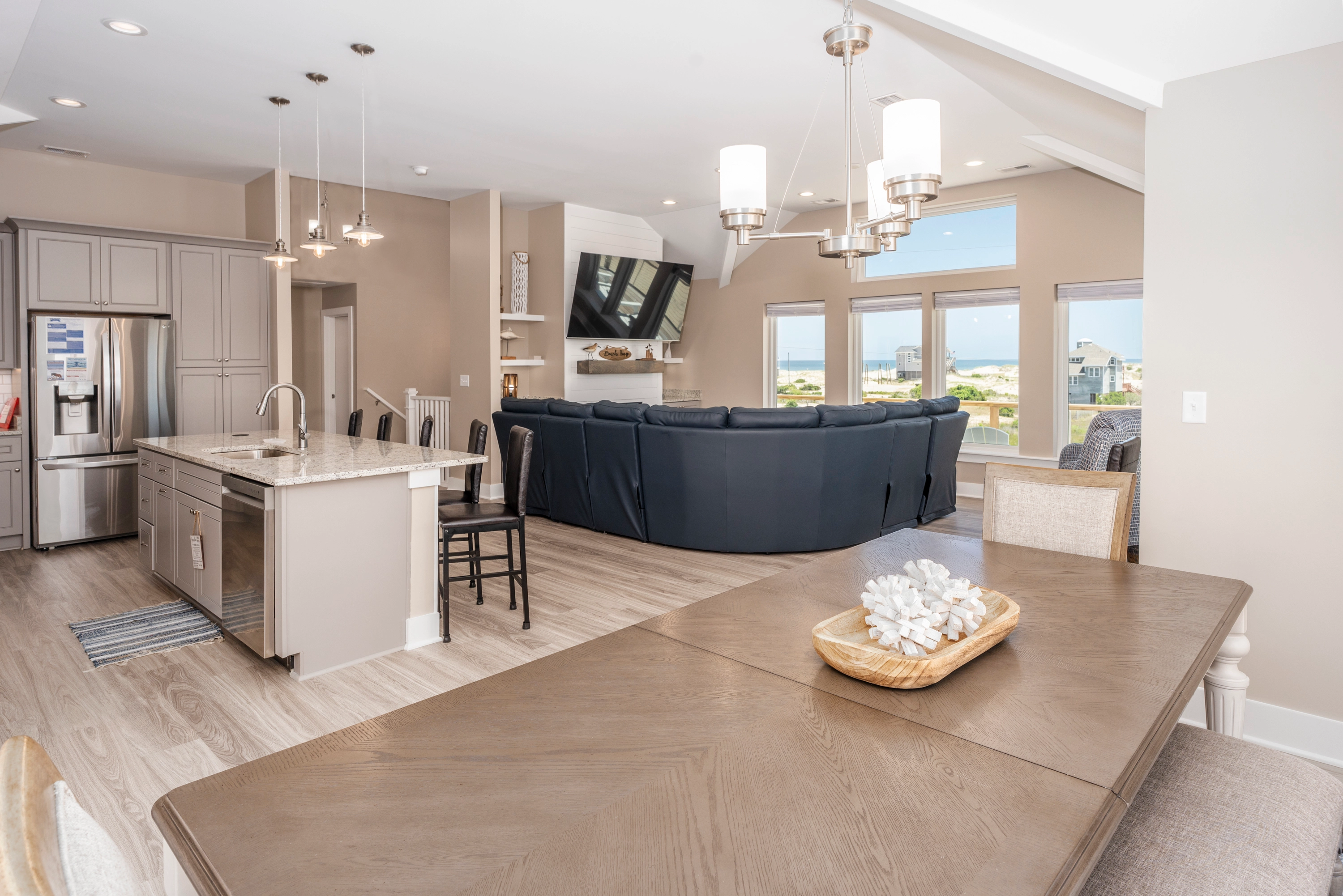Great room with gas fireplace; kitchen with additional prep sink and wine refrigerator; dining area; screened porch.