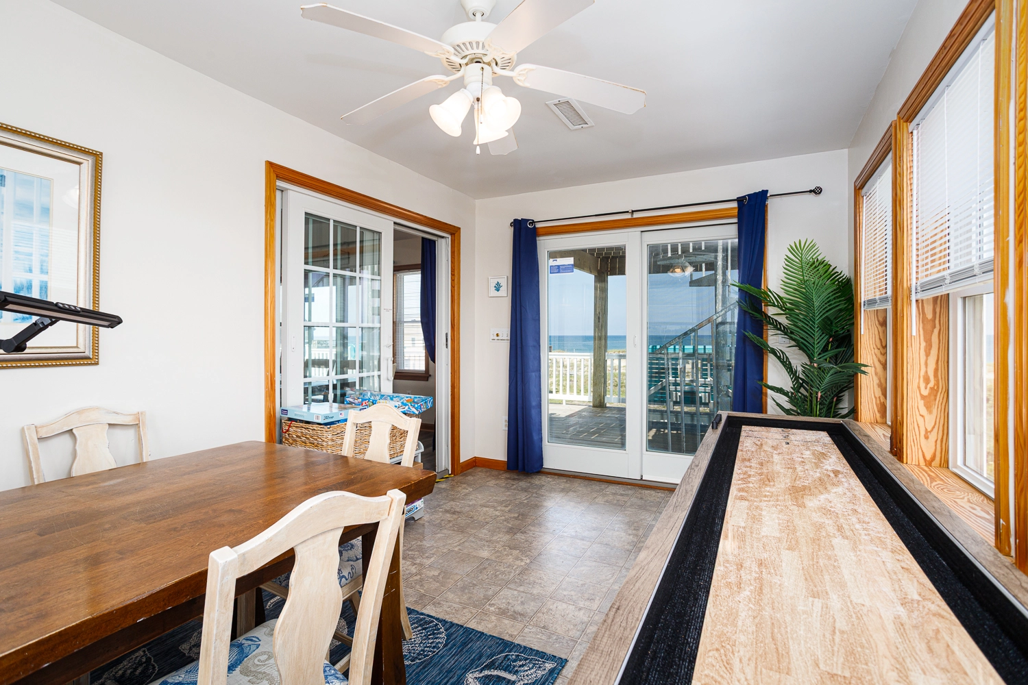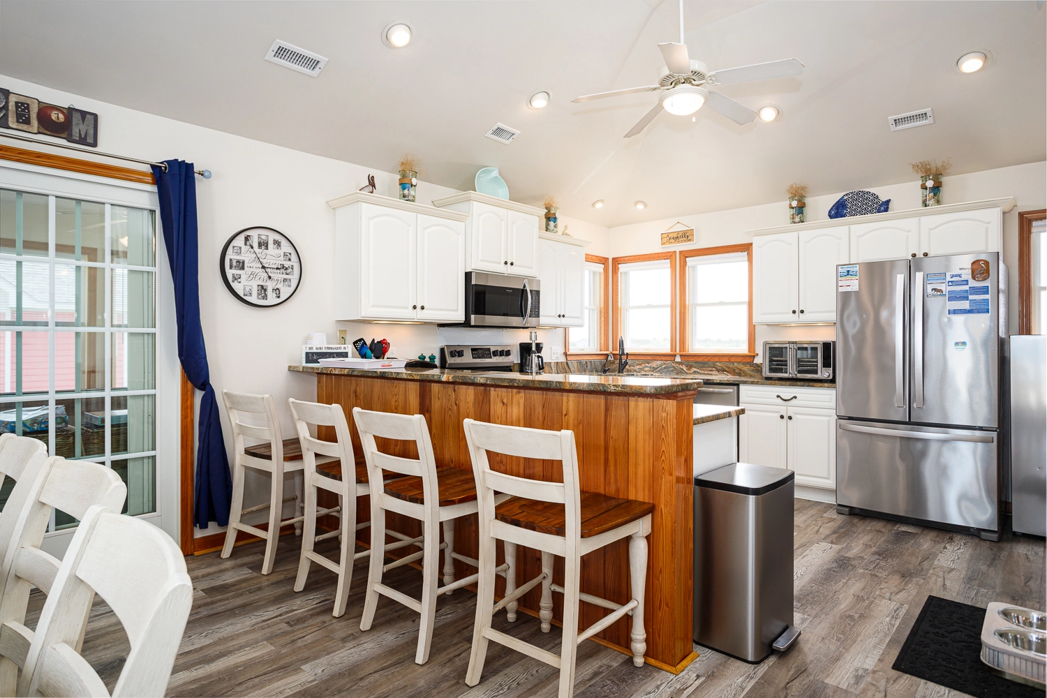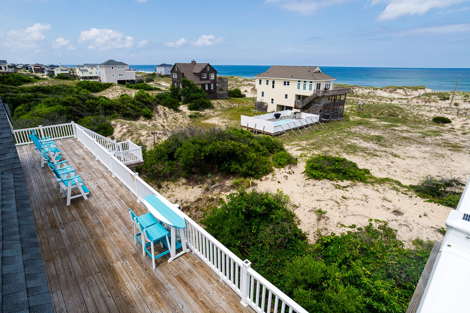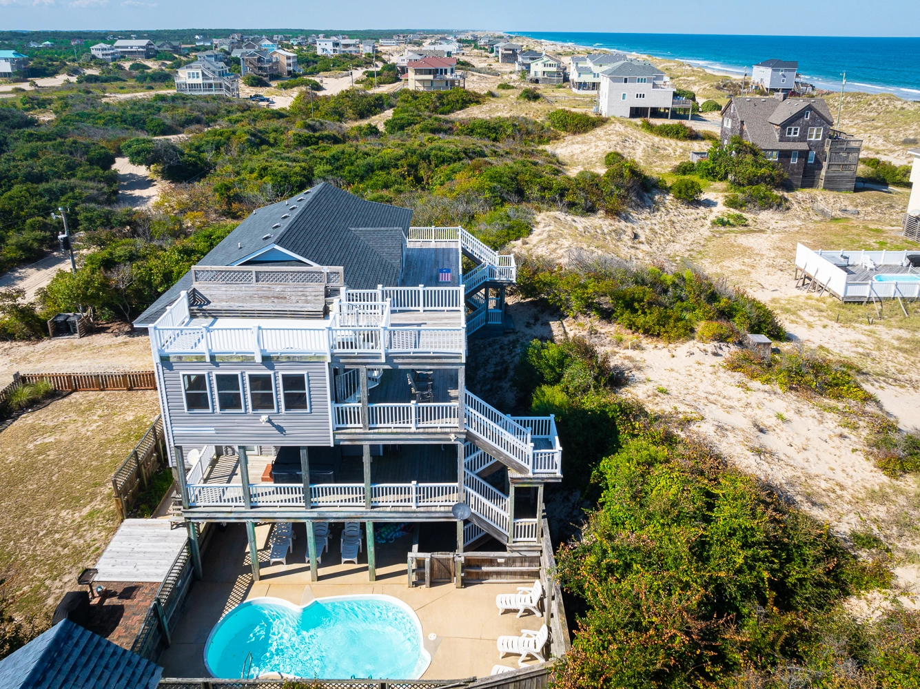 "I hope this review of Windermere makes it to the website. I don't believe we saw any reviews before we rented and this house deserves a review. It was recently renovated and everything is top shelf. The pool / tiki bar area was amazing - outdoor ping pong was a big hit and having a bar area was also much appreciated. All of the outside furniture is brand new and extremely comfortable. Beds are good as well, unlike many of the homes we've rented in the past. Inside, the shuffleboard table got the most use and was a blast. The kitchen had everything we needed and the 2nd fridge was a big help as well. Ice is the only issue...the icemaker wasn't producing ice and, even if it was, it wouldn't be nearly enough. So make sure to bring good coolers that can store ice and pick it up before you go to the house The views were amazing - it was a short walk to the beach, but next year we're going to bring a Jeep so that we can take it on the beach every day. We drove our Honda Pilot and it was a bit dicey on the beach...we drug the bumper a bit but as long as you go slow, you get along fine. On the first night, we had 10 wild horses wandering near the house (but didn't see many after that). It is extremely secluded...no stores, no noise, no lights at night. All you hear is the waves hitting the shore. The star gazing was incredible. If you enjoy looking at the stars, pack some aluminum foil. The owner put solar powered led lights on every deck post. The top deck was so nice for viewing, but at night it felt like you were on stage! To make it dark, I simply put foil over the top of each post to block the solar panel and after the first night, you could see everything in the sky. I hope this review is helpful. We've been coming to OBX for many years and have stayed in every area from north to south. This was the most enjoyable vacation ever. But we had all adults on this trip. If you have small children that need more entertainment than a pool, beach and hot tub can provide, you may be better in another area. If you want an amazing home with peace and quiet, this is the place for you."