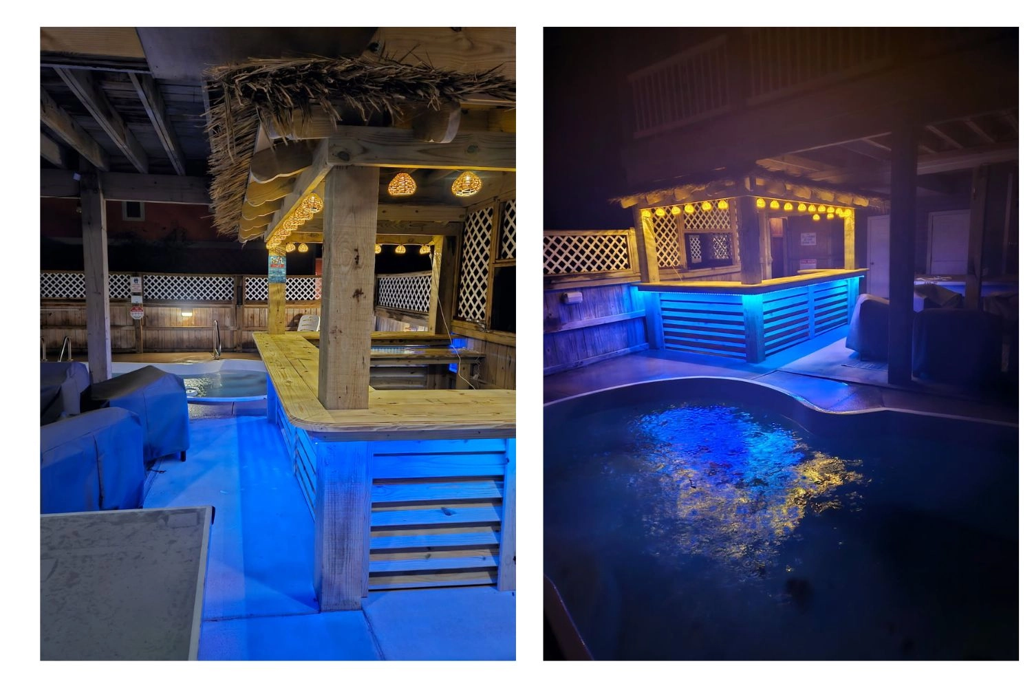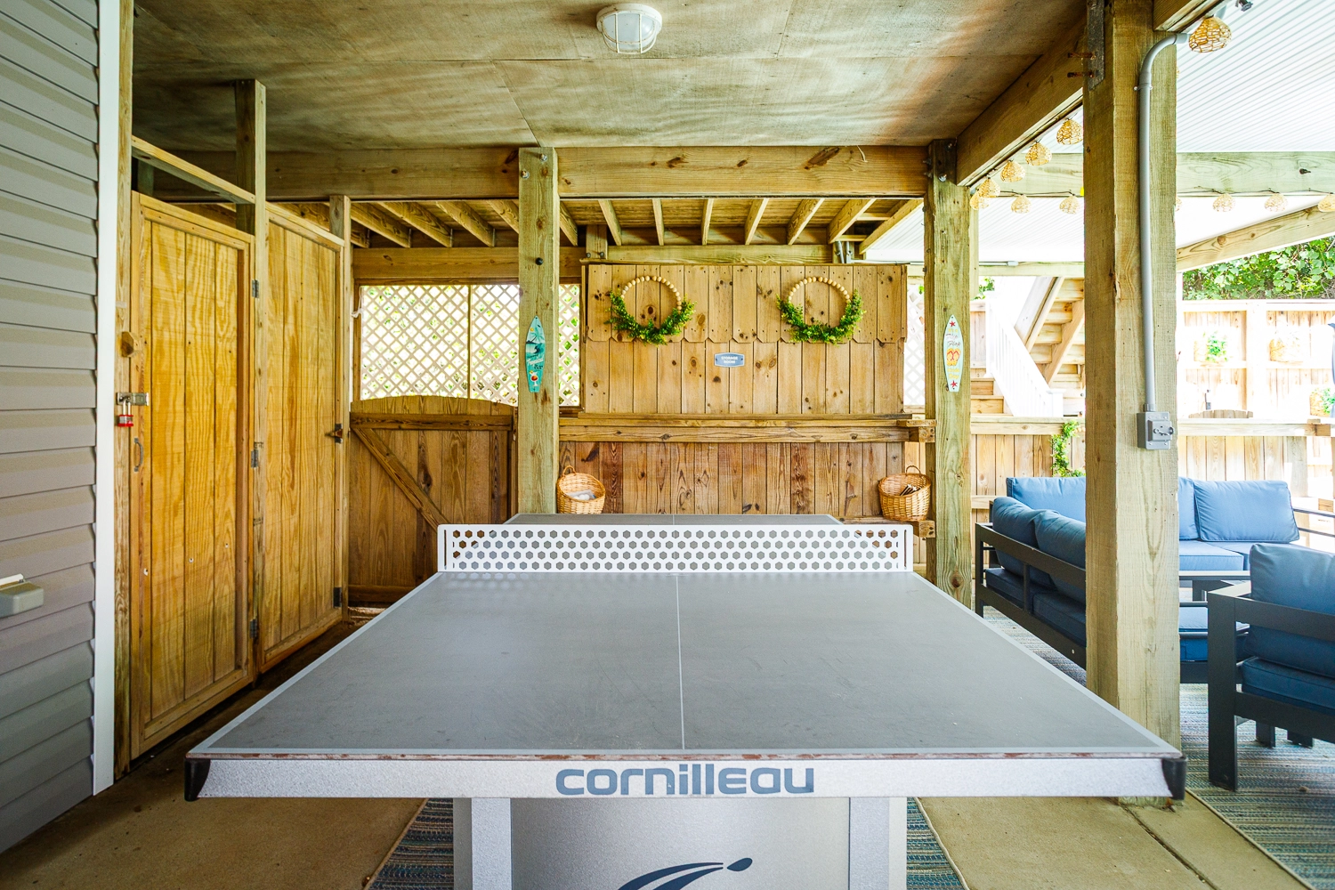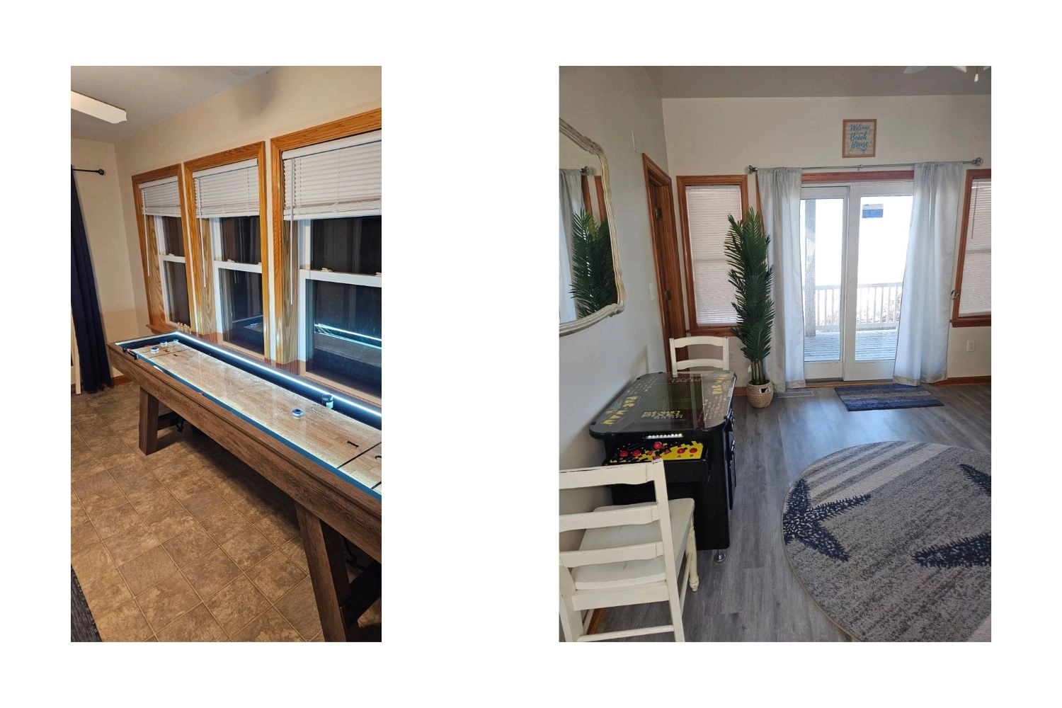 Arcade game; covered decks with hot tub.