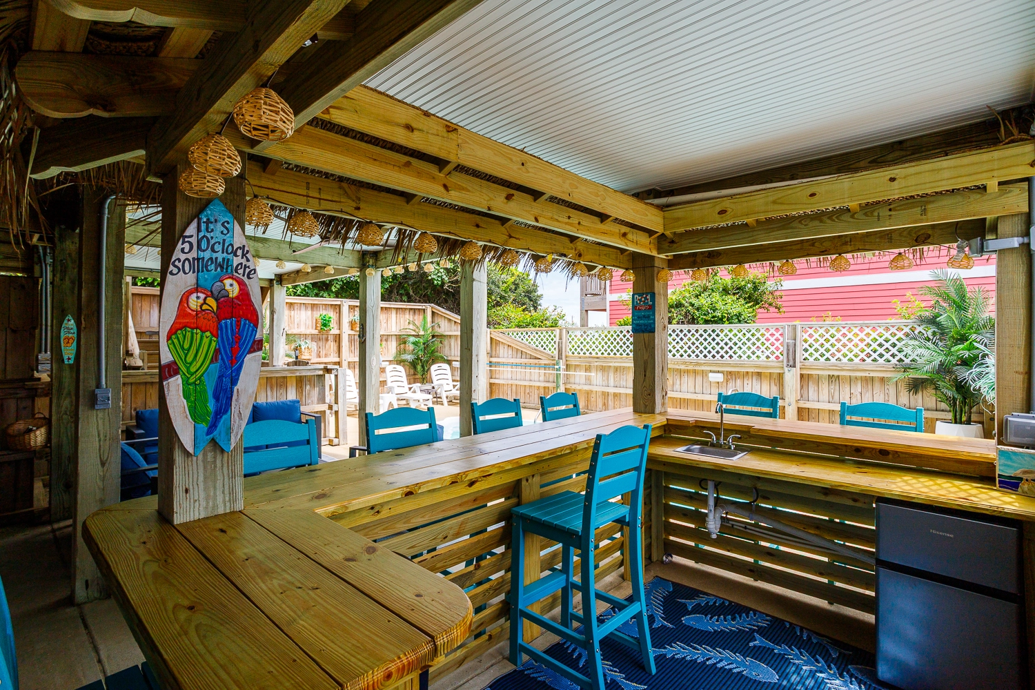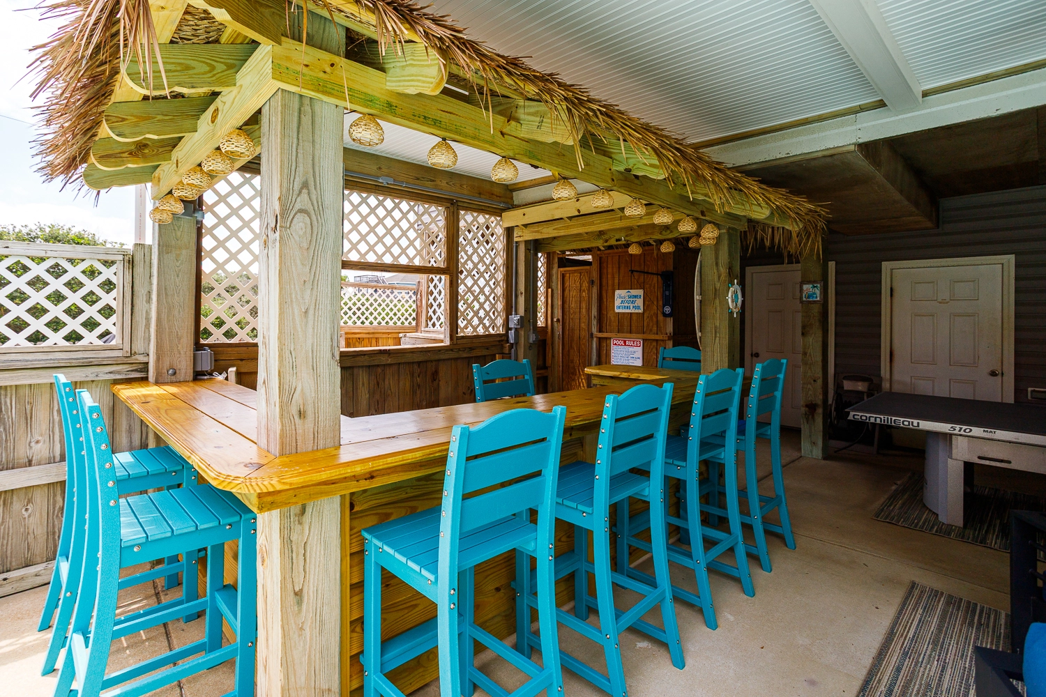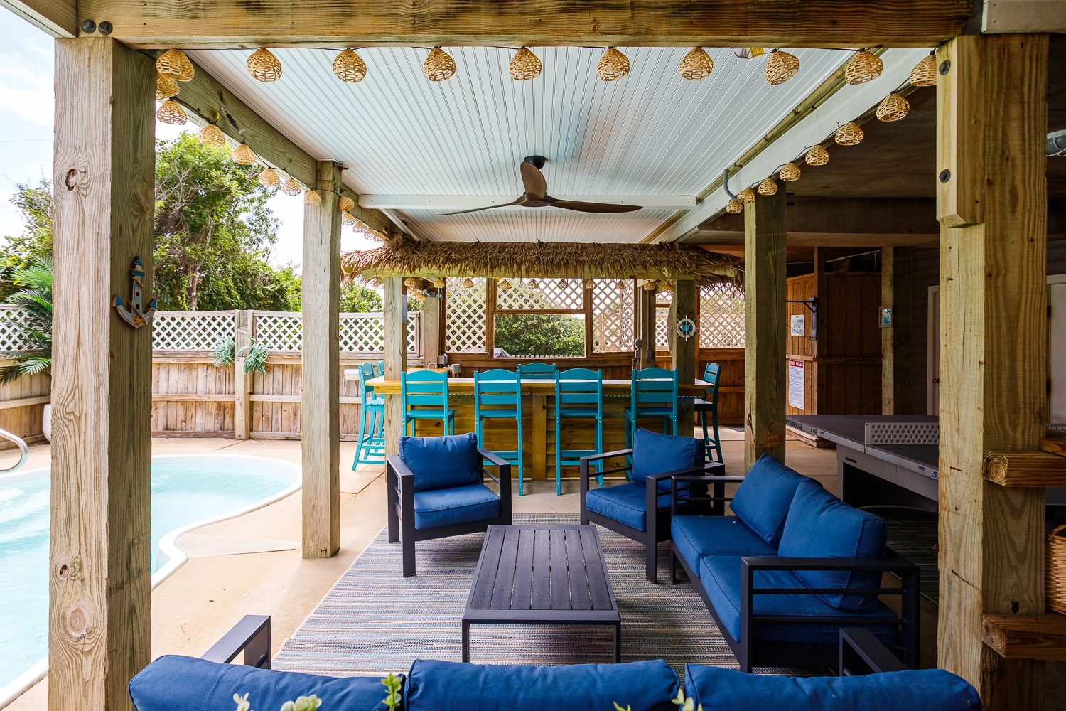 Rec room with air hockey and wet bar; theater room; laundry; outdoor ping pong table; gated pool area with Tiki bar.