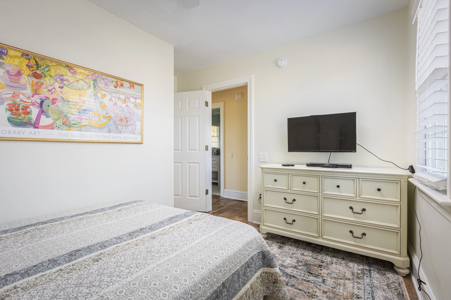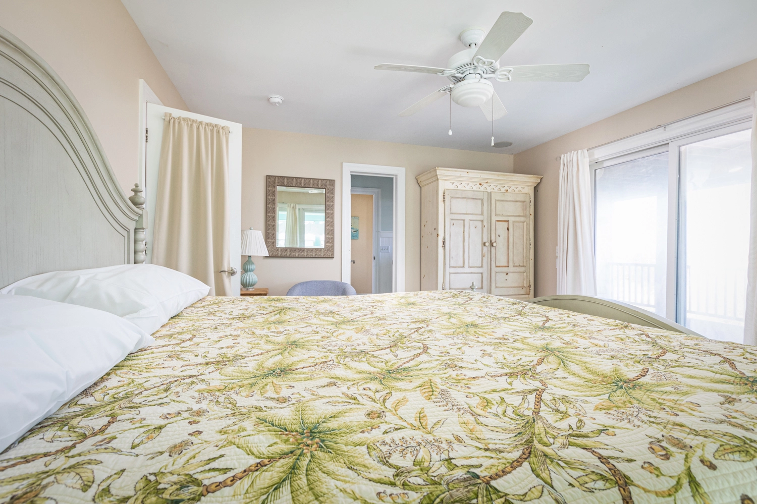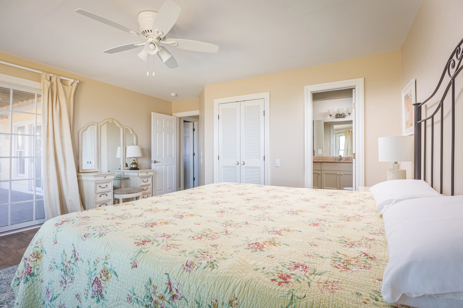 Queen, Semi-private bath, Standing shower, Deck access