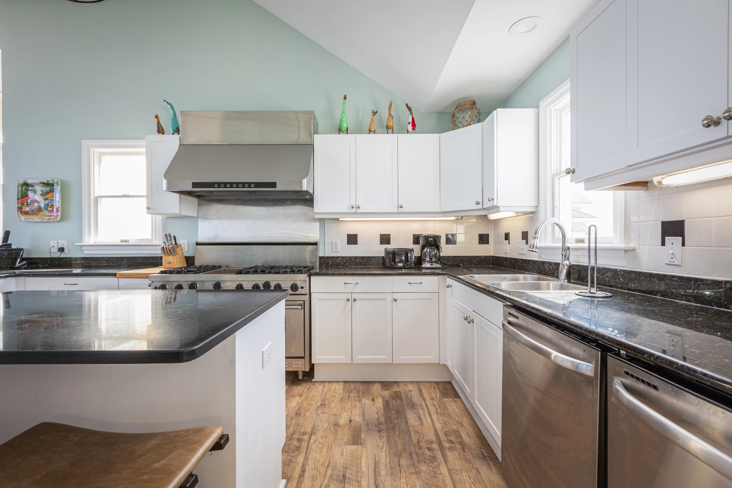 Great room with gas fireplace; Kitchen with six-burner gas stove and two dishwashers; Dining area