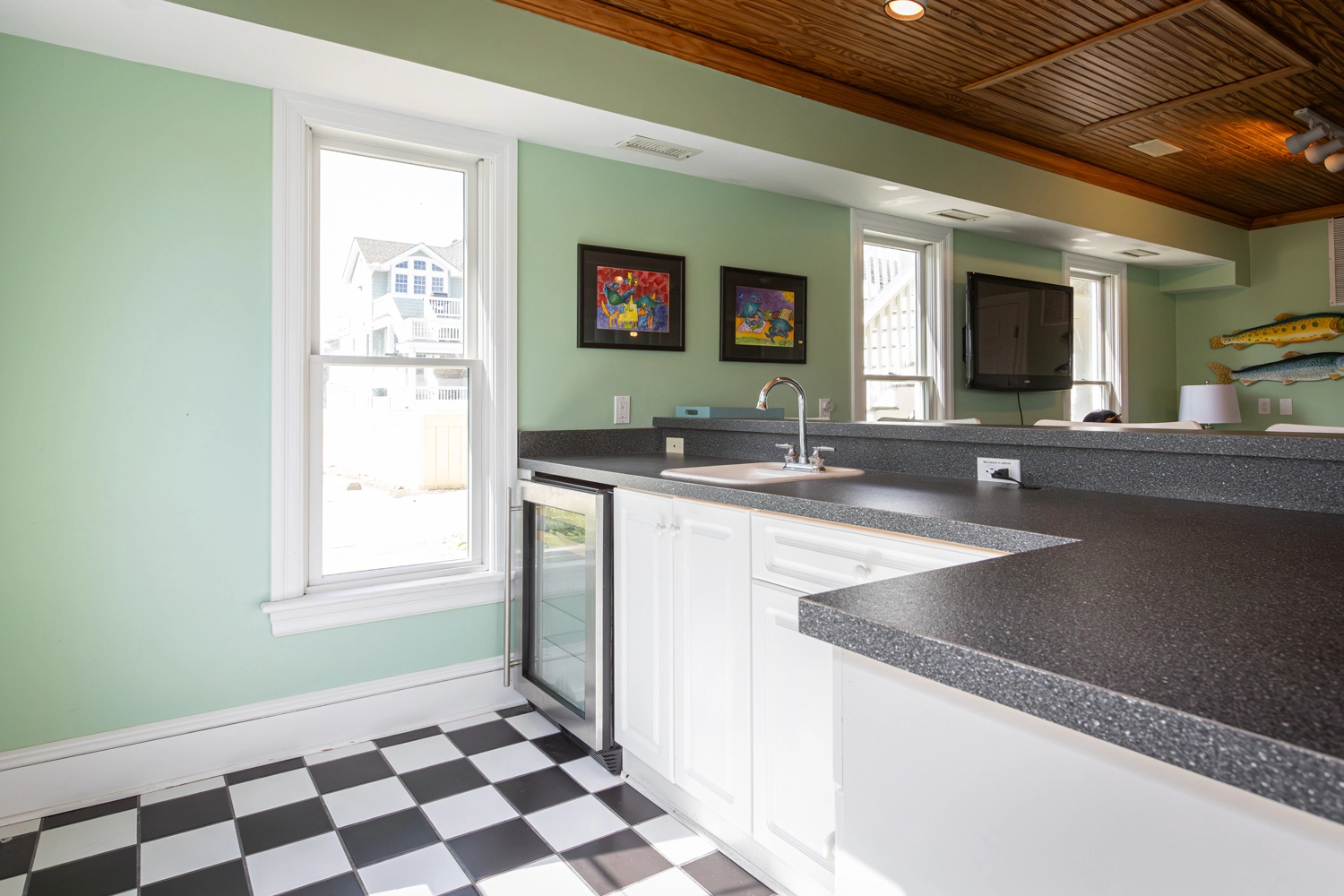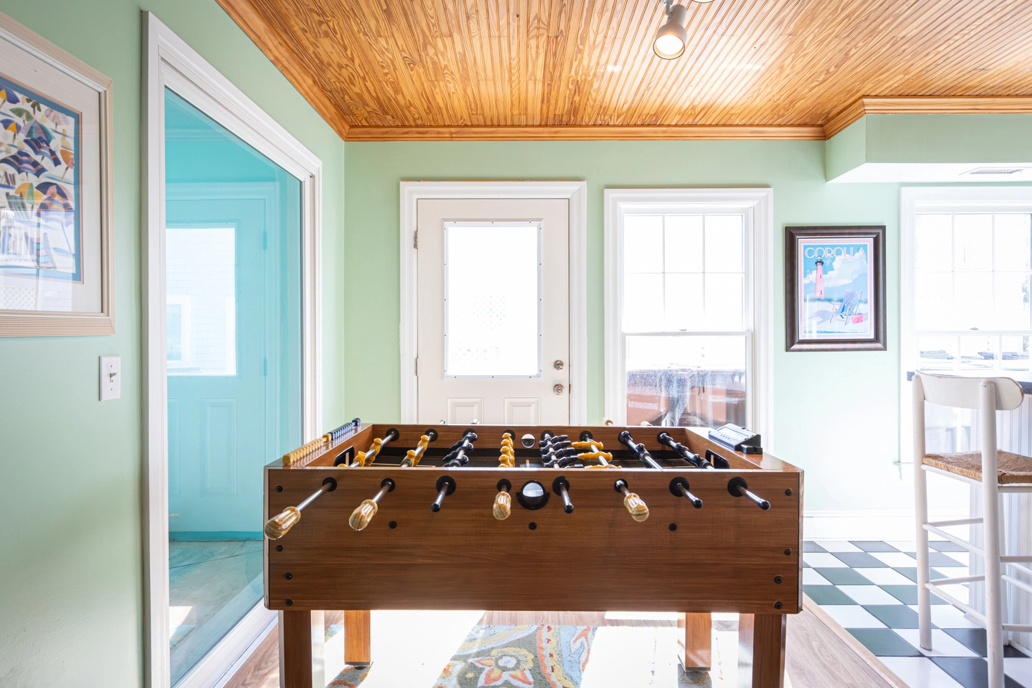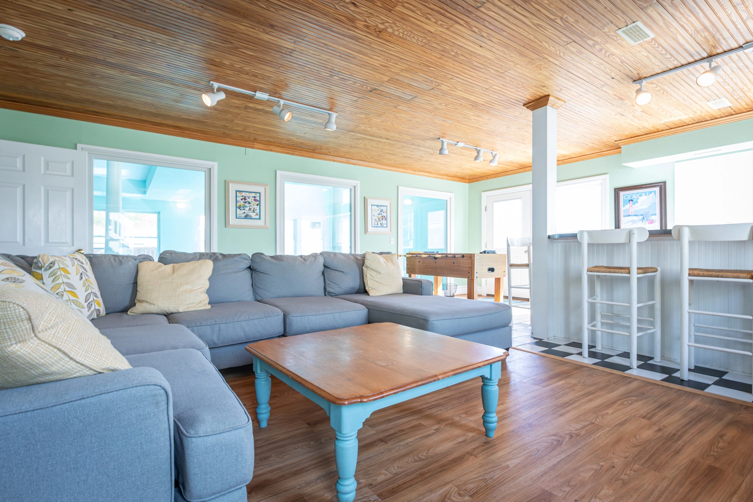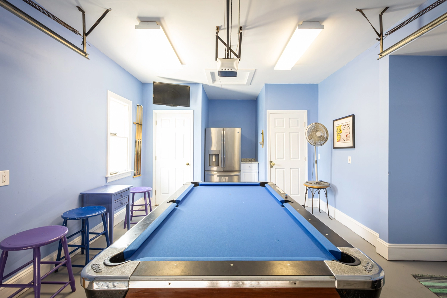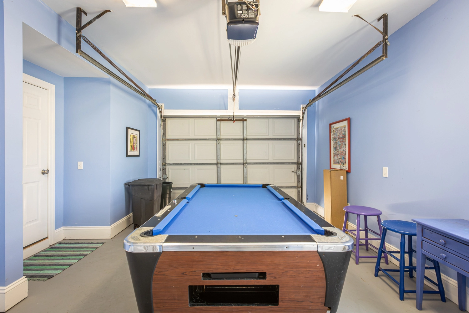 Den with pool table and refrigerator; garage rec room with foosball and bar with beverage refrigerator; laundry.