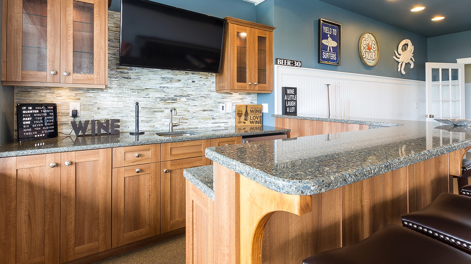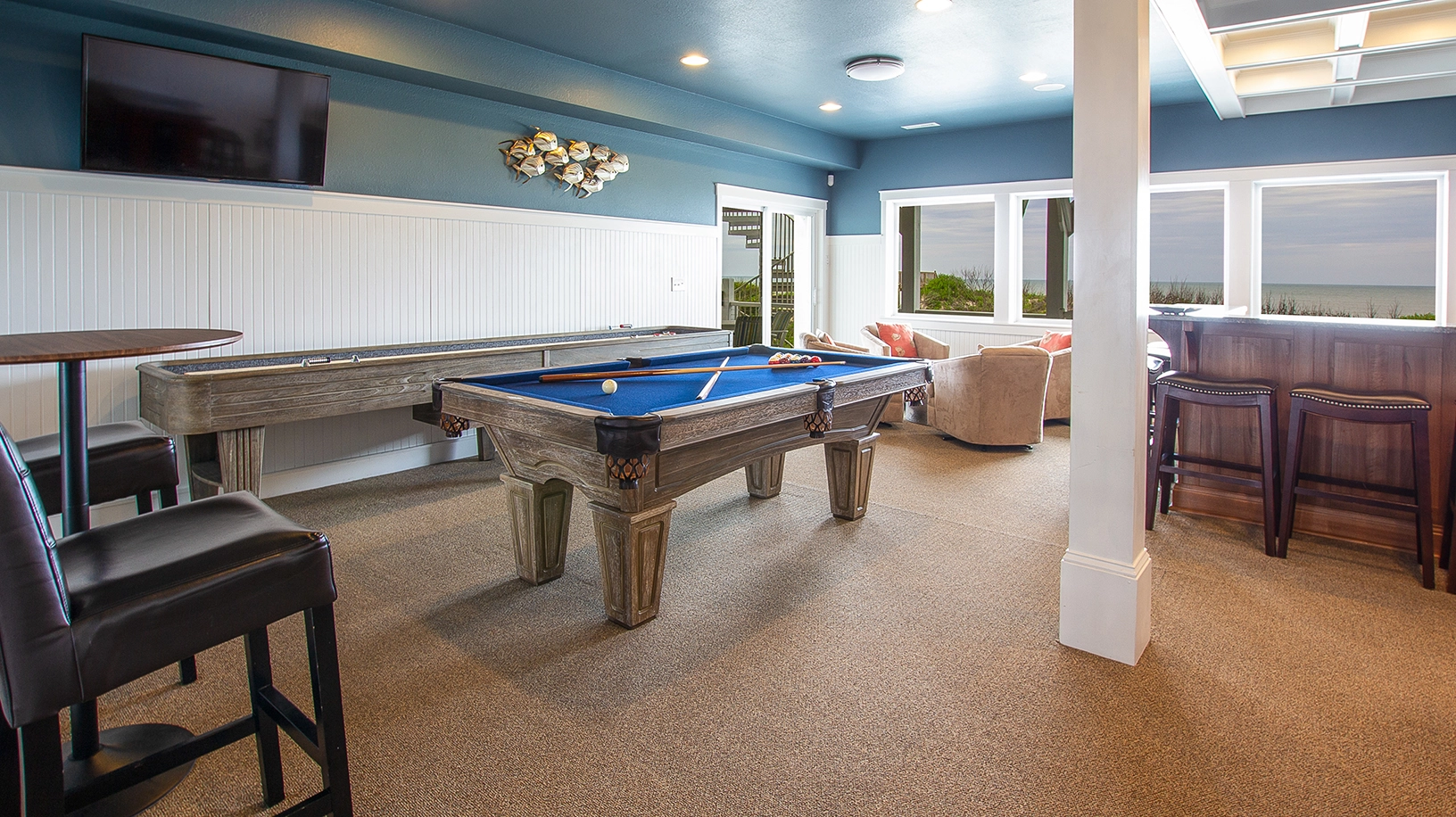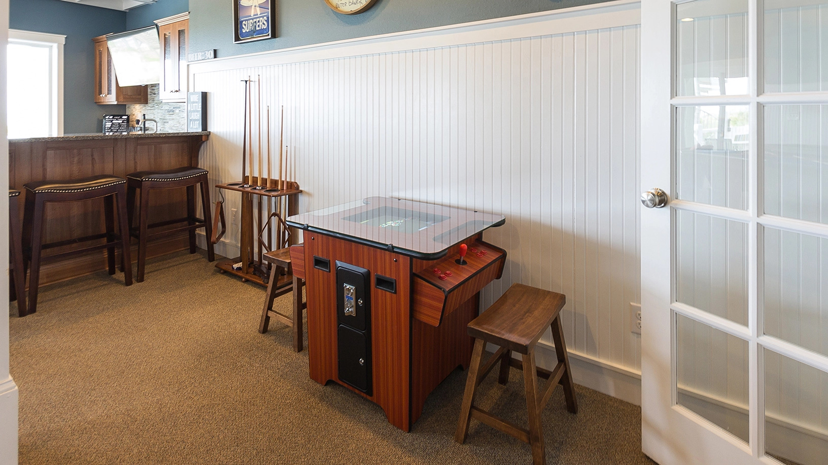 Rec room with sports bar, pool table, 12 foot shuffleboard and classic arcade game table.