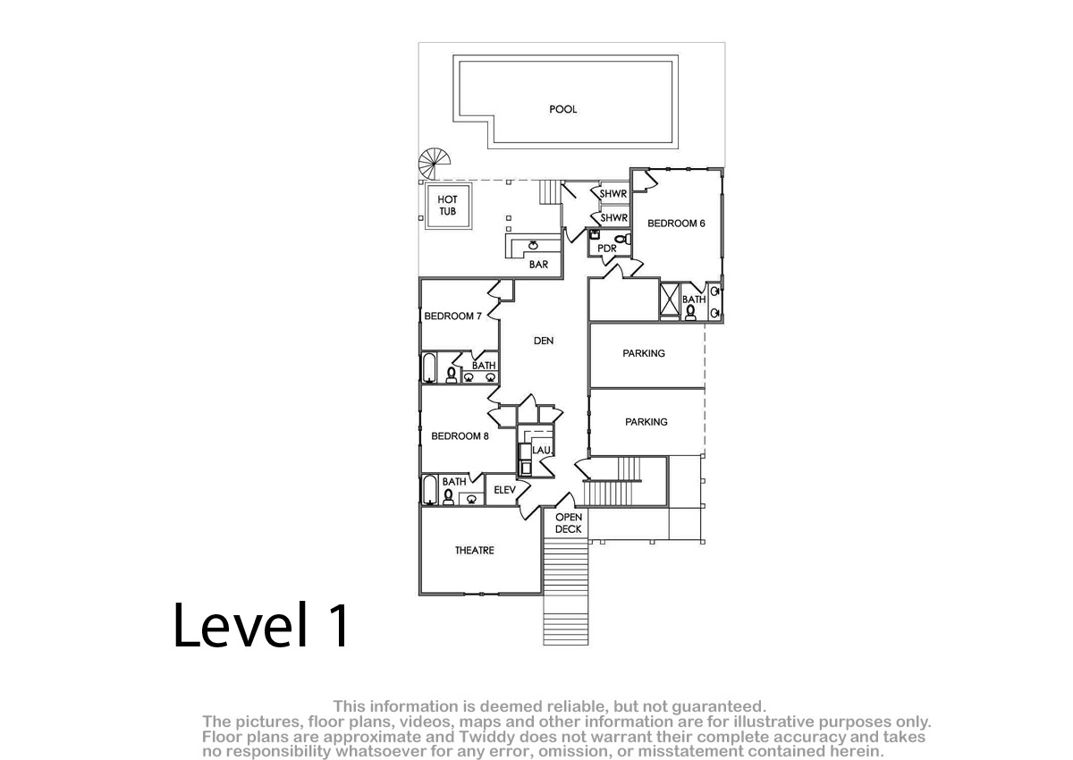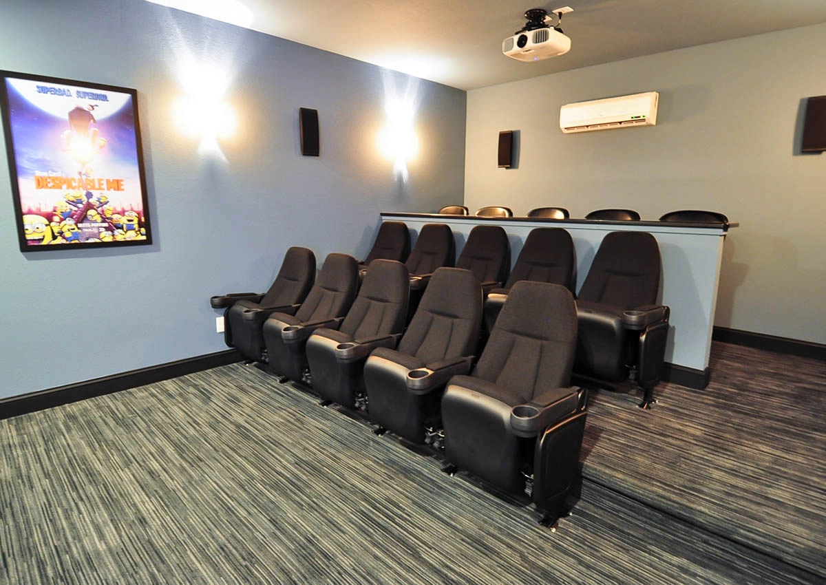 Den with wet bar, microwave and full-size refrigerator that are accessible to pool area; theater room with seating for 15; laundry with two washers and two dryers.
