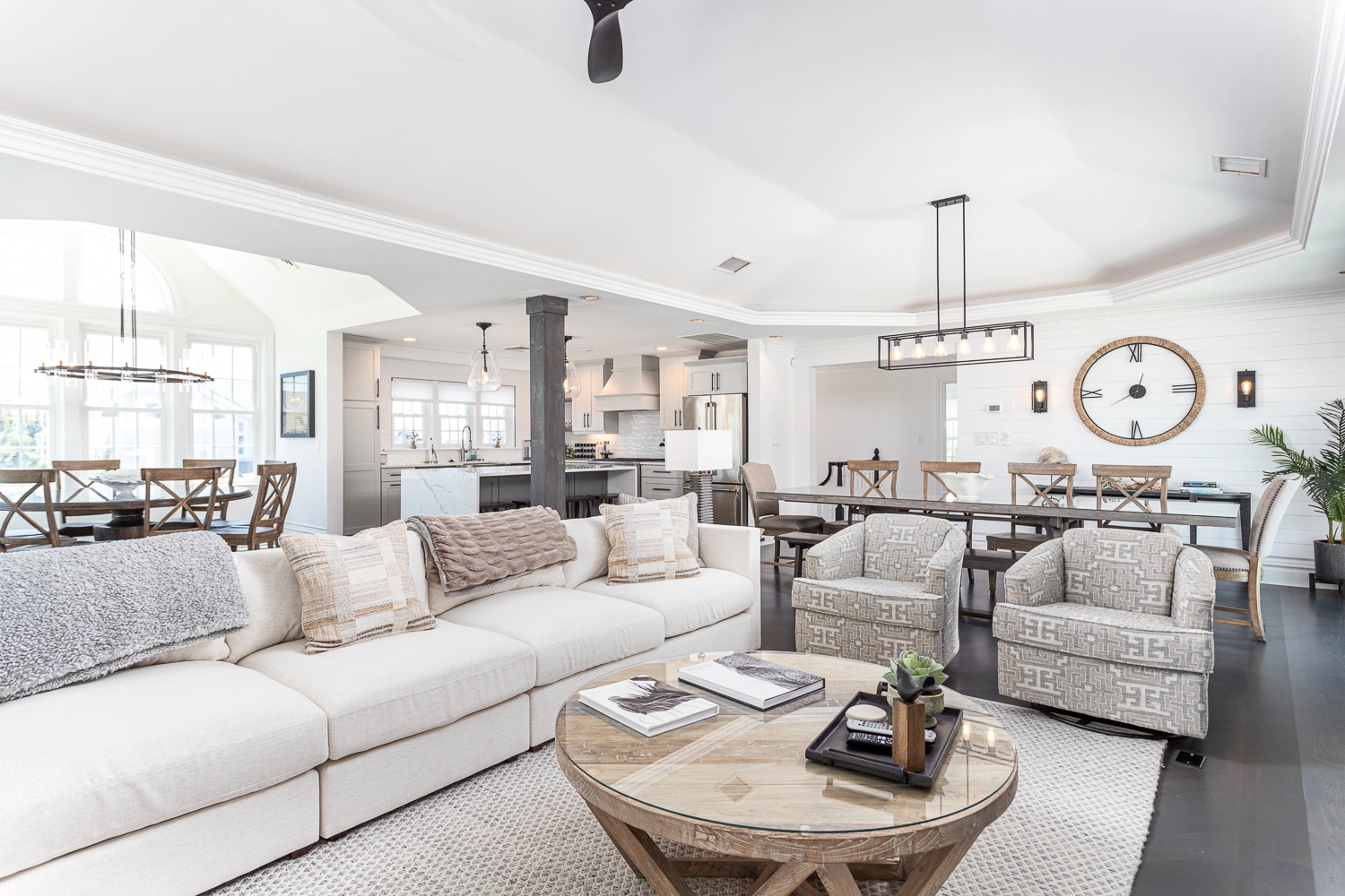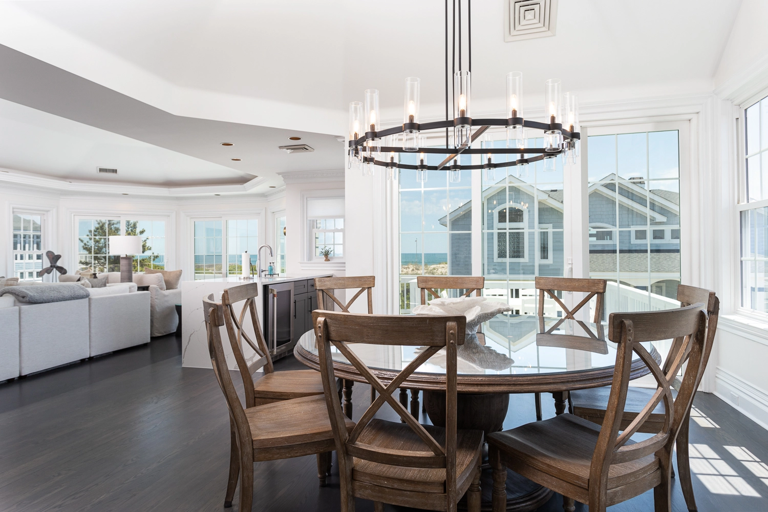 Great room with ocean views; kitchen; two dining areas and seating at the kitchen bar; wet bar with seating.