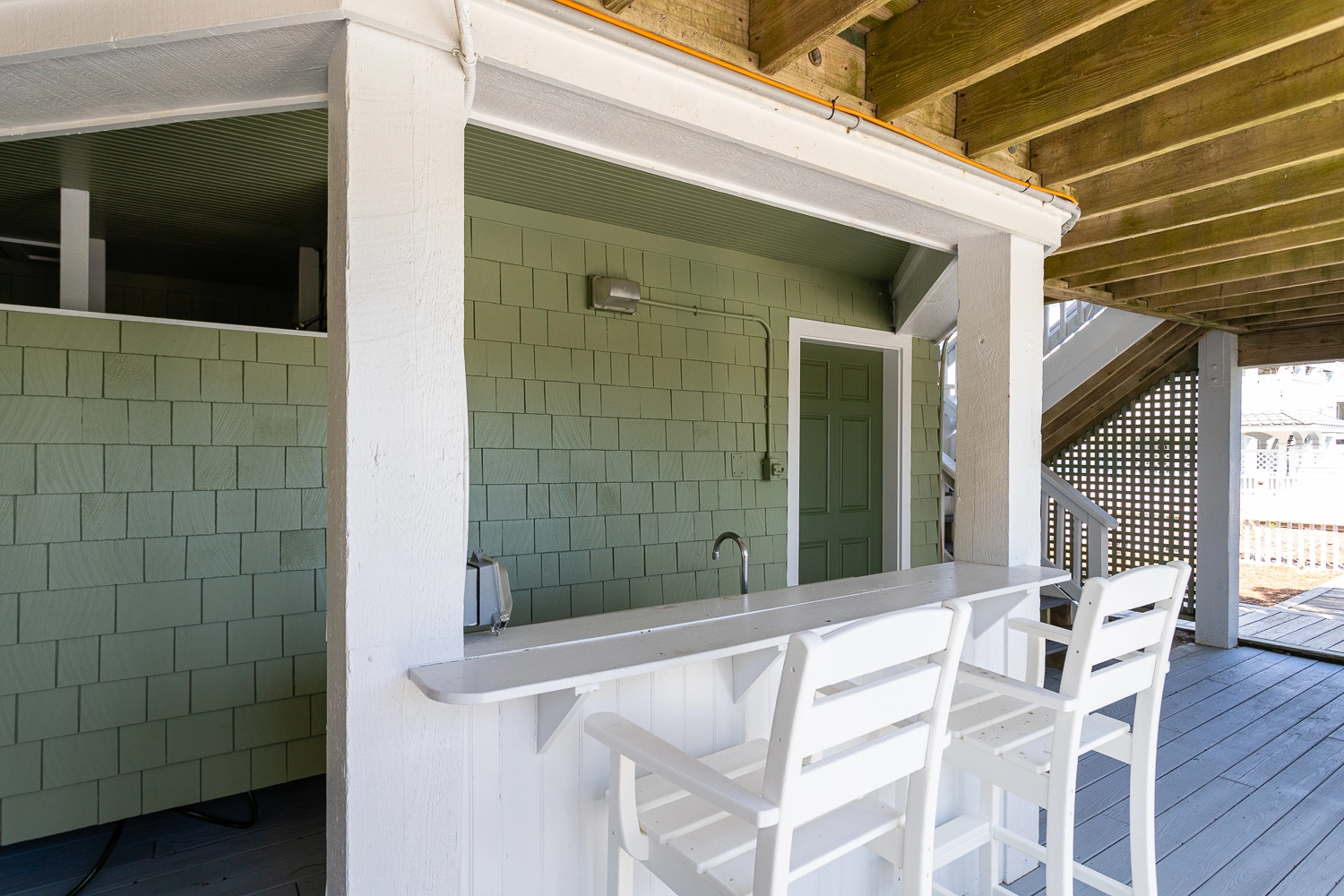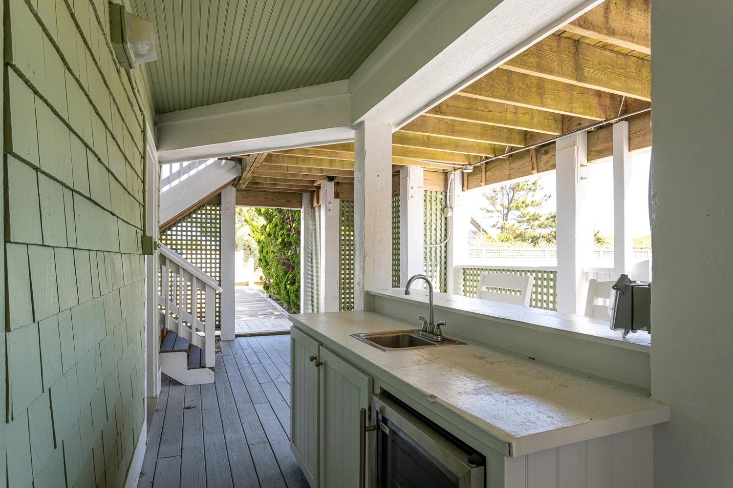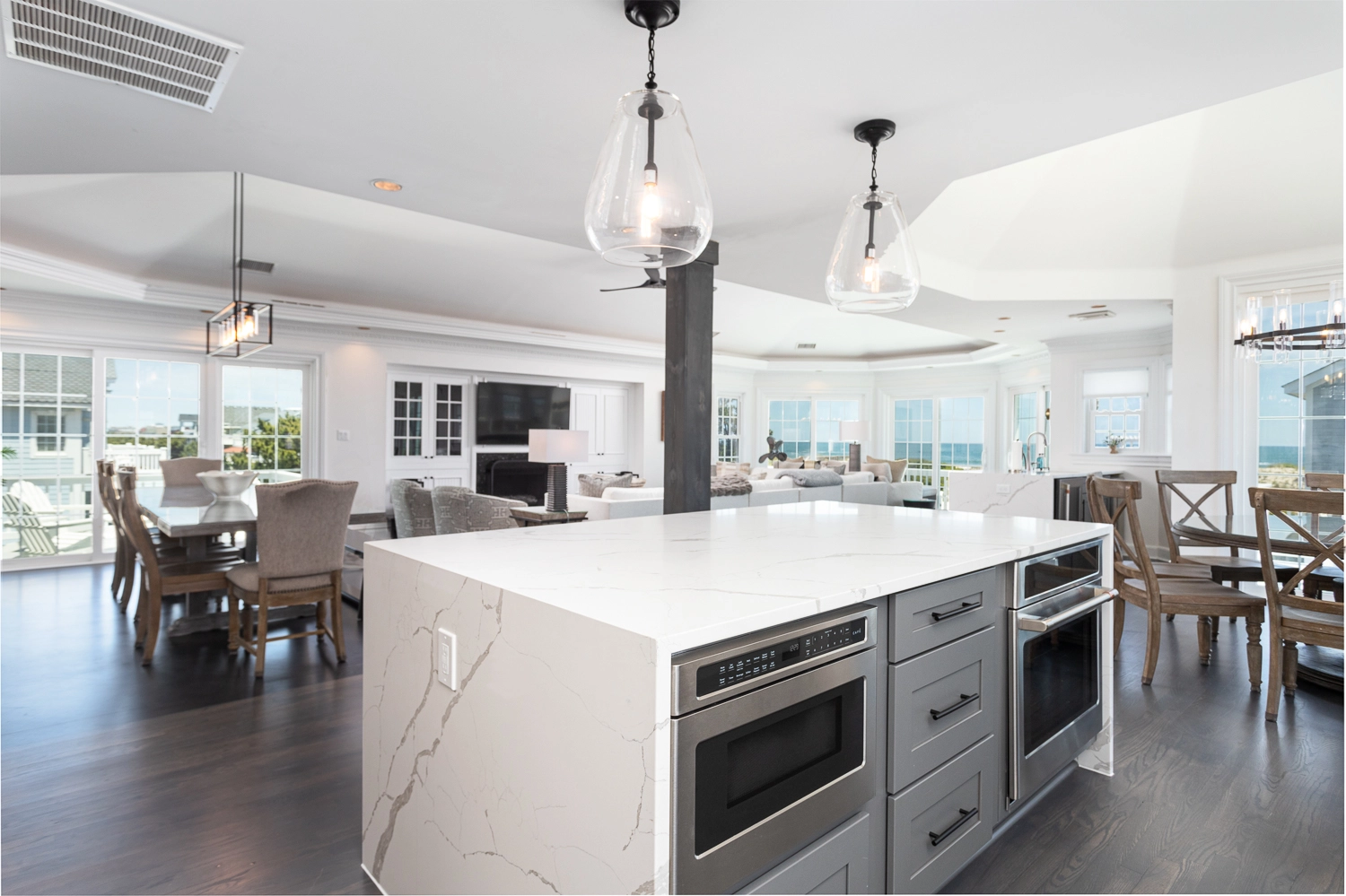 "The home's great room area is lovely and our favorite spot. The new furniture and light fixtures give is a fresh look for sure. The den off the main master is very nice as well. We love the couch looking out to the ocean. The kitchen is well stocked. The kitchen is a little squishy with the island in the middle. The outdoor grill was nice. two things we did not like. one -- in the master bathrooms you can't close the door to the bathroom area so someone can take a shower while others are in the bedroom. Two- you don't have a door from the driveway to the basement which is not helpful for handicap folks.....the elevator is a plus for handicaps but you have to walk around the house to get in verses using the front stairs."