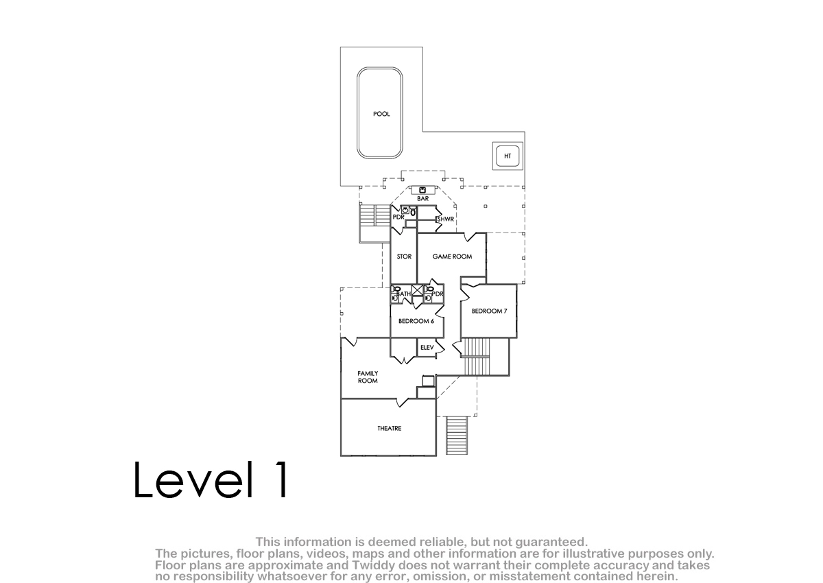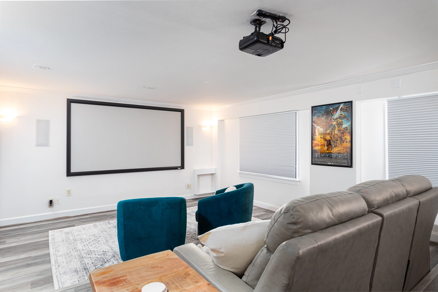 Theater room with tiered seating; rec room with pool table; access to pool area with covered wet bar, outside half bathroom, and outside showers; hot tub.
