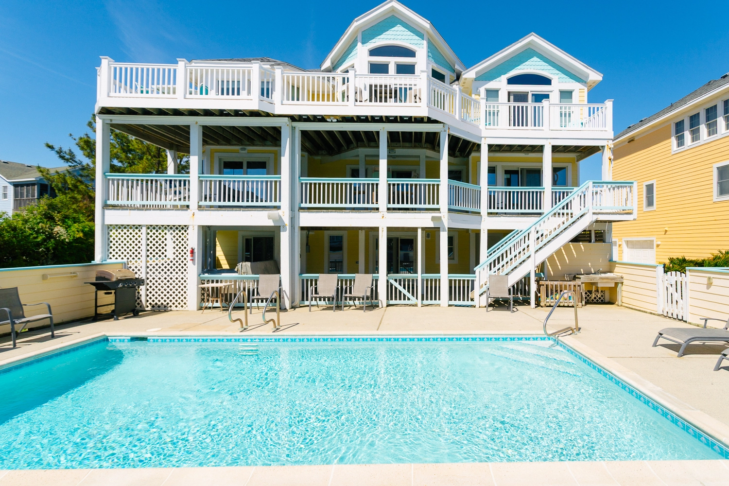 "Updated bathrooms, soaking tub, large hot tub, nice pool that is a nice shape compared other homes having a hour glass shaped pool. Two fridges and dishwashers. Very nice upper deck that keeps lower decks dry. Easy and close stroll to the beach."
