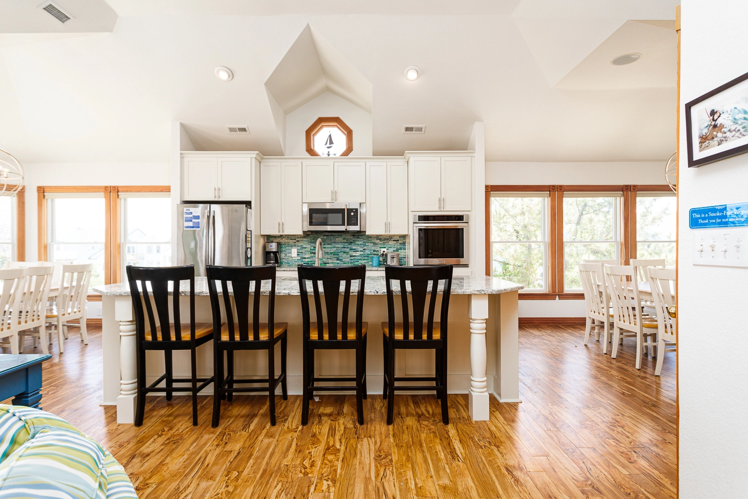 Great room; kitchen with two dishwashers; dining area; loft with desk; screened porch.