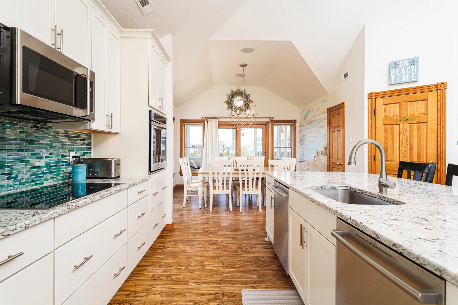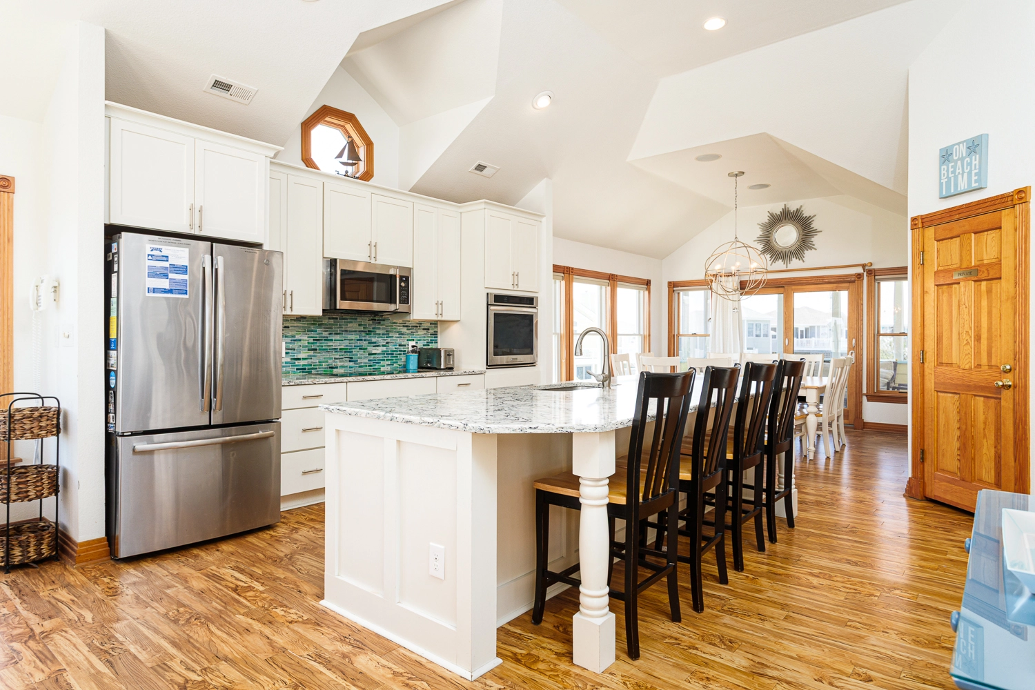 "The ahort walk to the beach and the large kitchen."
