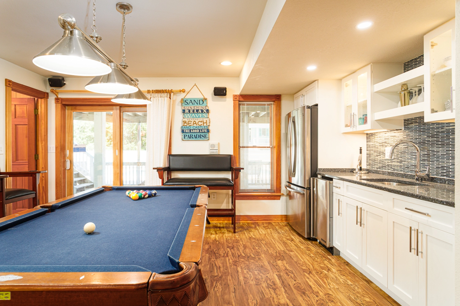 Rec room with pool table, full-size refrigerator and microwave; laundry; private pool and hot tub.