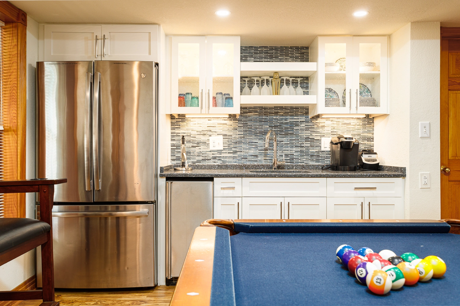 Rec room with pool table, full-size refrigerator, dishwasher and microwave; laundry; private pool and hot tub.
