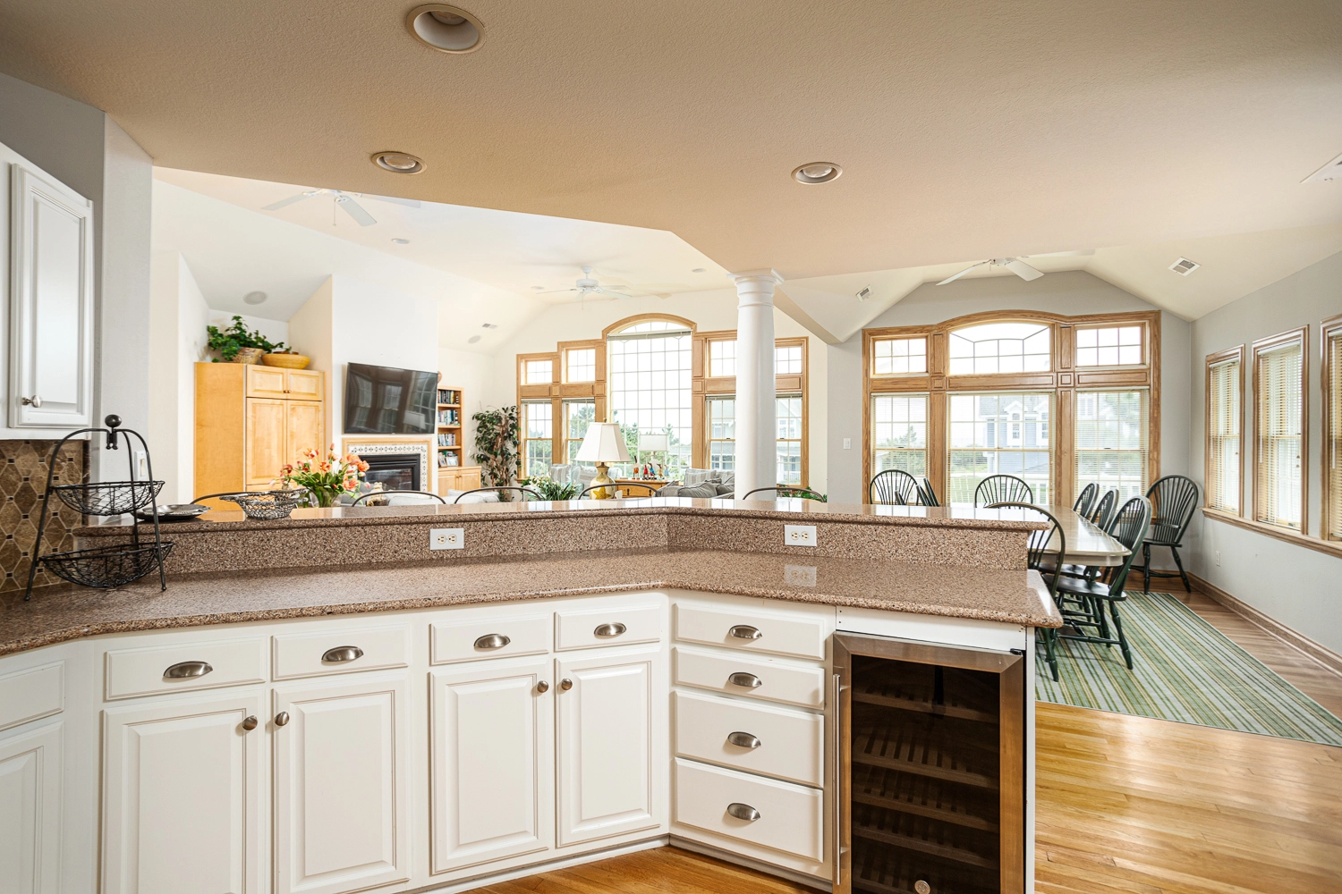 Great room with gas fireplace; kitchen; dining area; screened porch.