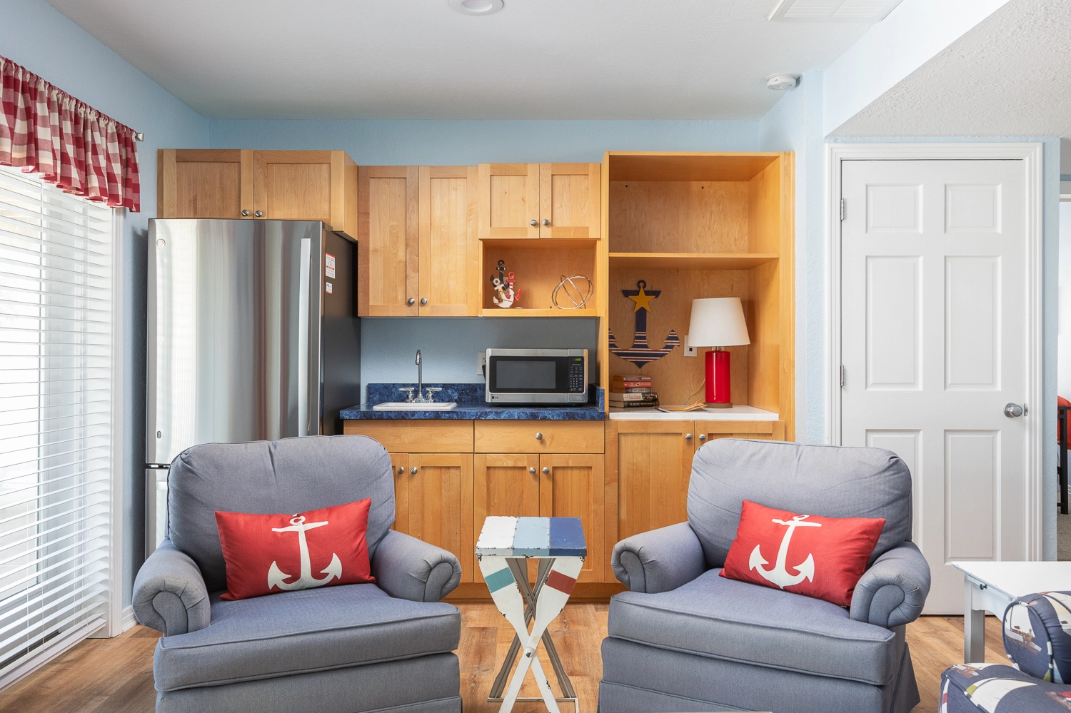 Rec room with foosball and kitchenette with refrigerator; laundry.