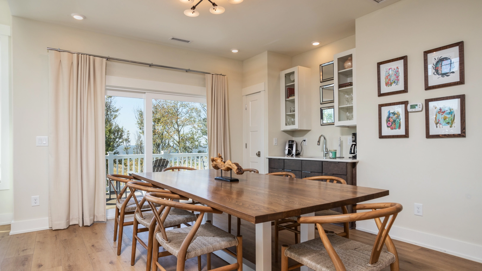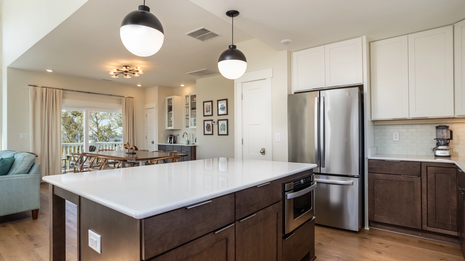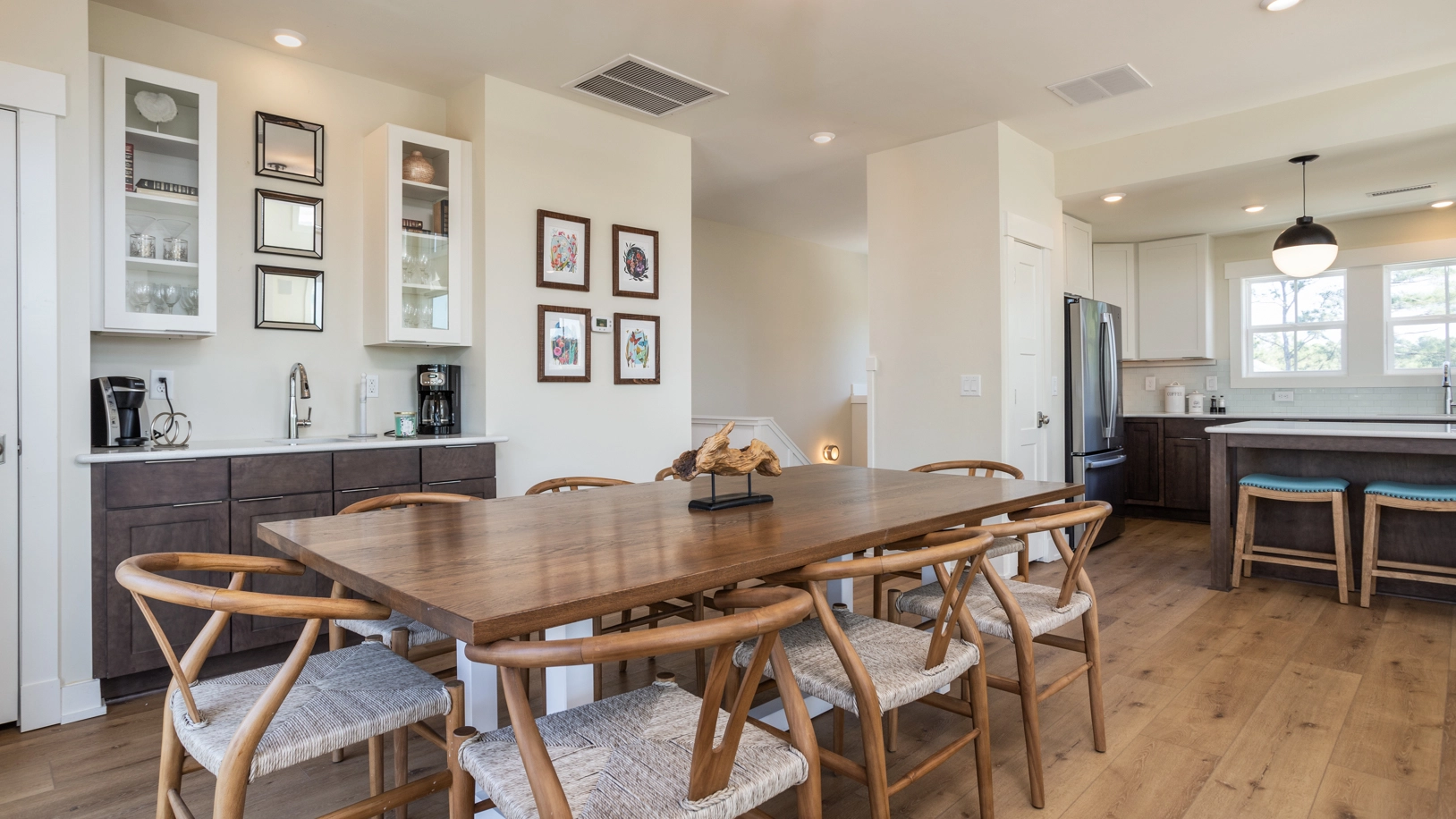Great room with gas fireplace; kitchen; dining area with wet bar.