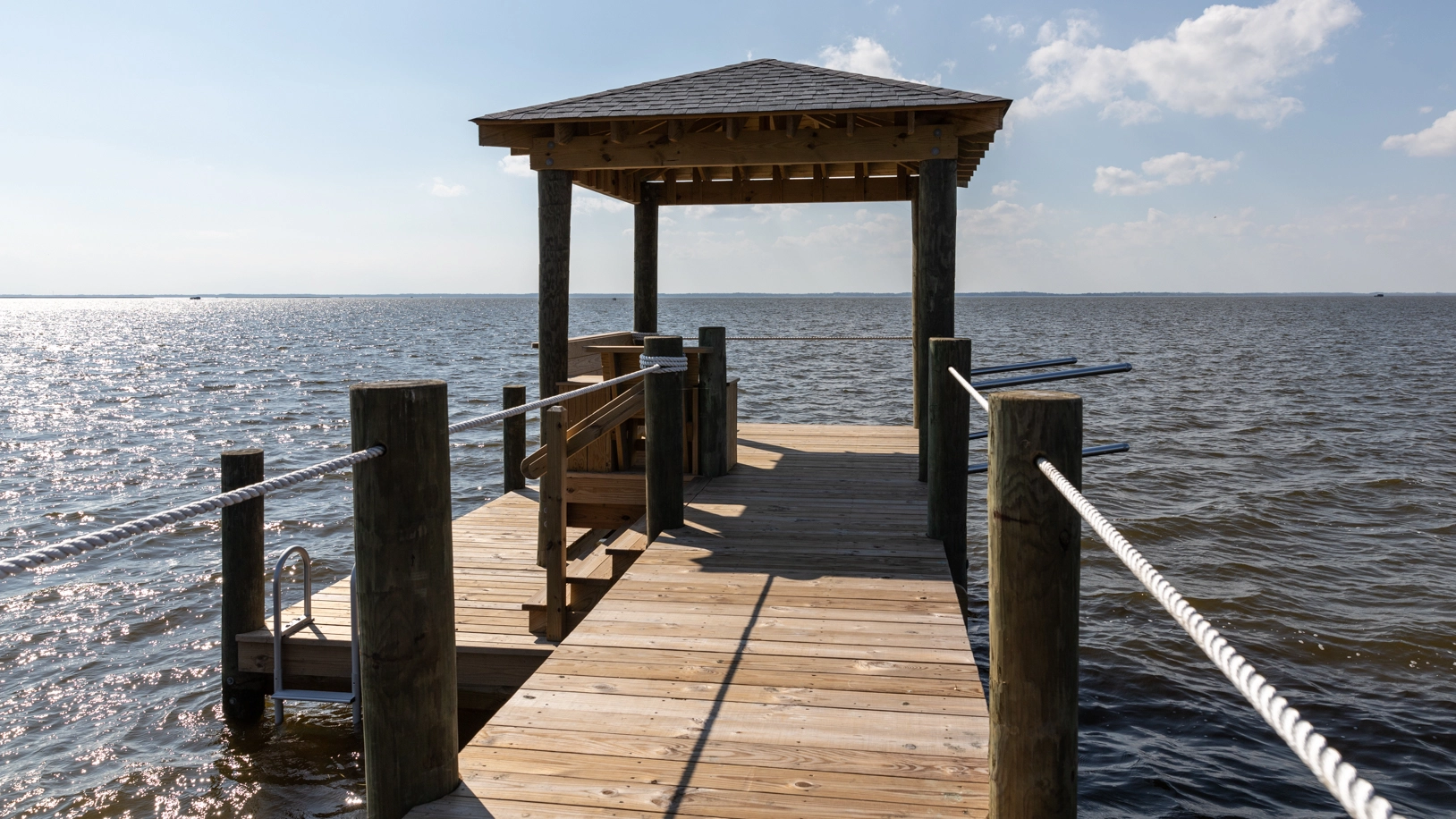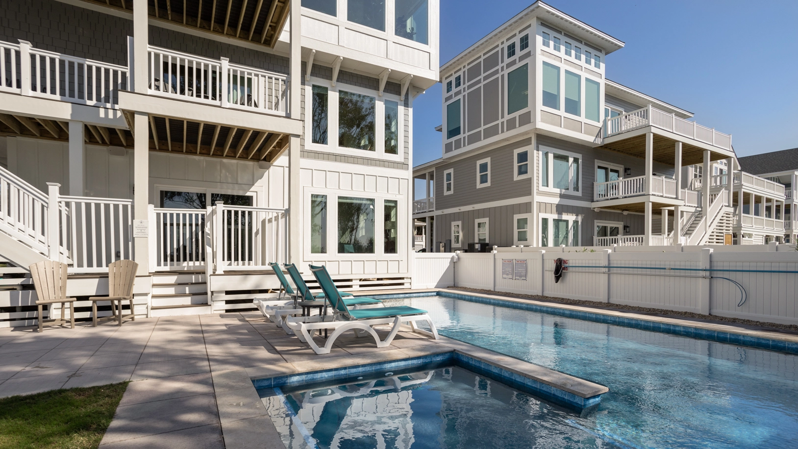 Private pool with shallow wading area, hot tub, and private soundside pier.