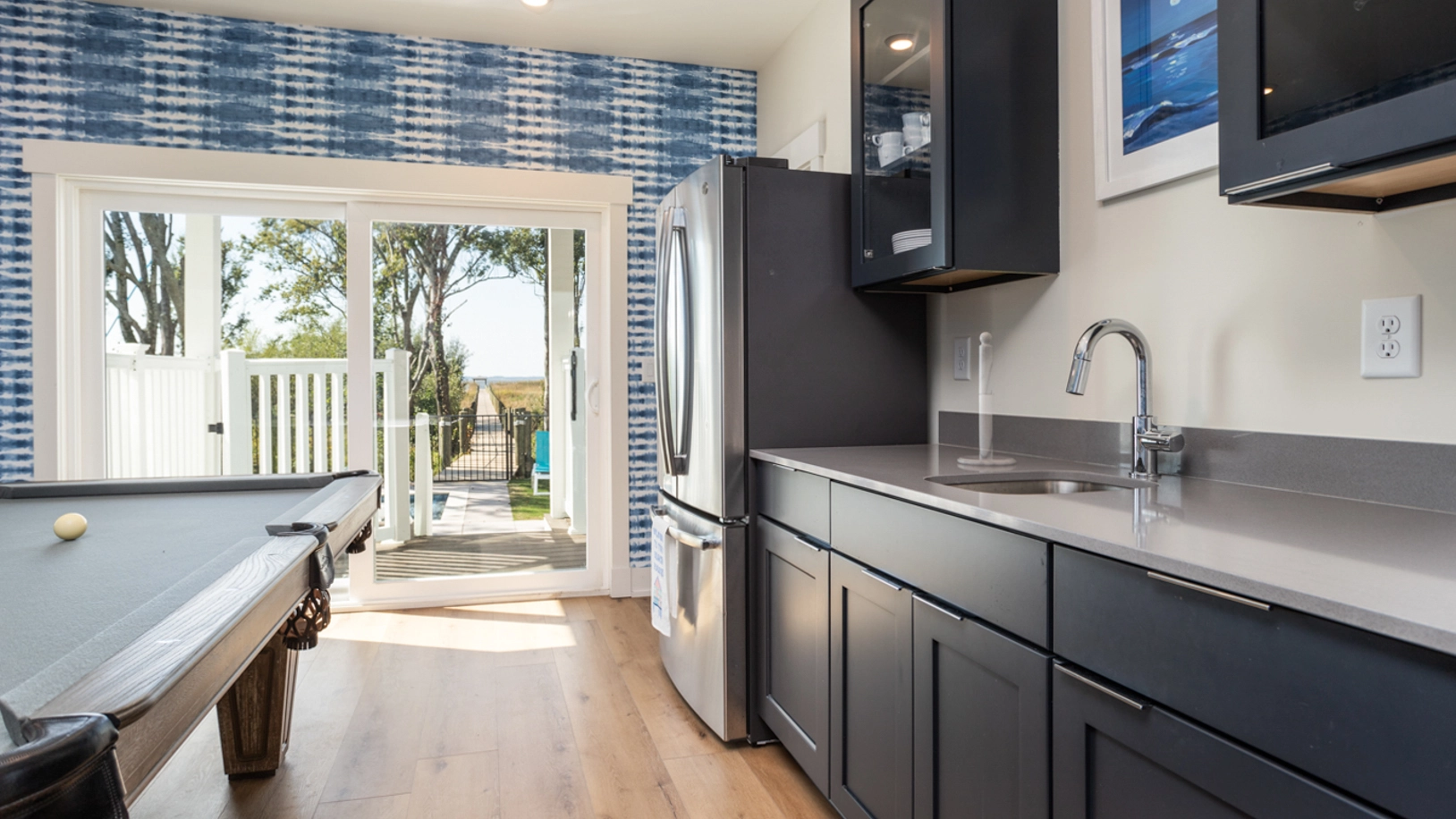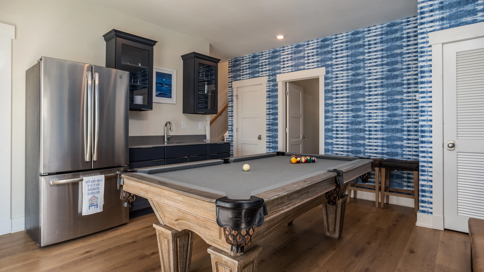 Rec room with pool table and kitchenette with refrigerator.