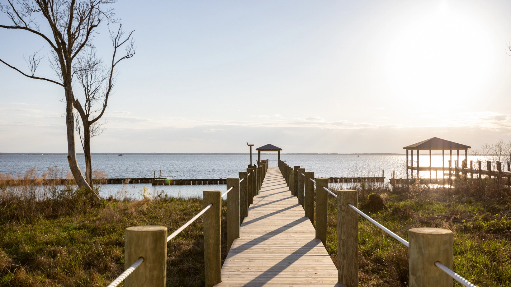 "The private board walk to the gazebo on the sound and the beautiful sunsets."