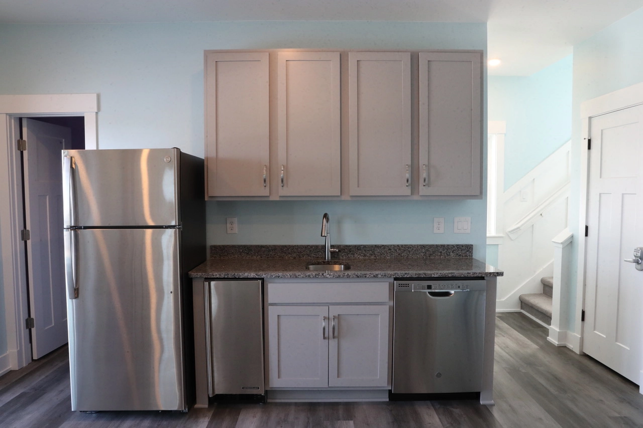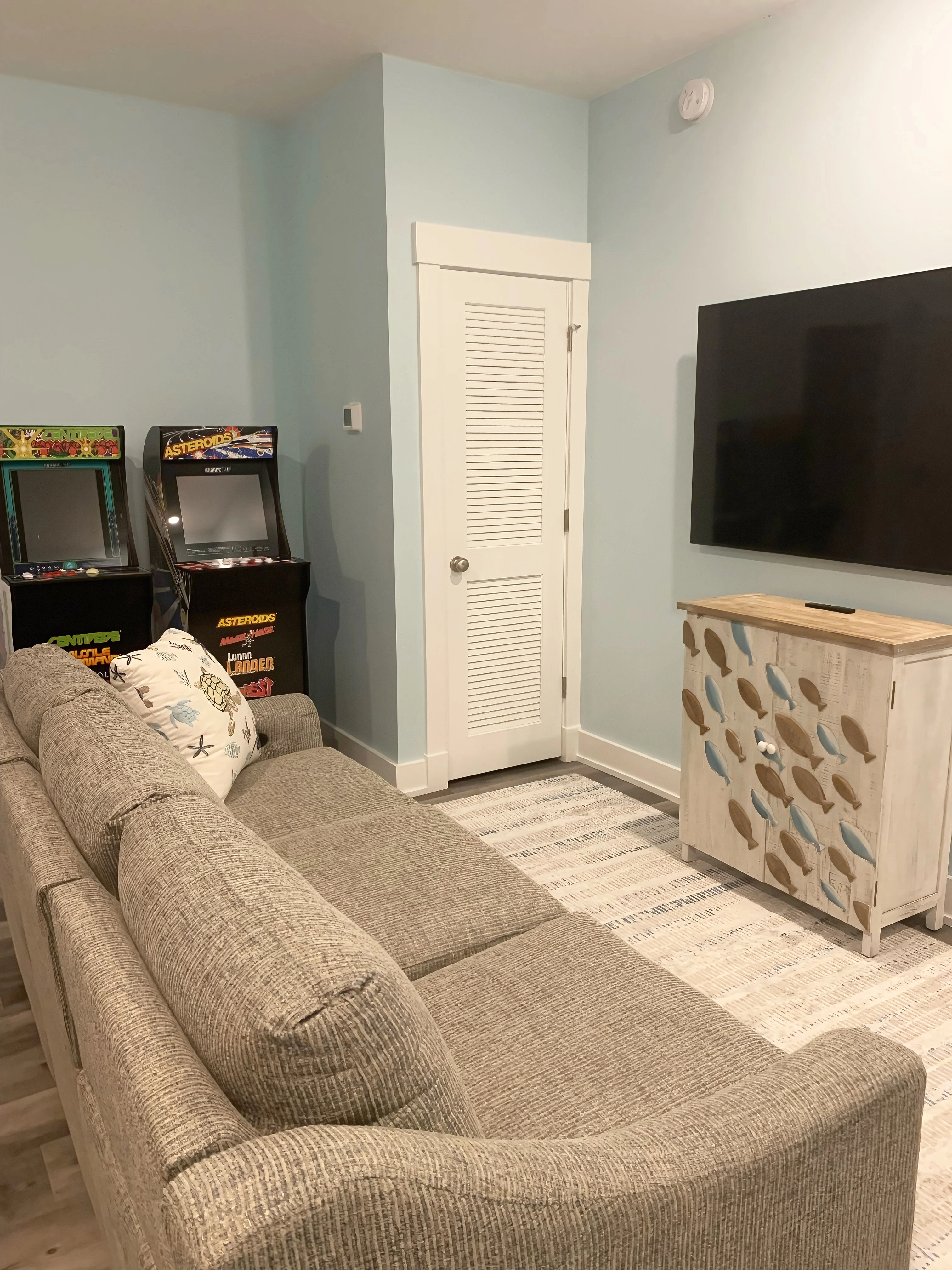 Rec room with TV and arcade games, ice maker, dishwasher and refrigerator.