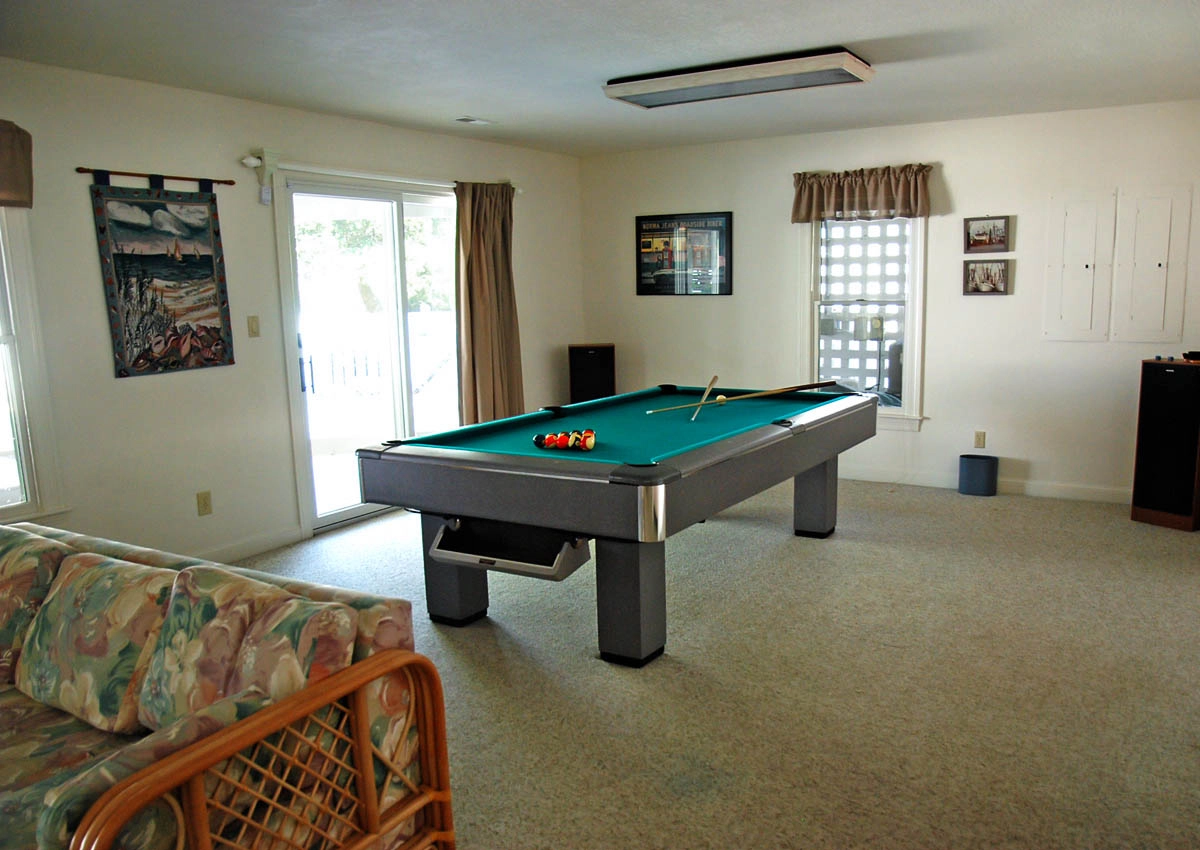 "The deck with the view of the sound and the pool table and location"