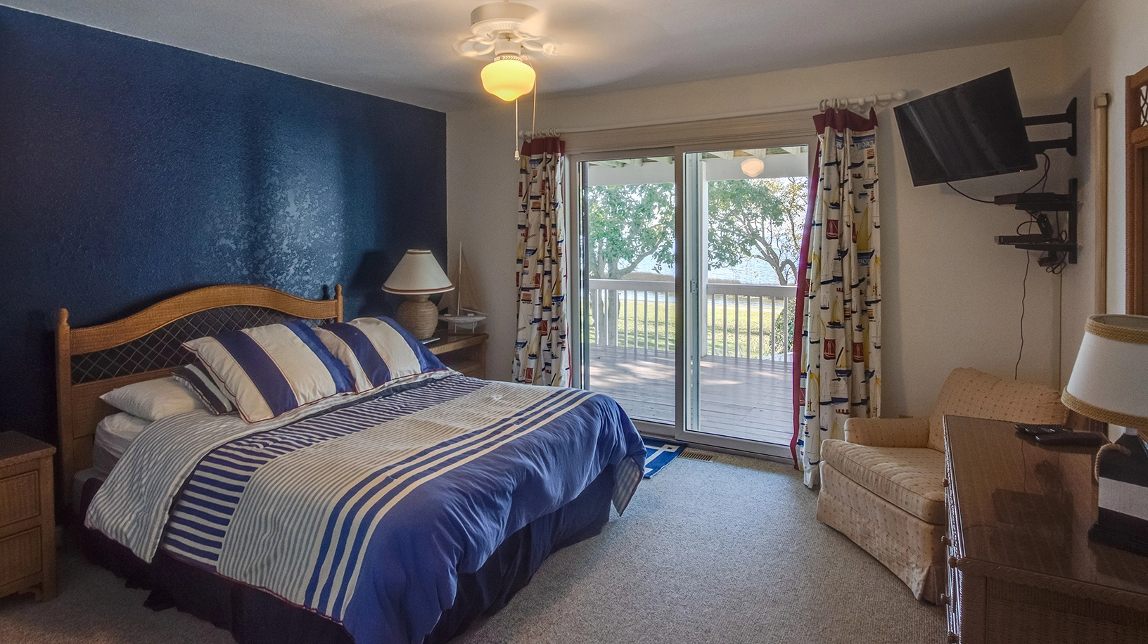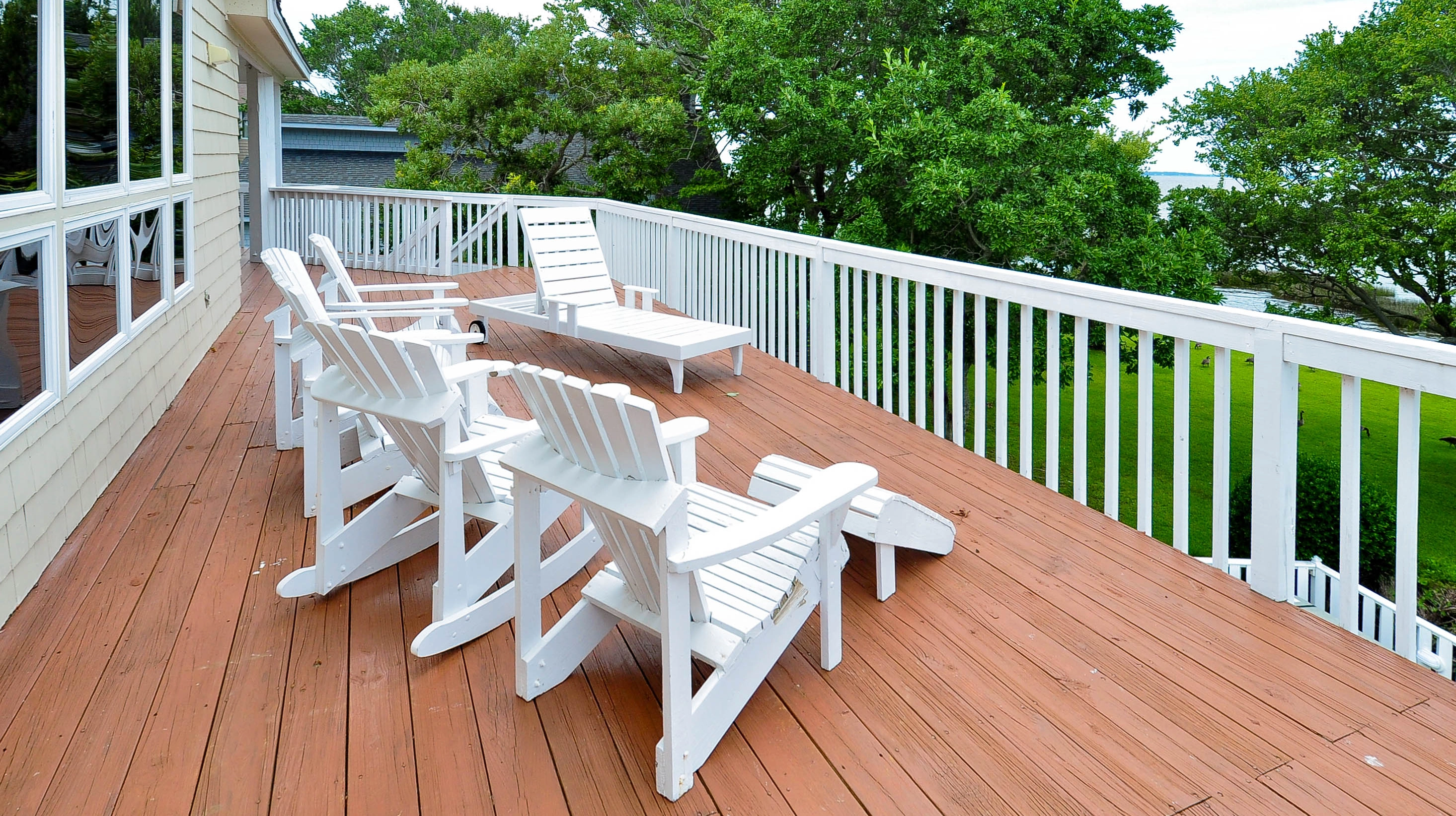 "Despite this house being slightly dated in terms of the kitchen cabinets/counters/appliances and low bathroom vanities, it was nicely furnished and the kitchen was well appointed. All in all a very comfortable and inviting interior space. With bedrooms on three different floors we could spread out and enjoy privacy. But what really makes this house is the location and the view. The view from this home is spectacular as it sits on the sound with lovely trees and water as far as the eye can see. It was beautiful and shady in the morning and the perfect spot to drink coffee, enjoy the view and watch the birds, ducks, geese and even an osprey (the osprey nest is close by). In the afternoon with the sun pouring on the rear of the house, we could still enjoy the outside while sitting on the second level covered porch with its comfortable chairs and rope swing since it was shaded and we had a cool breeze coming off the sound. We all especially loved having the swimming pool and the separate hot tub - our ages ranged from 3 years old to 72 and we all took advantage of the pool, usually swimming twice a day. Again, there was a covered area and some shade so it was never too hot to sit by the pool. We actually spent most of our time at the house since the beaches were crowded and we had the pool for swimming and the sound view. We were pleasantly surprised to find that the holiday fireworks display was on our last night there (July 3) and we had the perfect vantage spot to watch from the rear porches of the house. The only improvement I would strongly suggest to the owners is purchasing a better vacuum - one designed for animal hair - for cleaning the area rugs and carpeting. We knew it was a pet friendly house and rented it despite having no pets with us. The house was clean and smelled fine (no pet odor) but the area rugs were covered in pet hair and we had small children playing on the floor so having a better vacuum to pick up more of the pet hair would be beneficial. We would most definitely rent this house with its sublime location and views again. Honestly we wished we could have stayed for the entire month!"