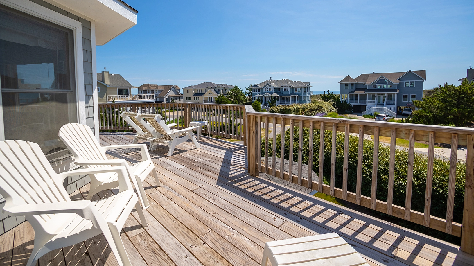 Great room with wood-burning fireplace; kitchen; large dining area; deck access facing the ocean; screened porch with couch and chairs under a ceiling fan; deck with picnic table.
