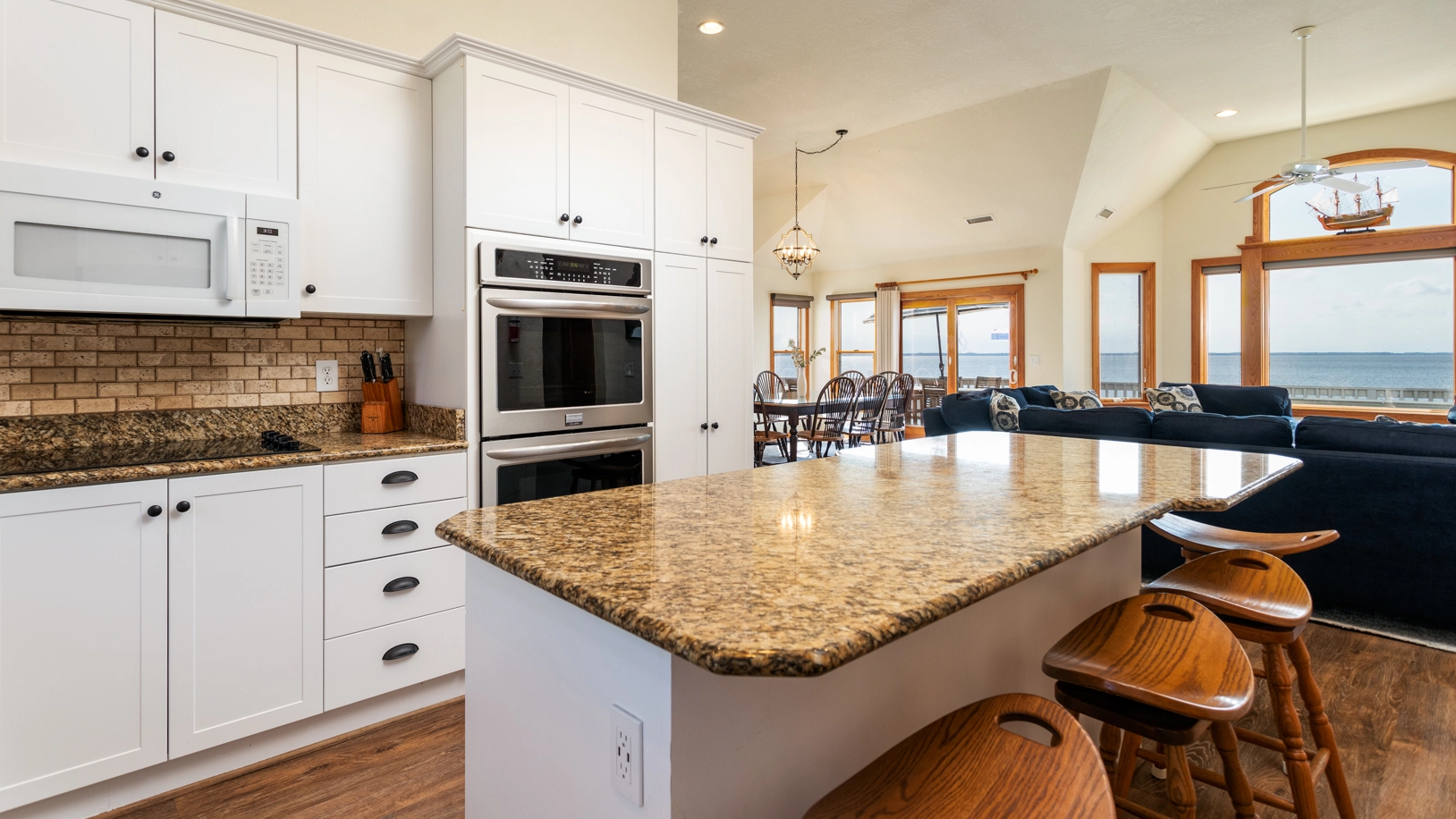 "We loved the open layout of the living and kitchen areas. There were plenty of plates, cups and silverware. 2 dishwashers and ovens were a huge plus! The view was great over the sound and the neighborhood was quiet. We would absolutely stay again!"