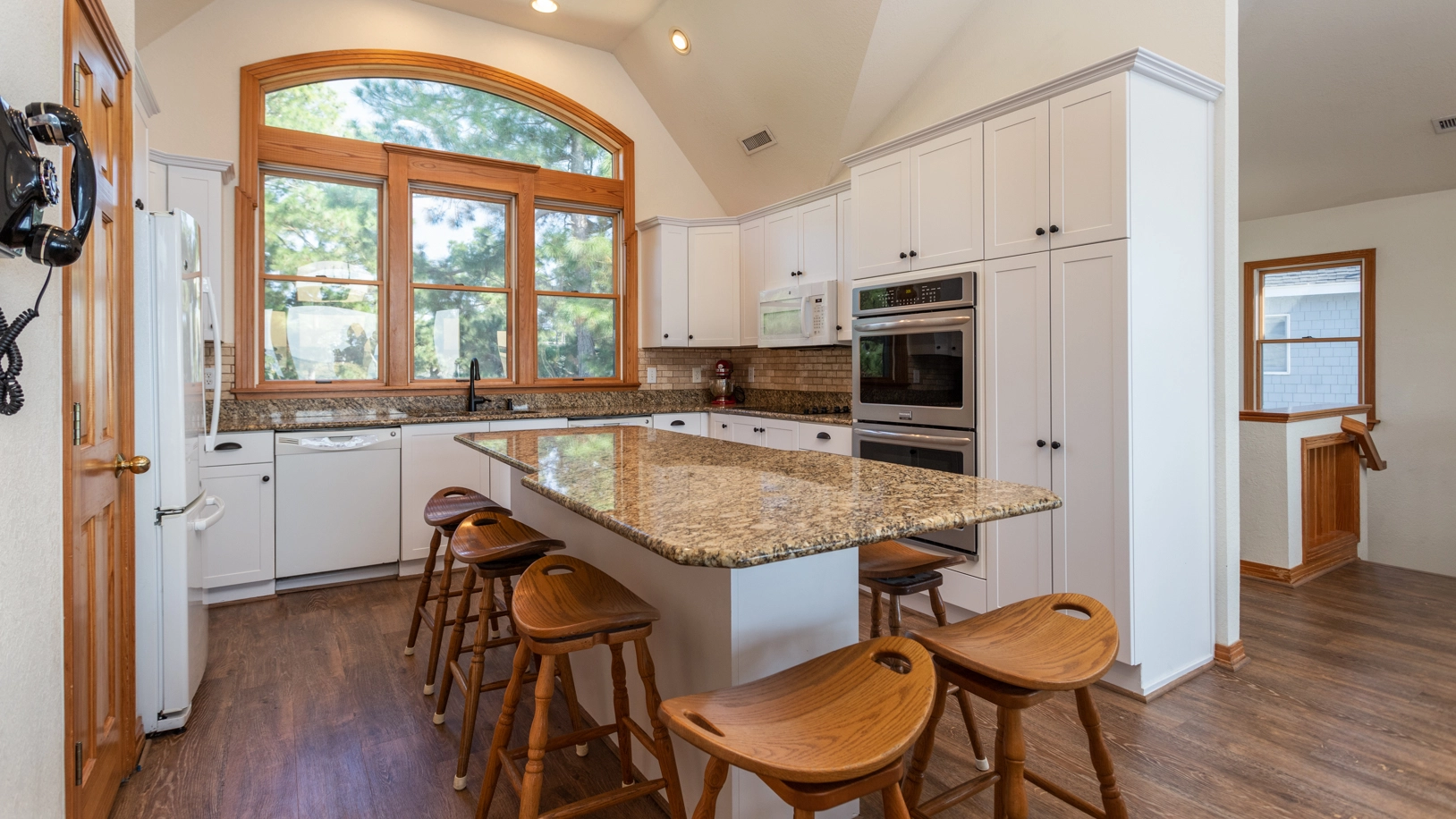 Great room with surround sound; well-equipped kitchen, with double dishwashers, island and six barstools; dining area with seating for ten; deck access.