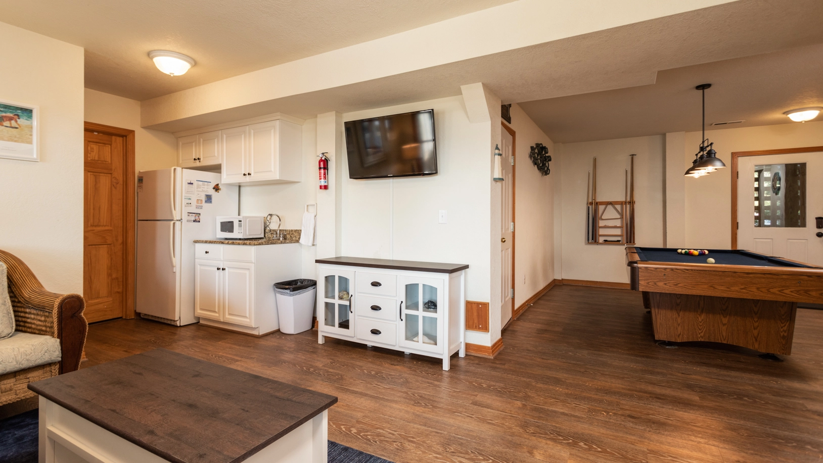 Rec room with pool table, wet bar, microwave and refrigerator; thirteen chair theater room with projection screen and surround sound; picnic table with gas and charcoal grills.