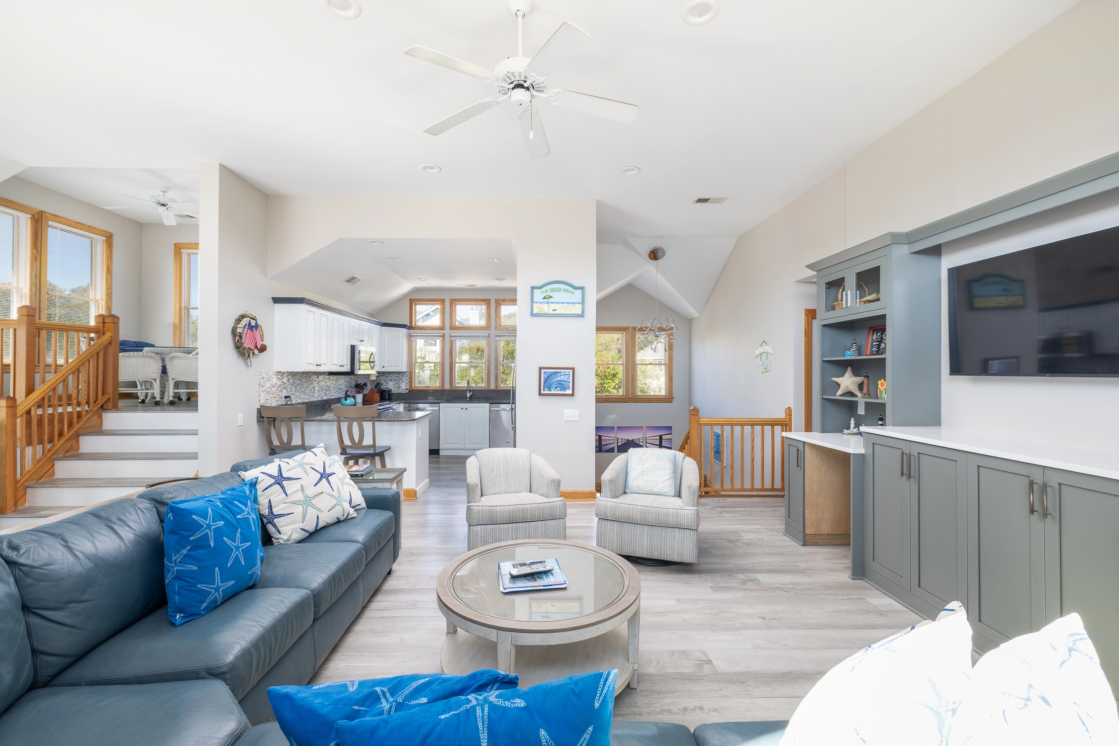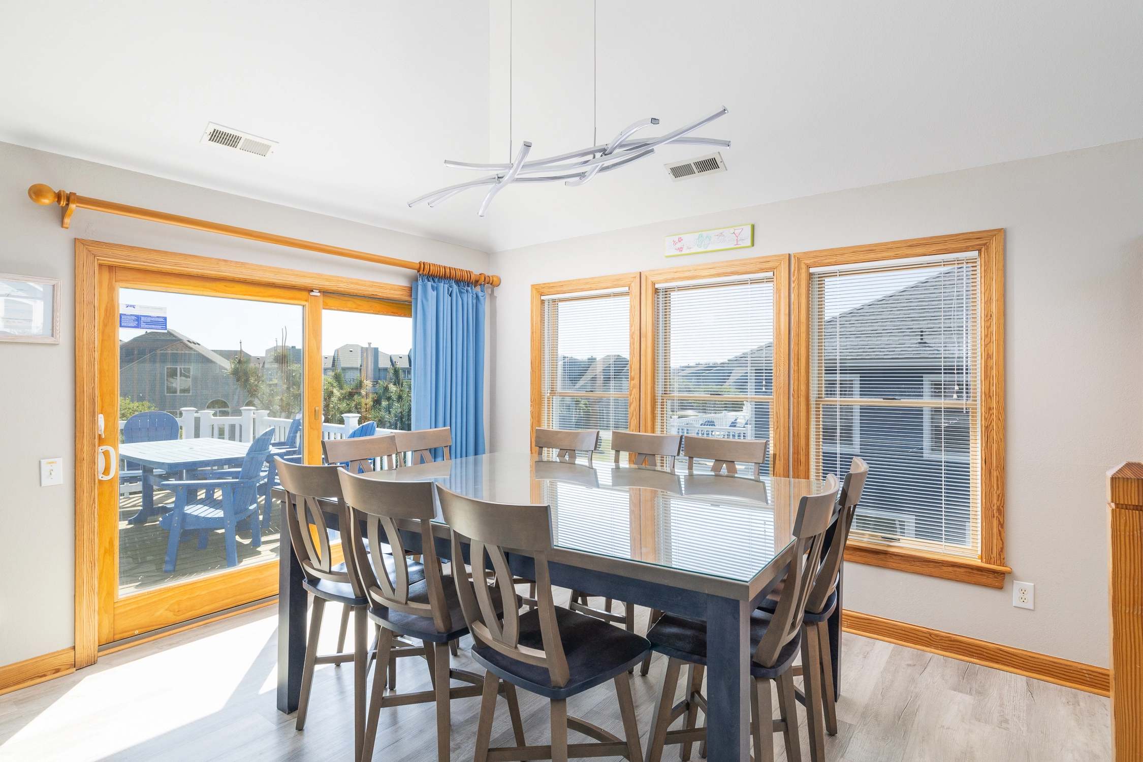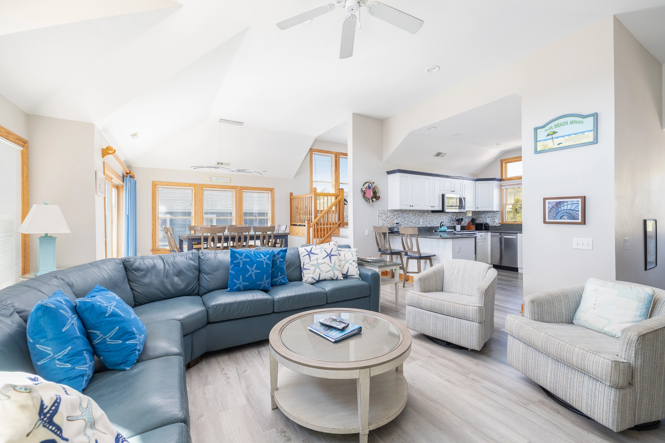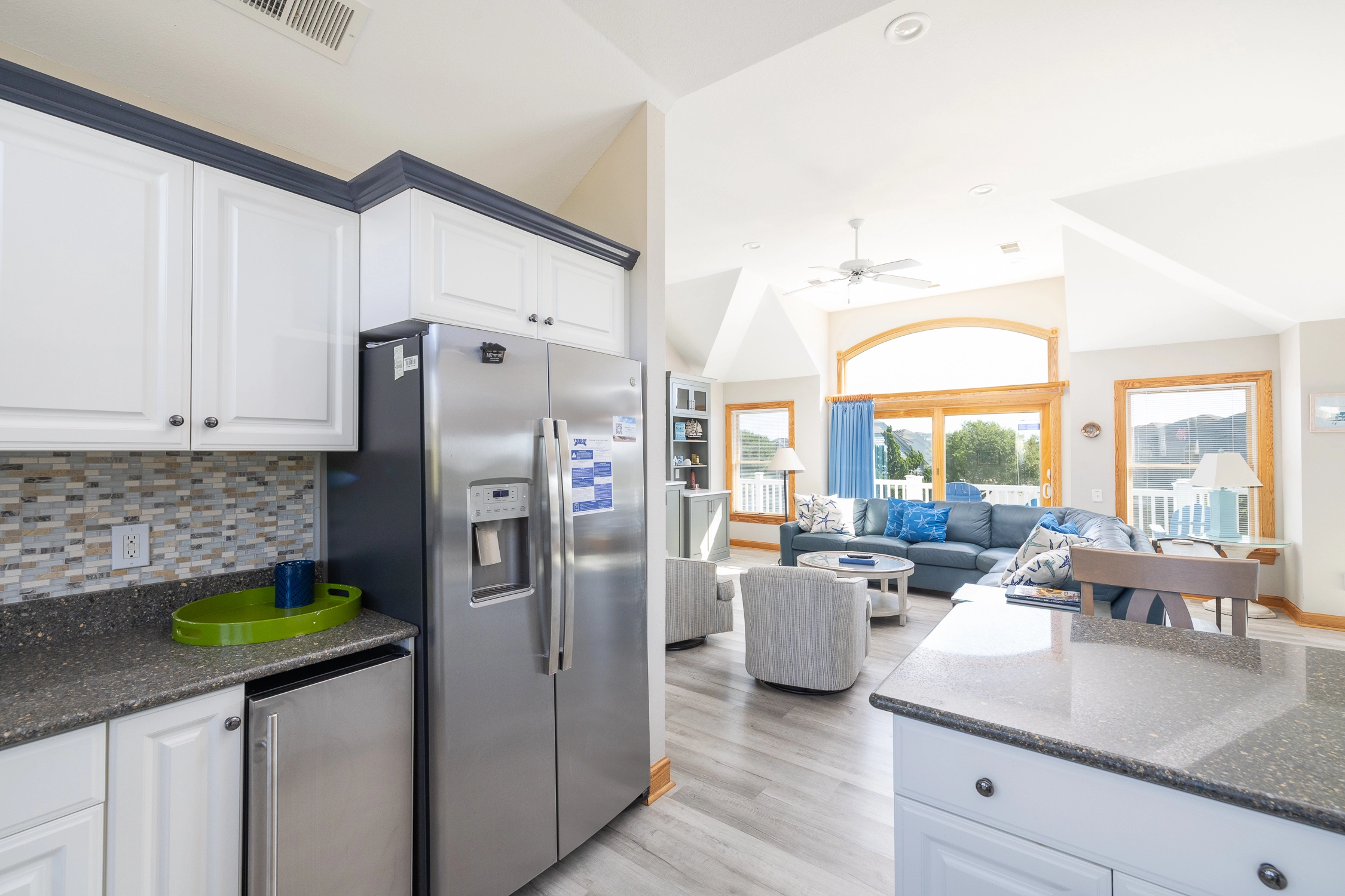 On the third level of the home, the great room is open and bright, with high ceilings and many windows to allow natural light to fill the space. Unwind with loved ones in the cozy living area—the perfect spot for deep conversation, a movie marathon, or cheering on your favorite team. The ship’s watch is the perfect place to play a board game or put a puzzle together throughout your stay. The nearby kitchen is equipped with all that you need to prepare meals during your stay, just add groceries. Two dishwashers are a big help when it’s time to clean up after family meals. Meals can be enjoyed together in the dining area or at the table outside on the deck. There is one master bedroom on the top floor of the home, which includes a private bathroom and access to the deck. A half bathroom completes the third level.