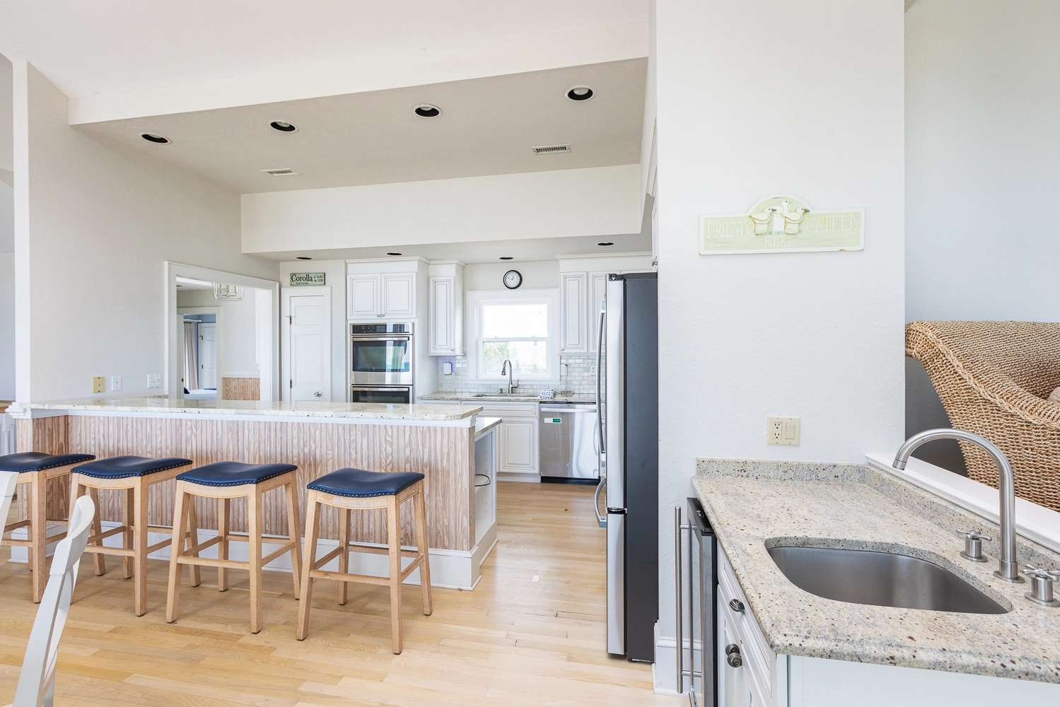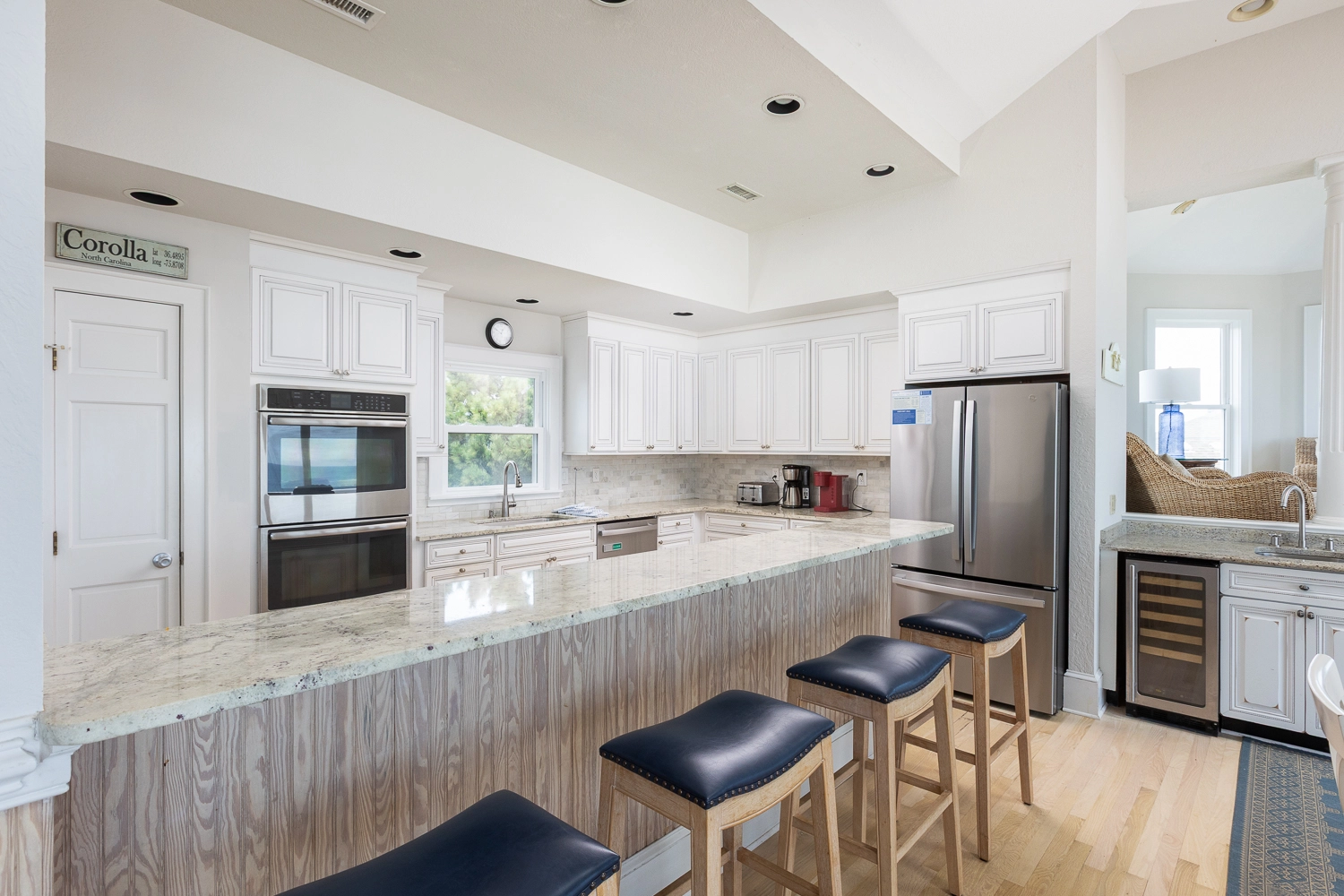 Great room with gas fireplace; kitchen with two ovens; sitting area; dining area with wet bar, and wine cooler.