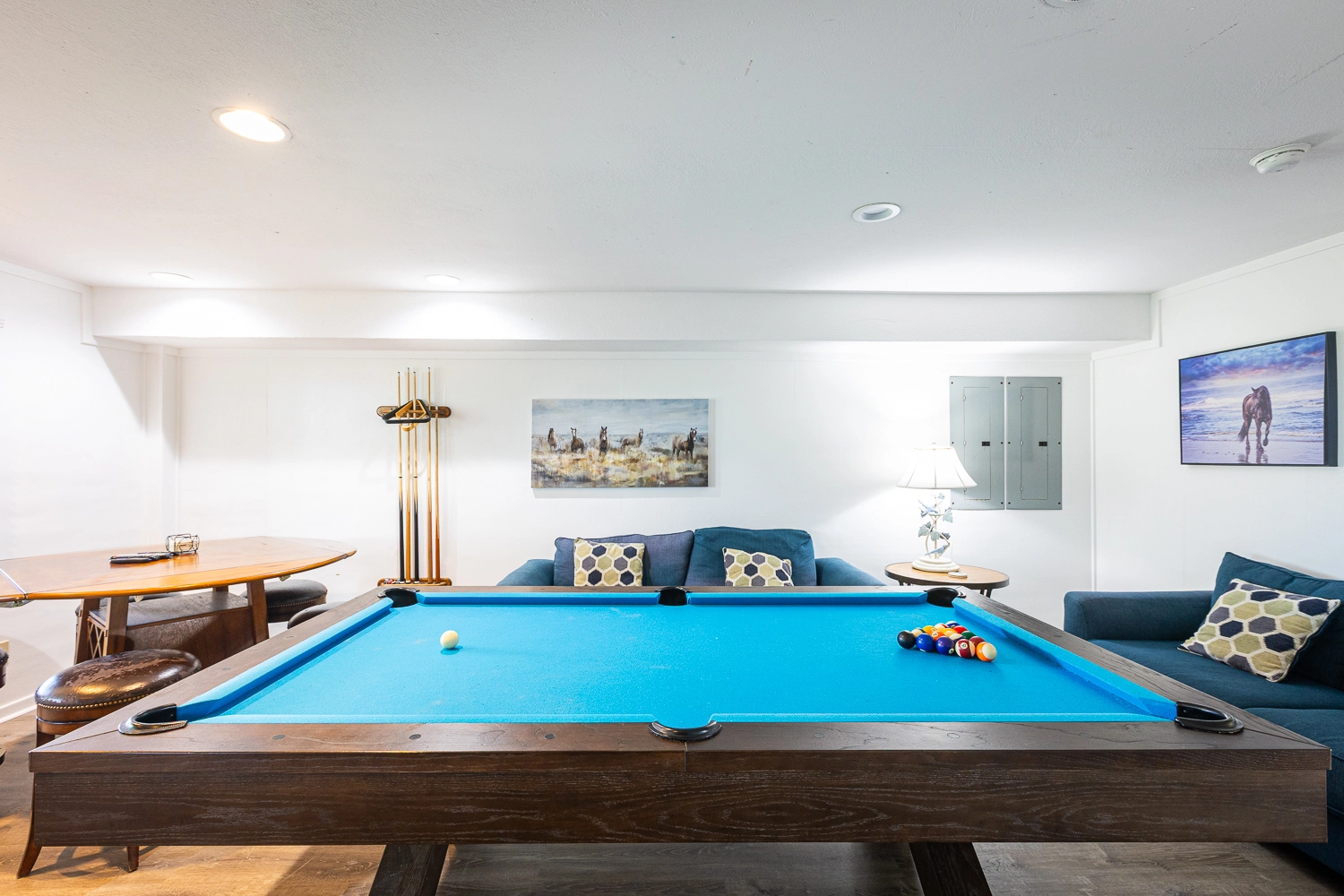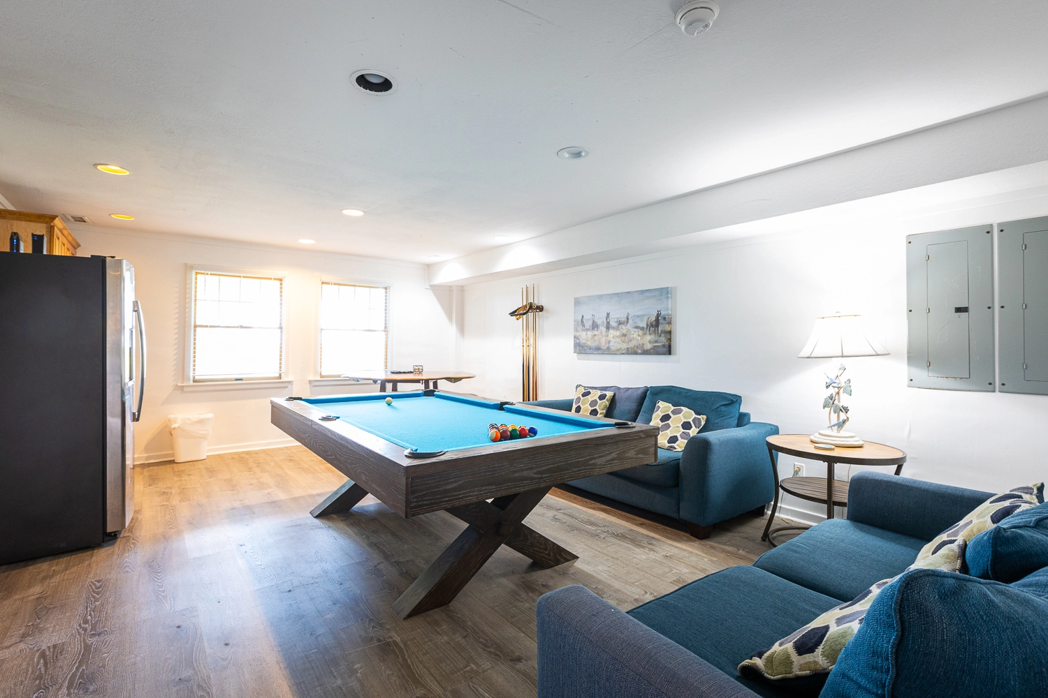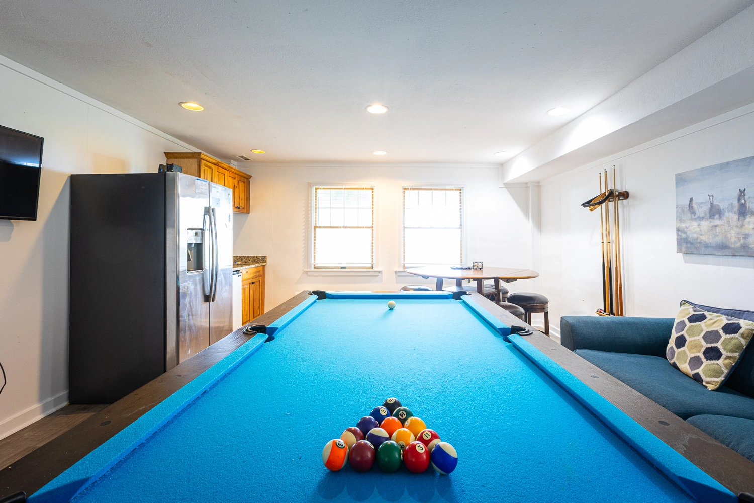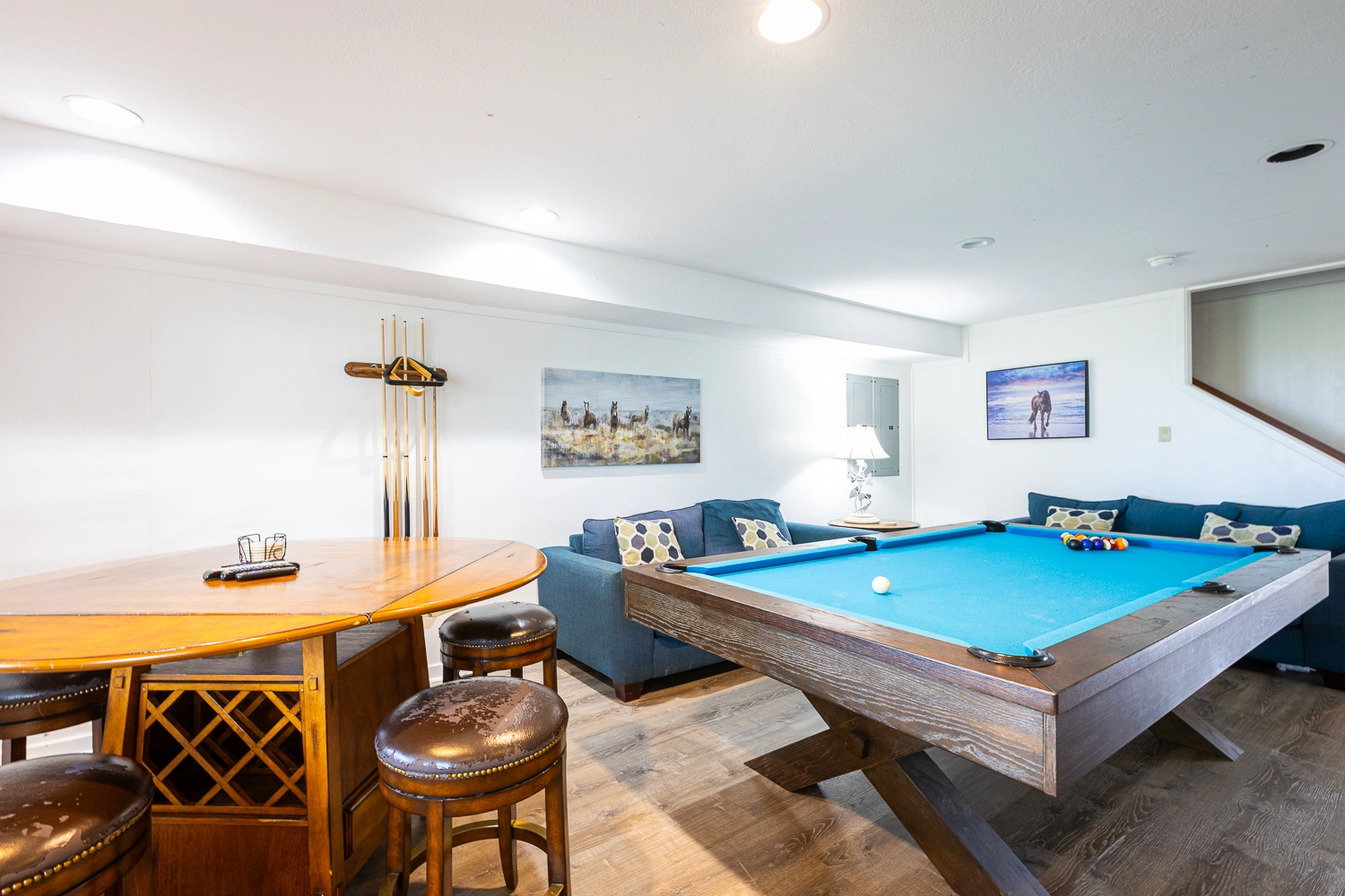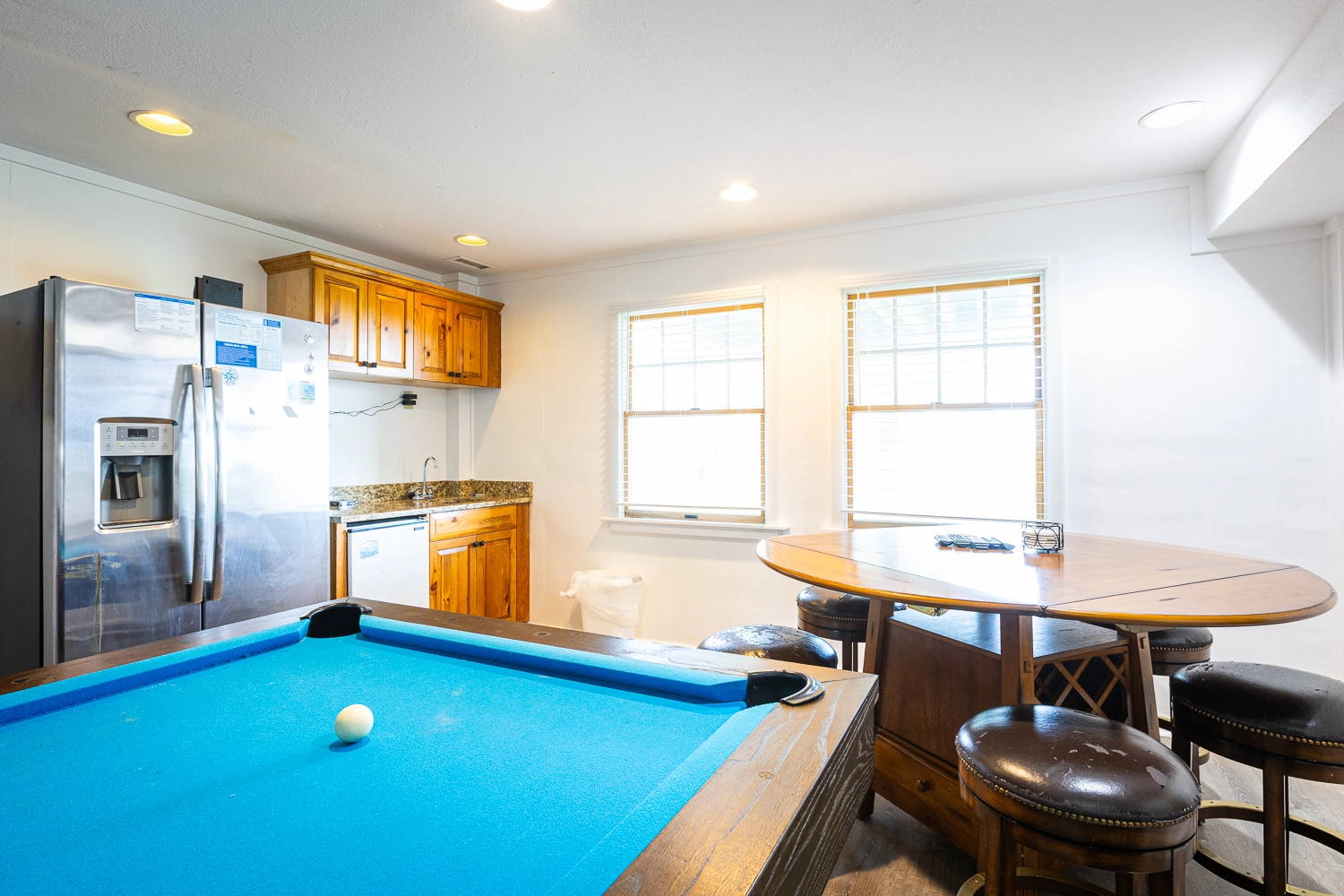 Rec room with pool table and wet bar with refrigerator and beverage refrigerator.