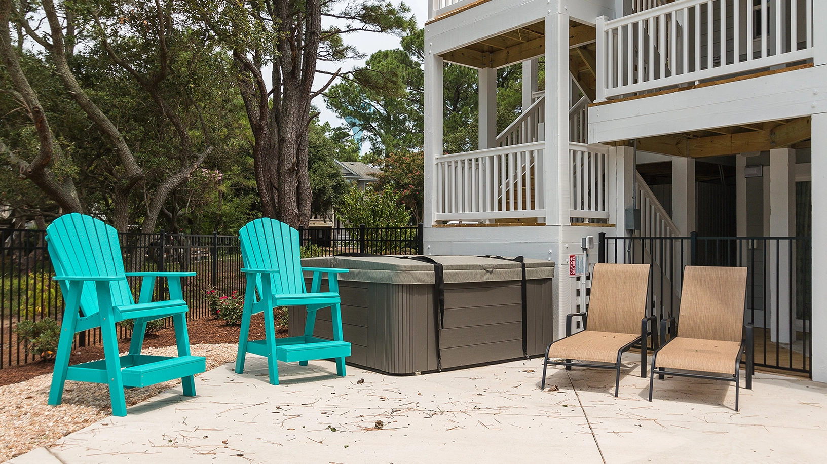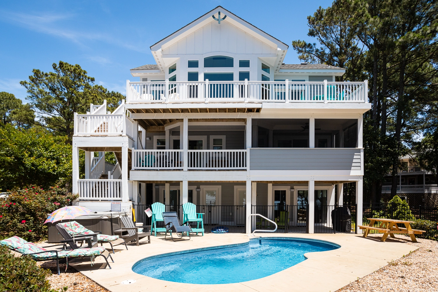 Private pool, hot tub, picnic table and pool chairs/lounges.