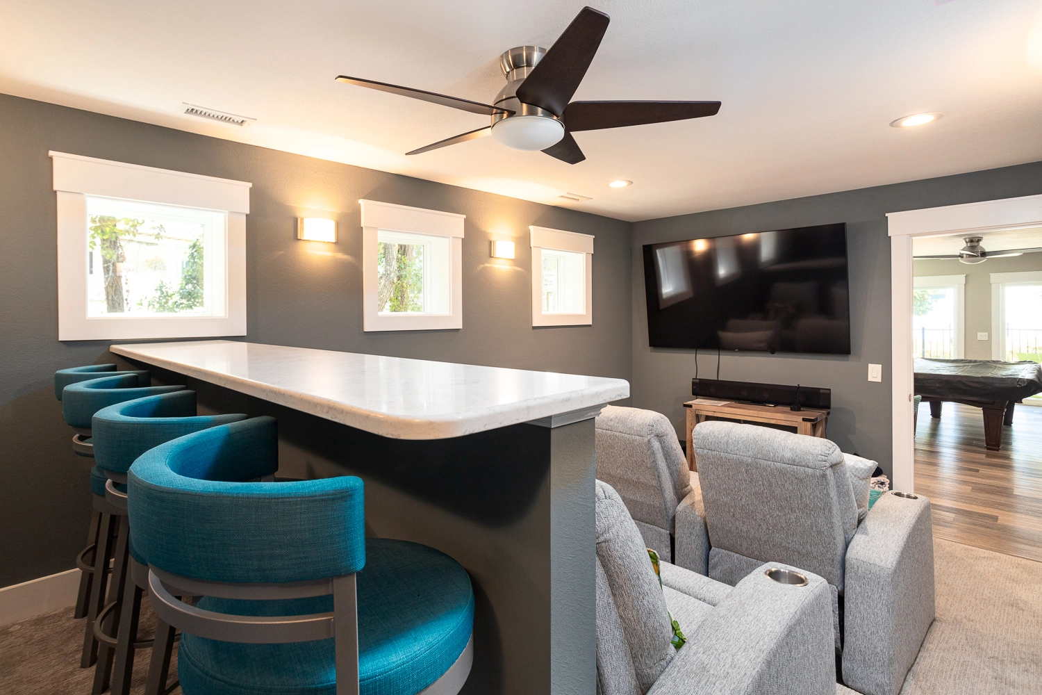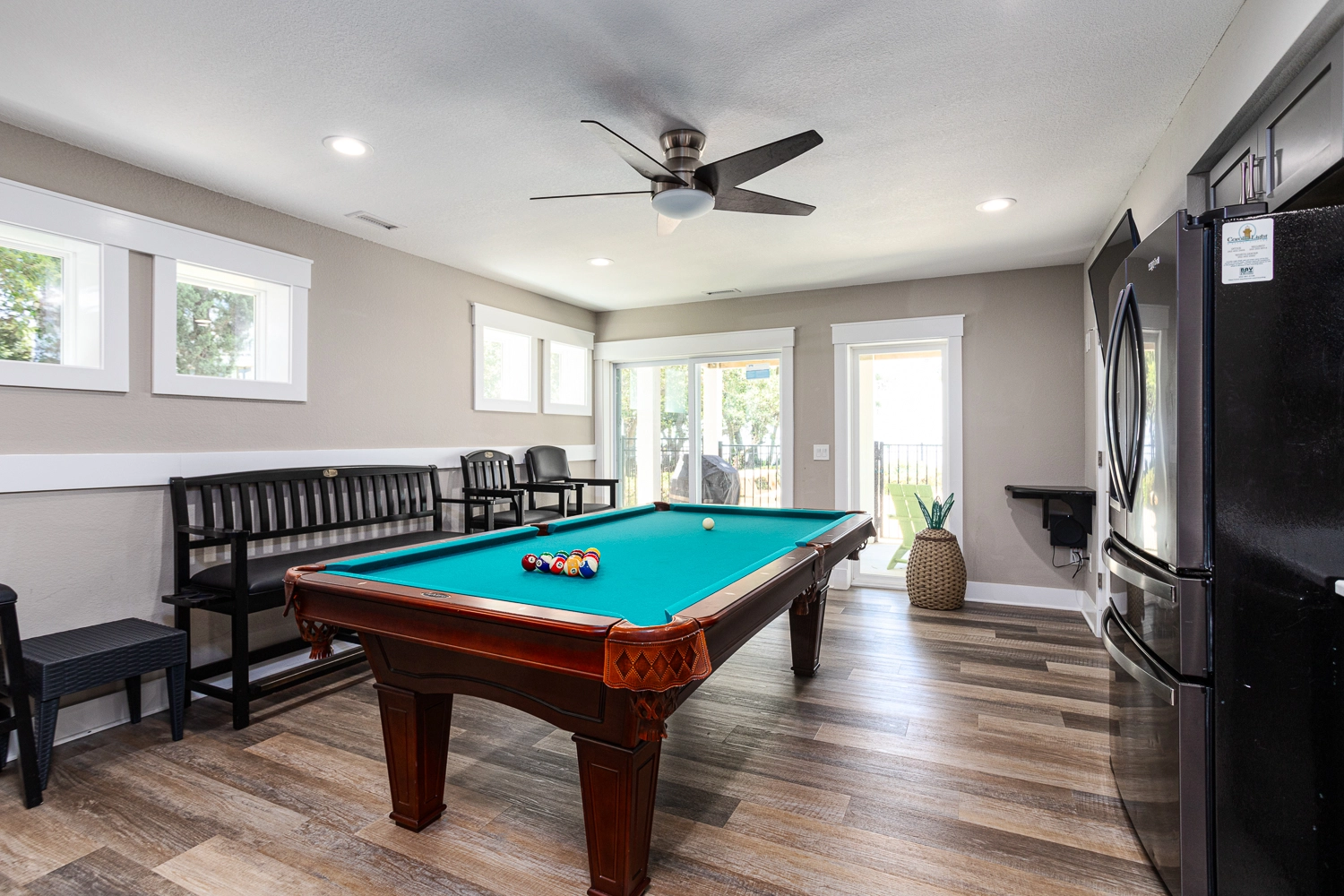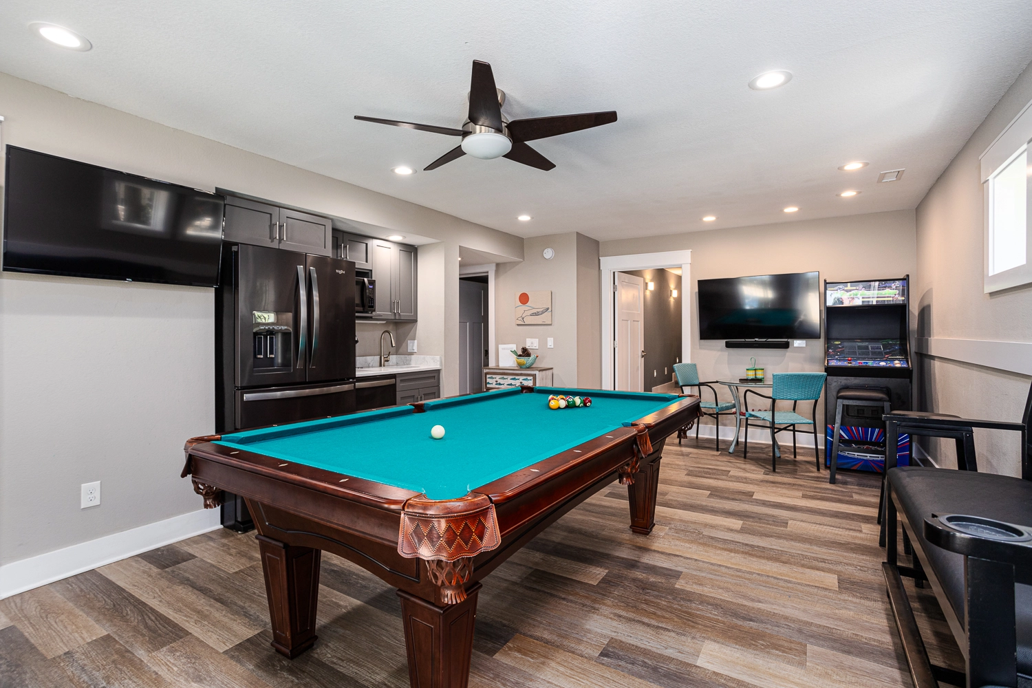 Theater room; rec room with pool table and kitchenette with dishes/utensils, flex-brew coffee maker (K-cup/single cup combo), small microwave, full-size dishwasher and full-size refrigerator to keep your drinks cold and lunches/snacks ready for the poolside picnic table; laundry.