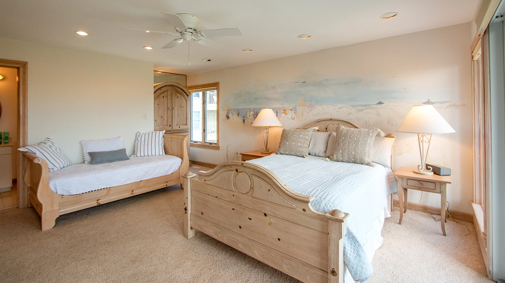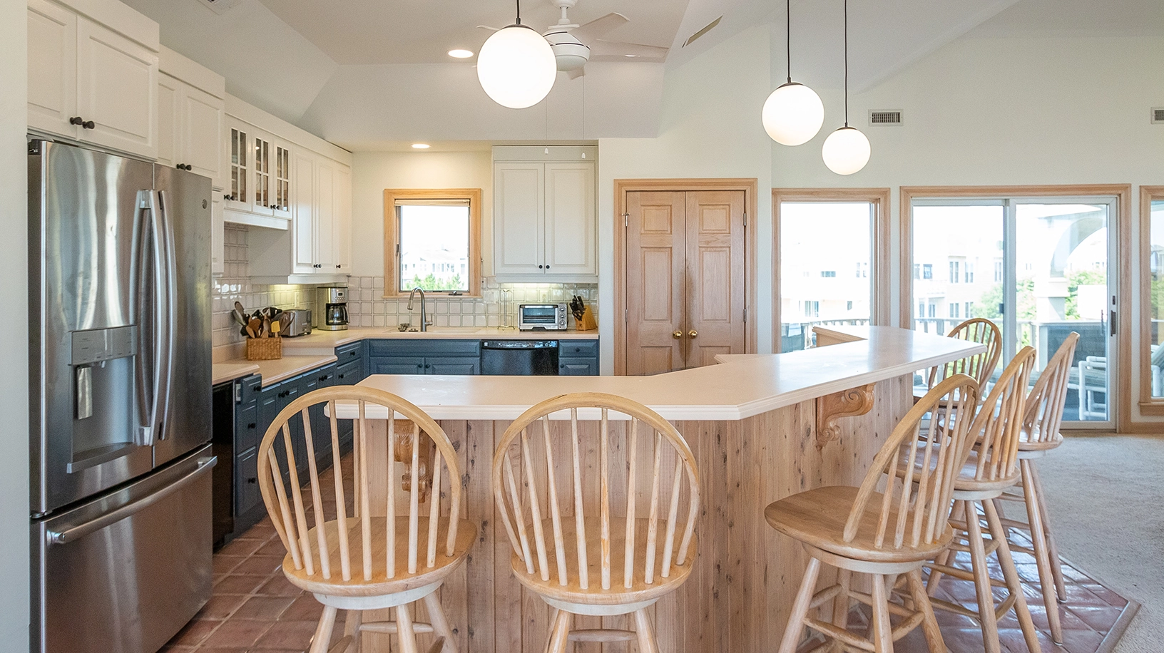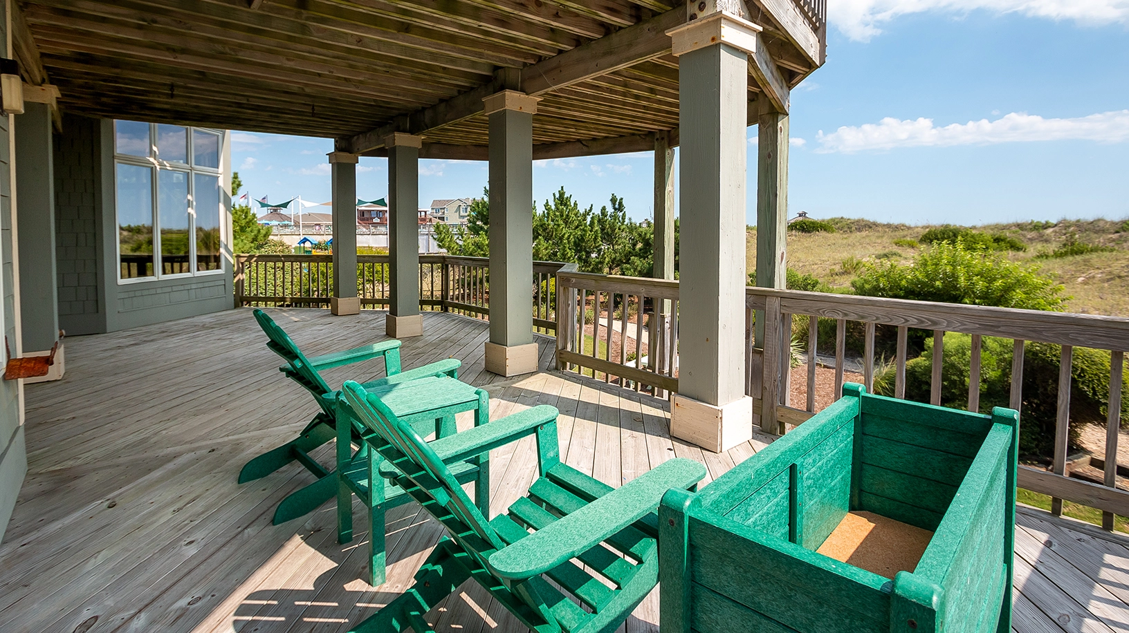 "We enjoyed a wonderful week in this spacious well appointed home. First of all the location was just perfect - central to the beach, pools, playgrounds, game courts and trolley stop, not to mention the Oceanfront Grill which is also fabulous. We loved having a dining table large enough to seat all of us, the 2 additional (small) refrigerators and the plentiful beach chairs. The comfy furniture on the top back deck made it a favorite hang out of all ages. This house worked very well for us with each family group having their own floor for bedrooms. The beds were very comfy. I will say there were a LOT of stairs, so it may not the perfect house for someone with bad knees, but it all worked out great for us. Would love to rent it again!"