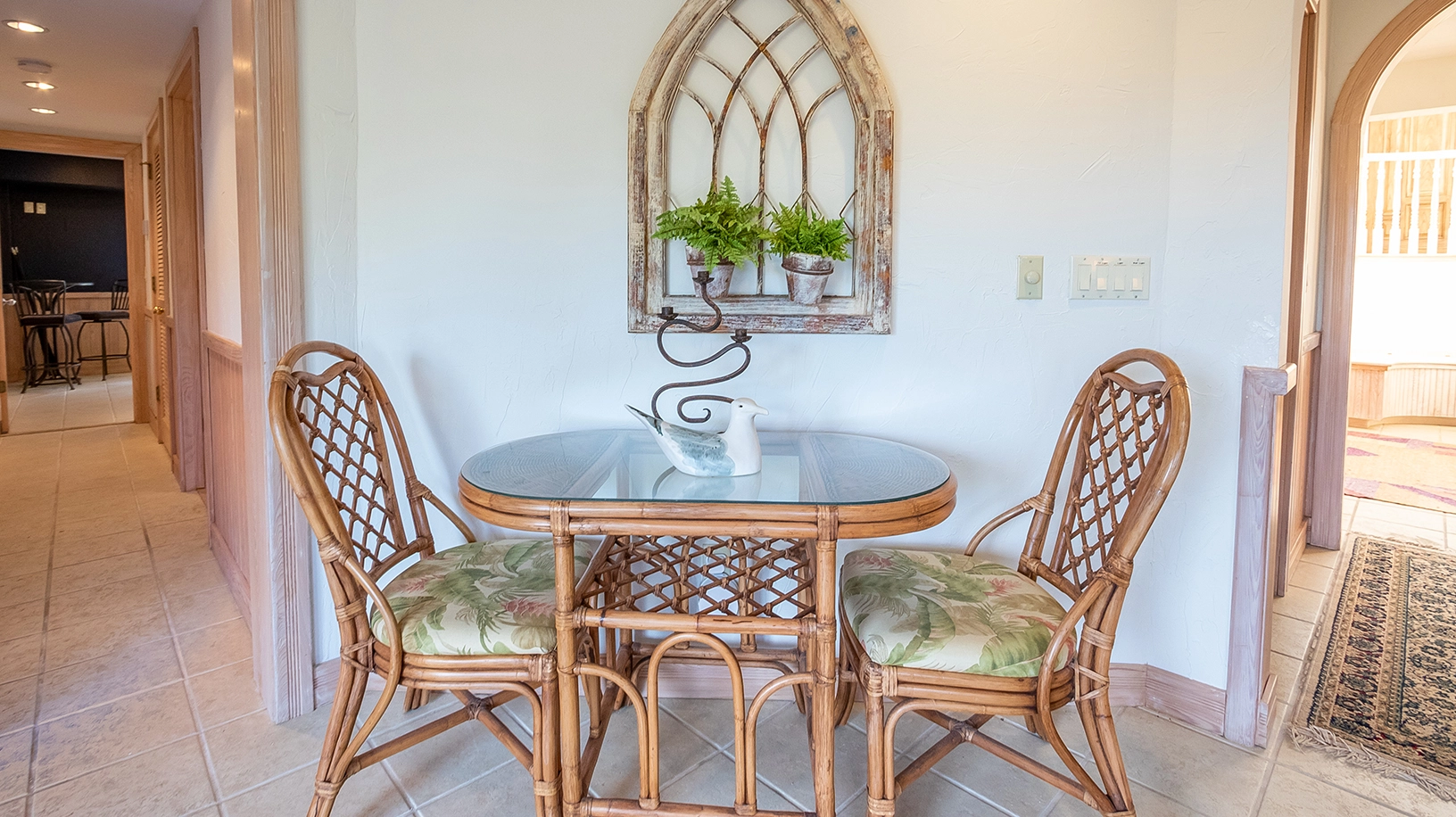 Great room with wood fireplace; kitchen; dining area; breakfast nook.
