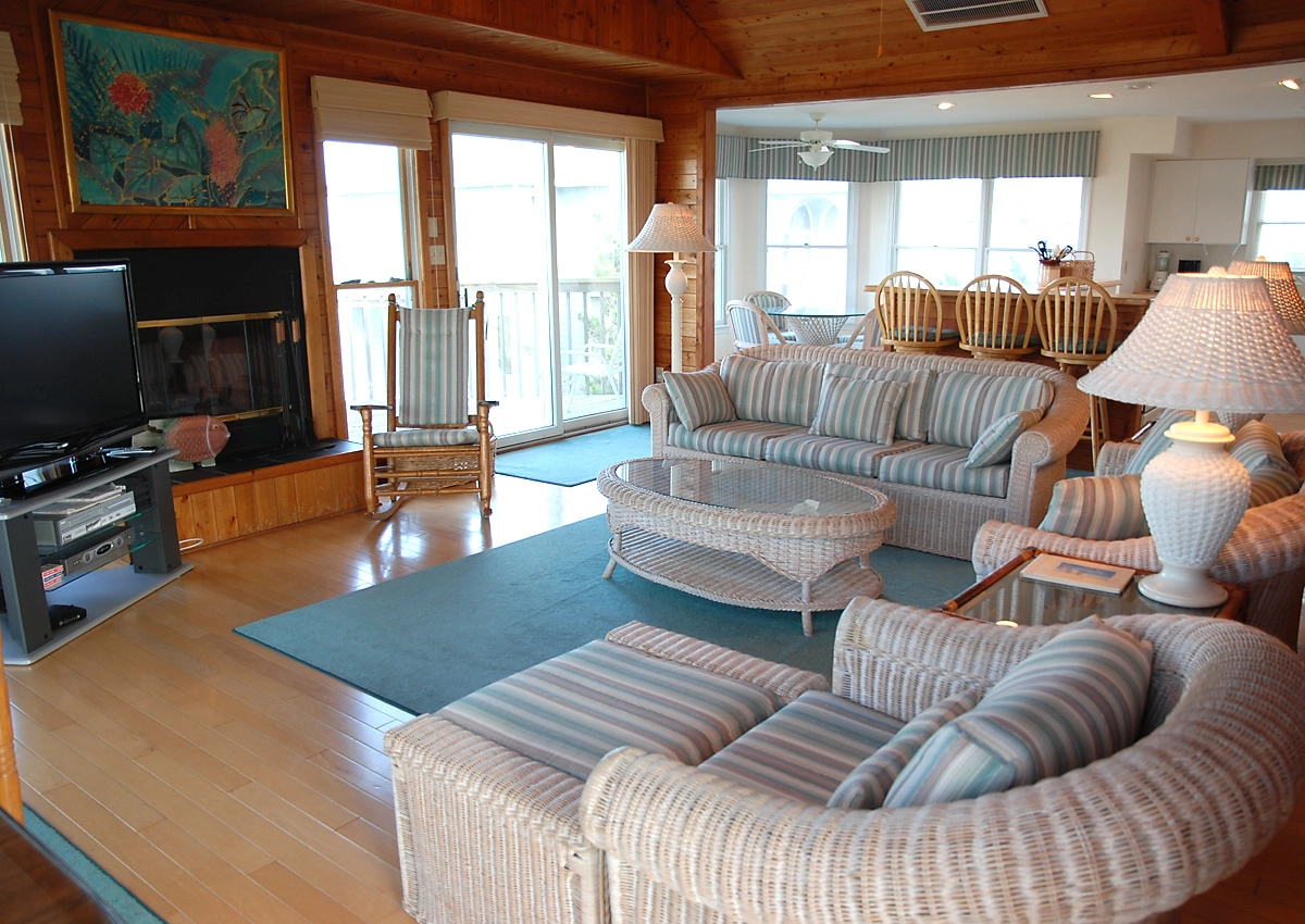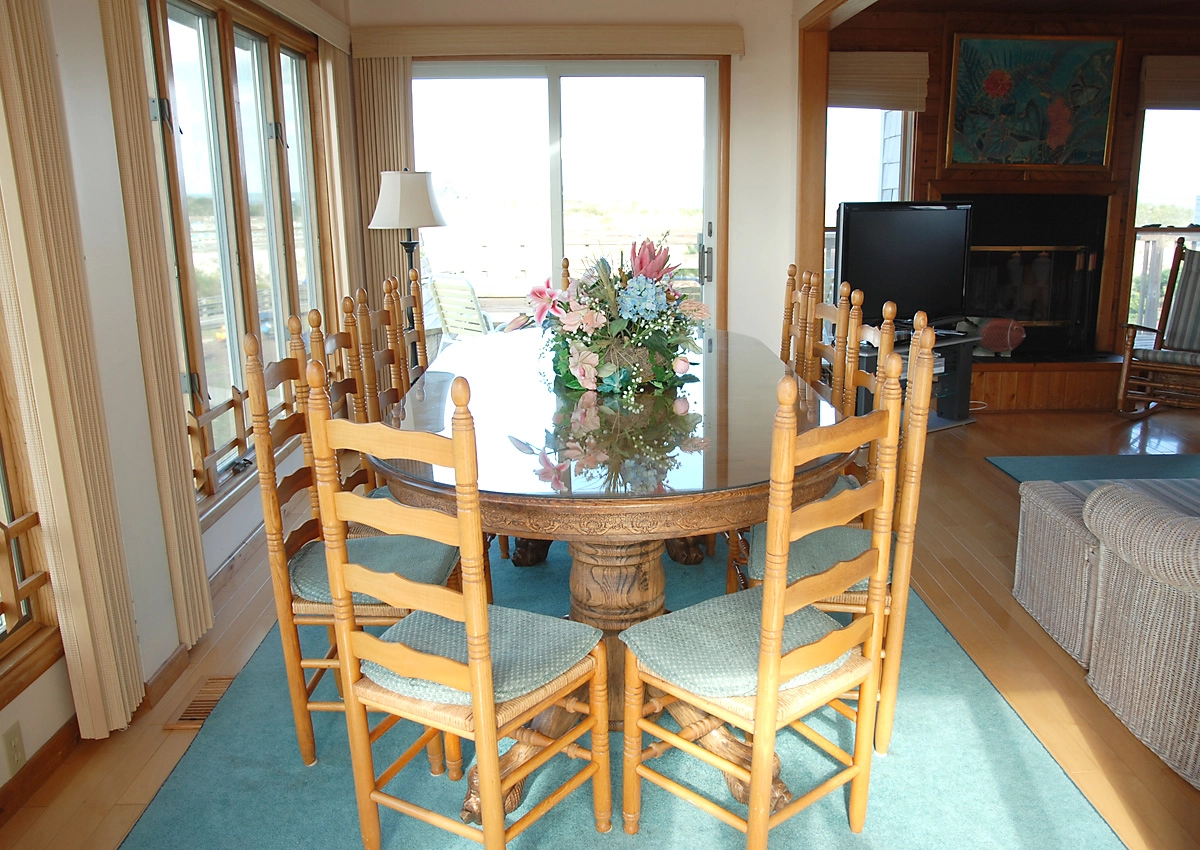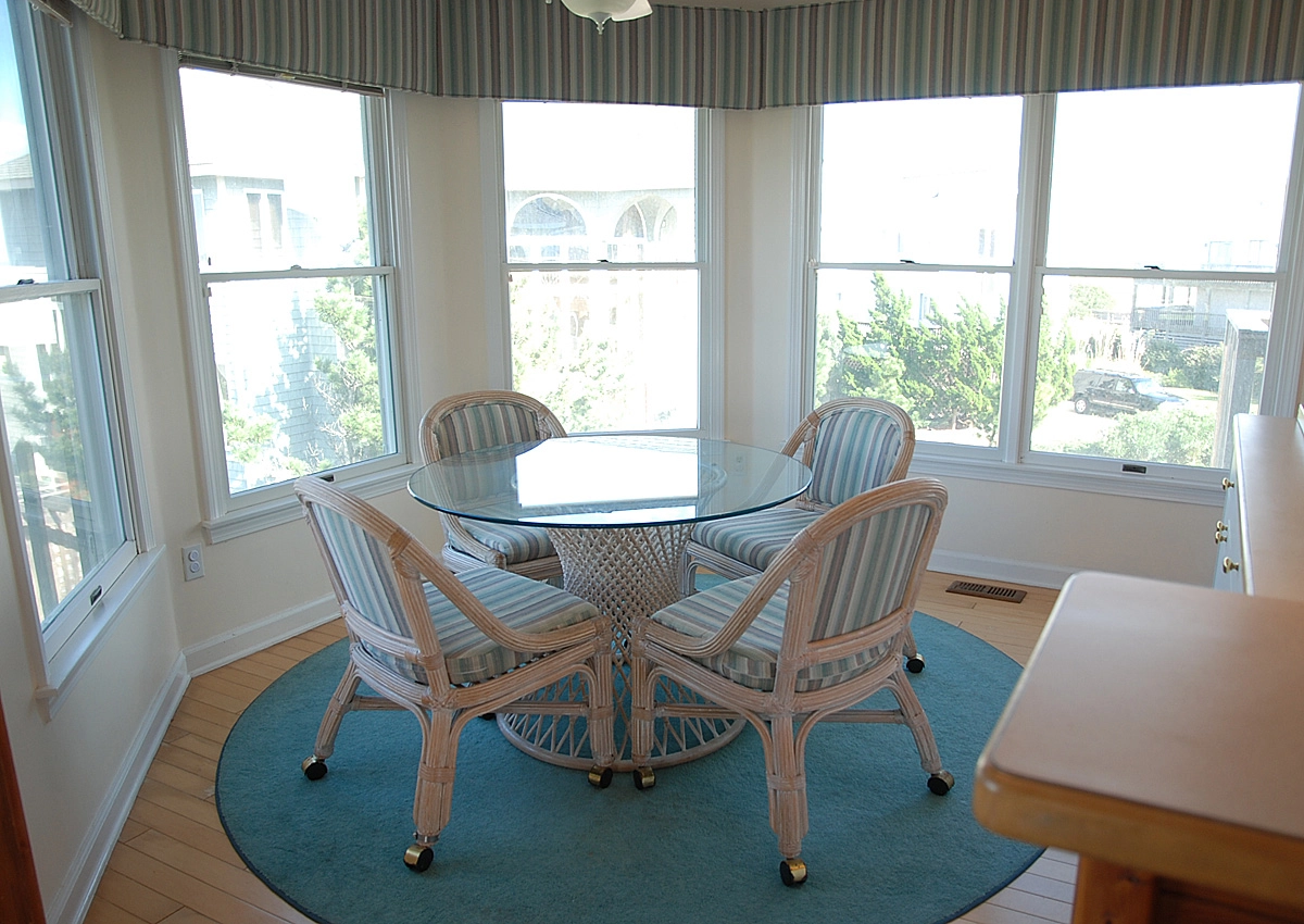 "Southern Lights is a traditional Twiddy home filled with amazing upgrades. Each master bedrooms has a modern, beautiful bathroom including a large, enclosed shower area with a separate soaking tub area along with a double sink vanity. The dining area has a great view of the working lighthouse. The top deck has a breathtaking view of the morning sunrise each day along with a refreshing view of the ocean all day long. Stargazing at night is fun, tool. Thank you."