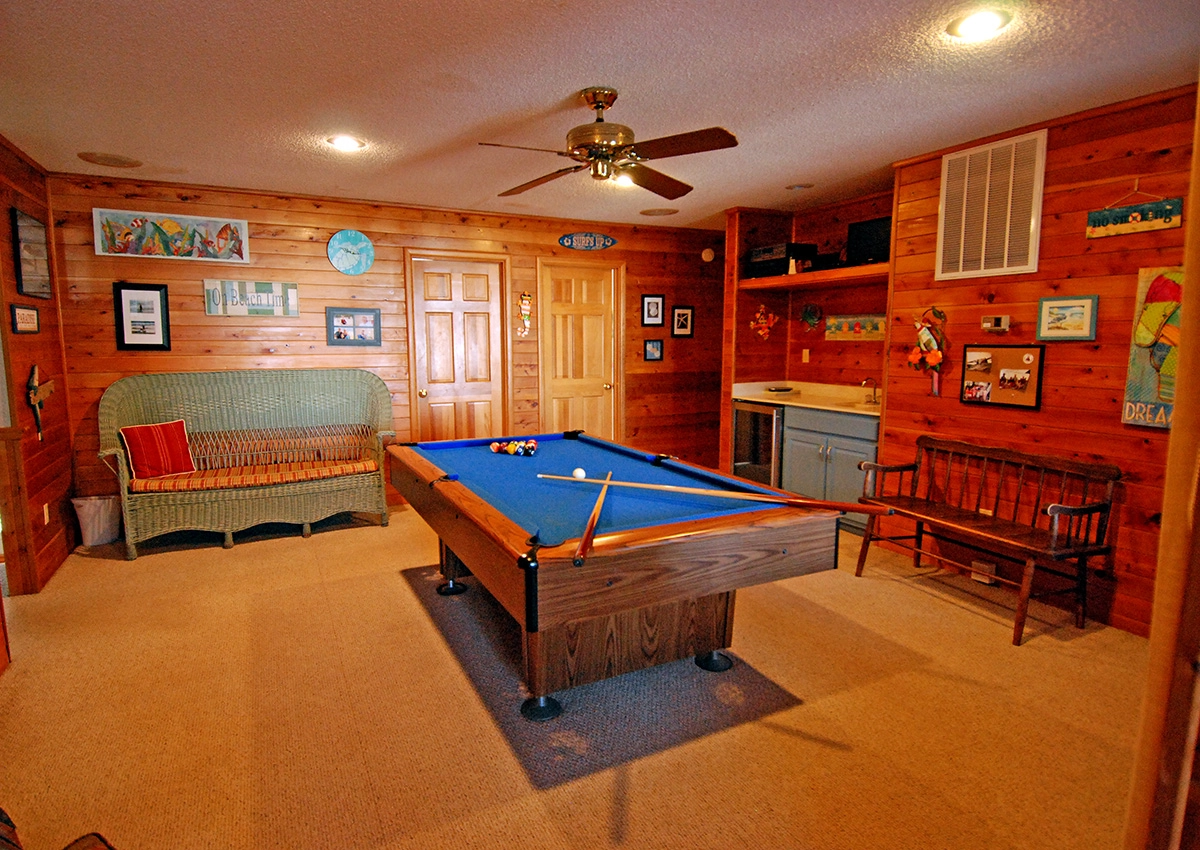 Game room with pool table, entertainment center and wet bar; hot tub.