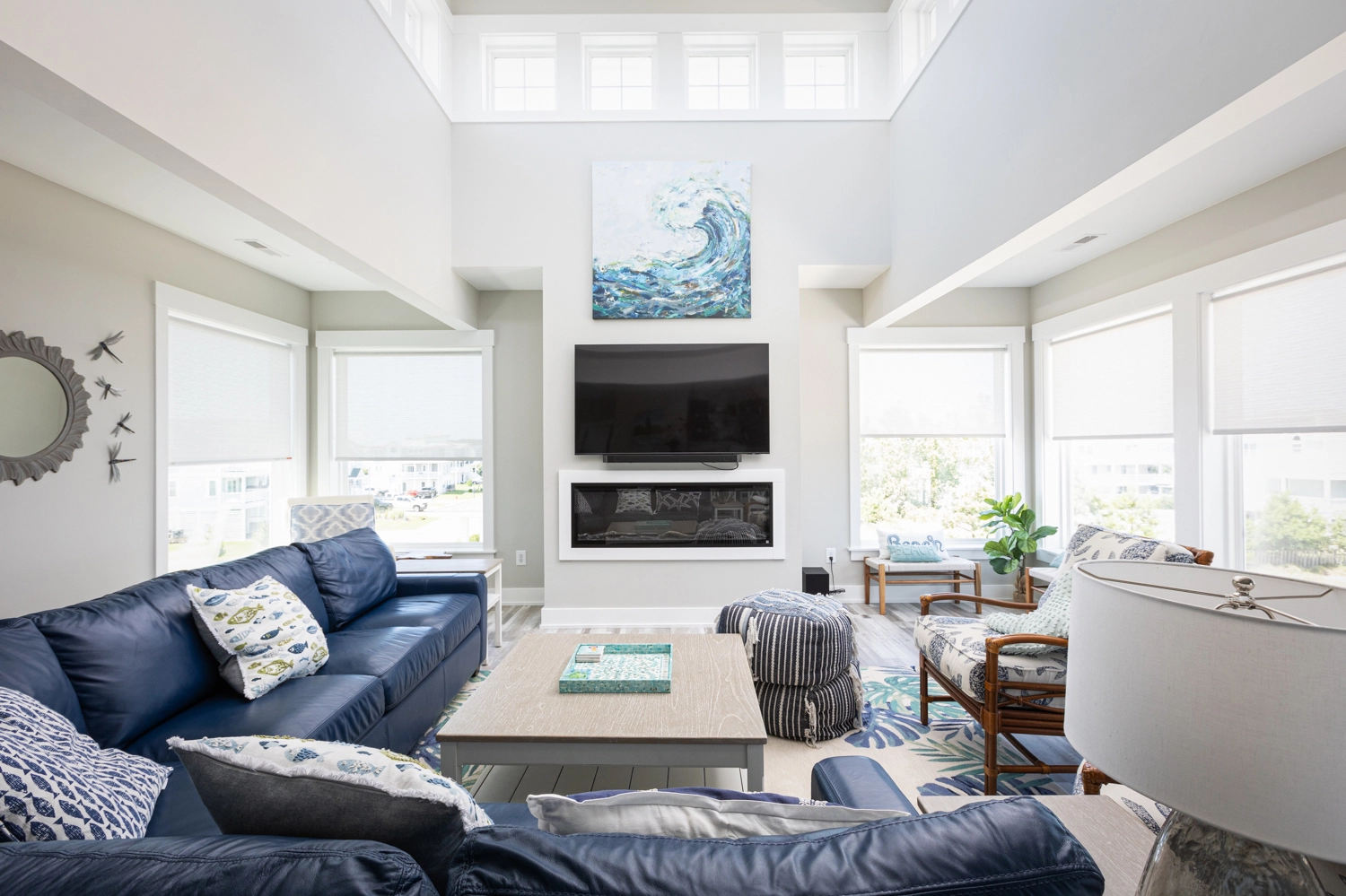 Great room with electric fireplace; kitchen with two dishwashers; dining area with wet bar.