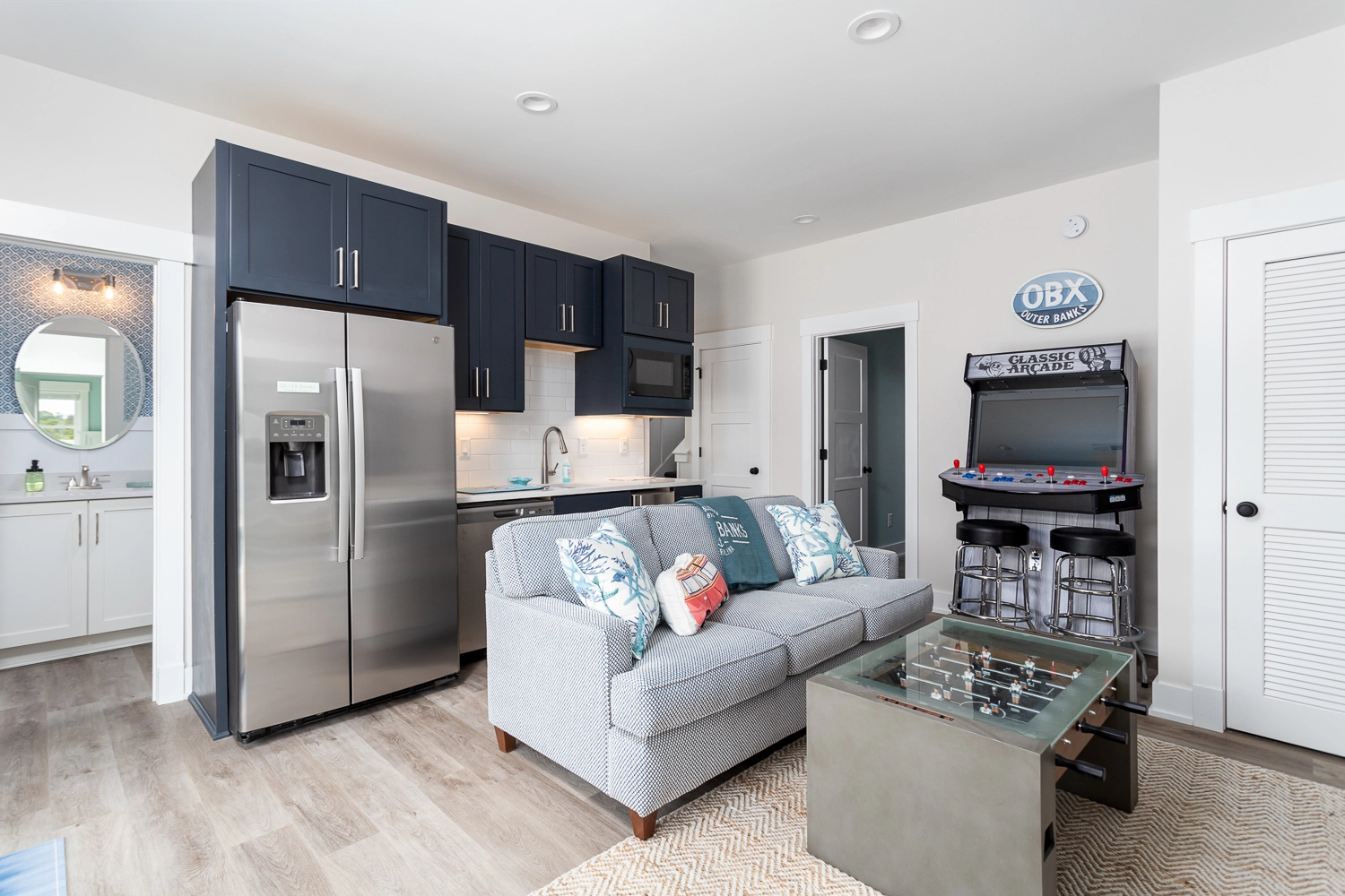 Rec Room with foosball coffee table, arcade game, kitchenette with refrigerator and dishwasher.