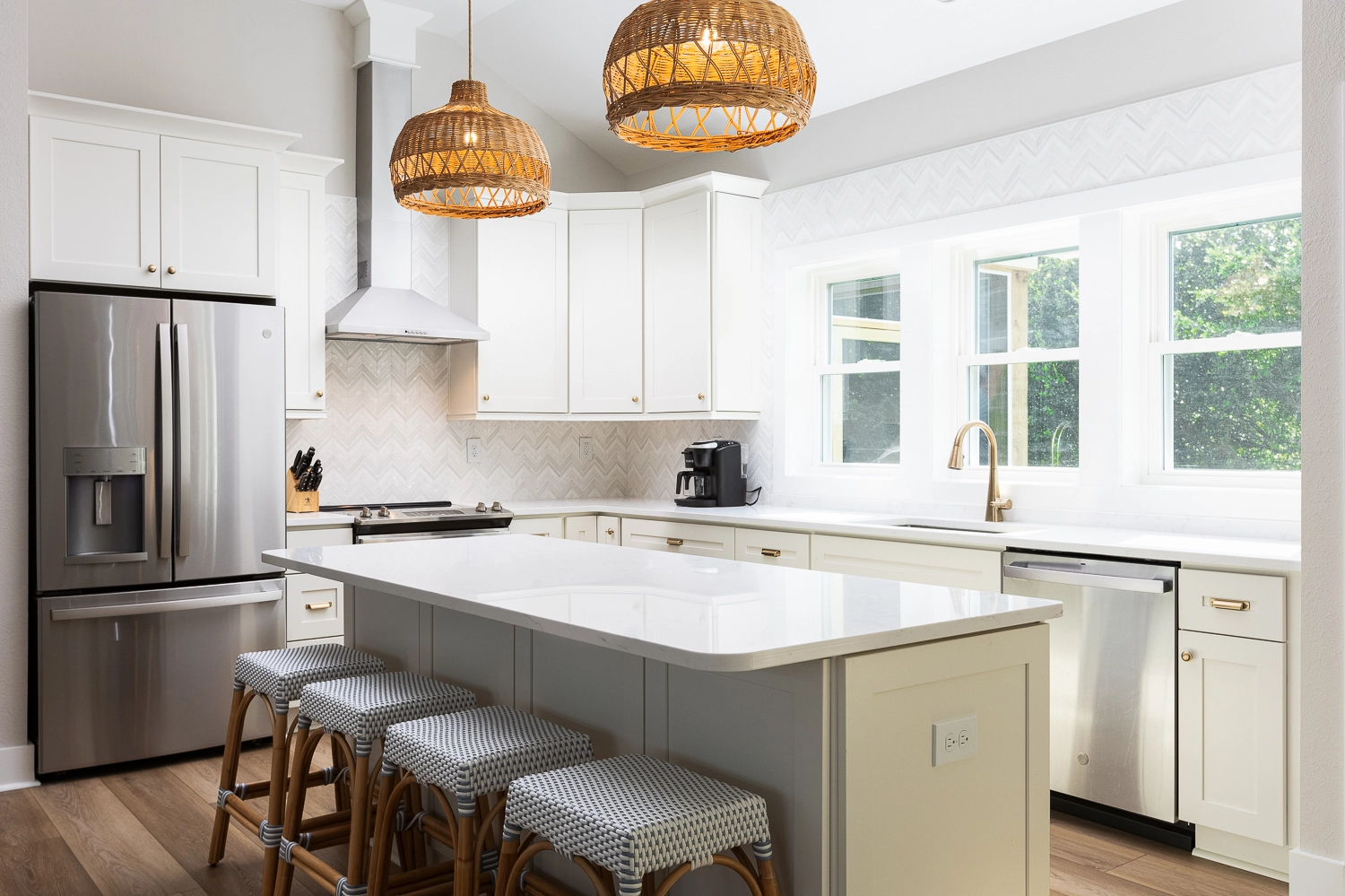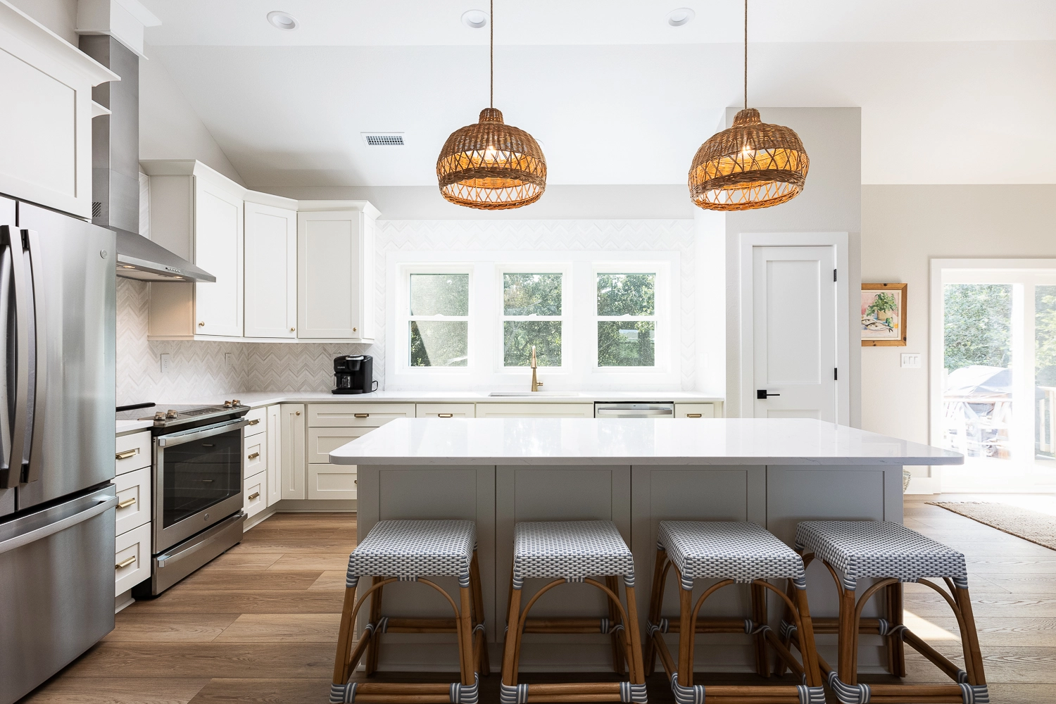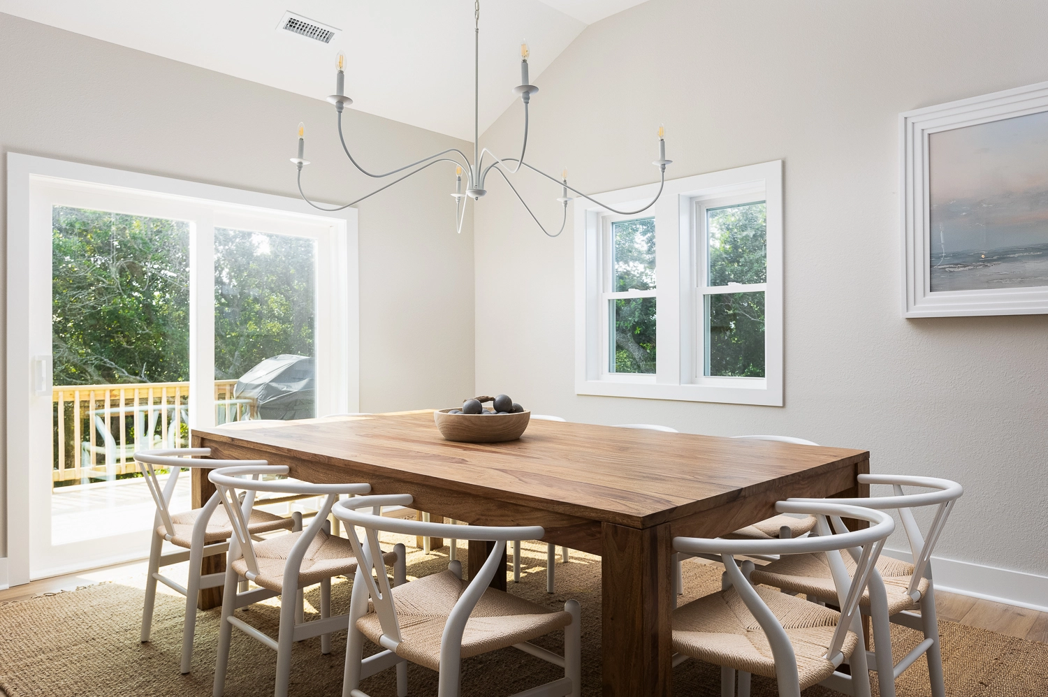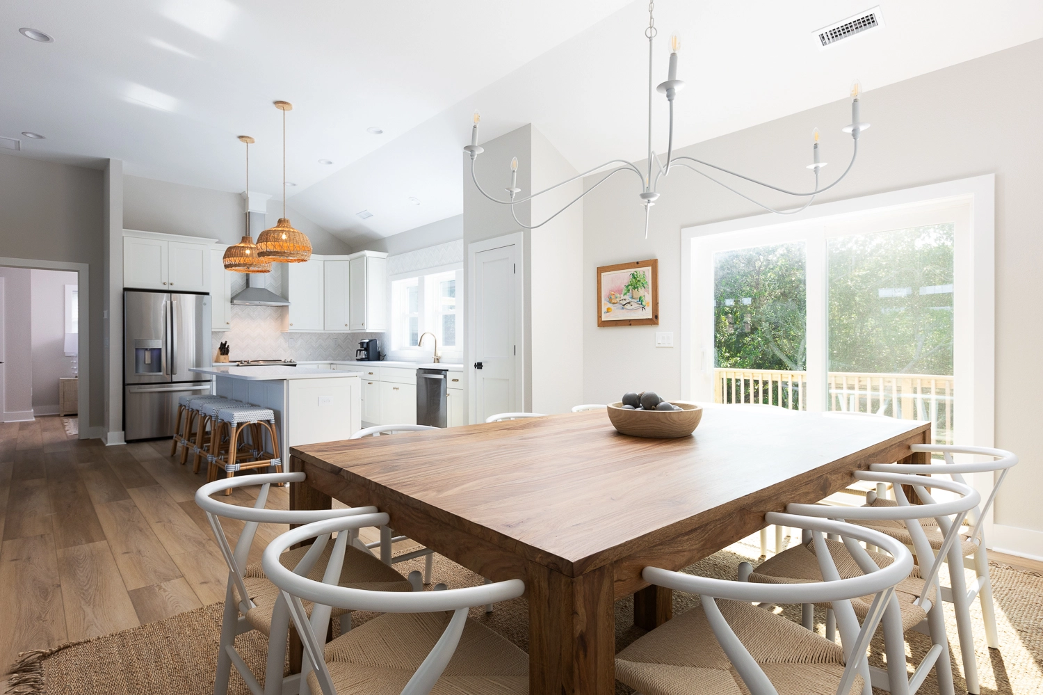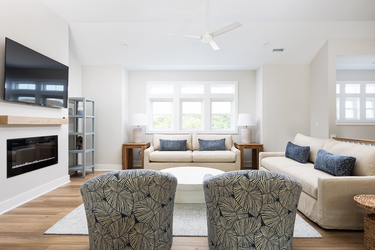 Great room with electric fireplace; kitchen; dining area.