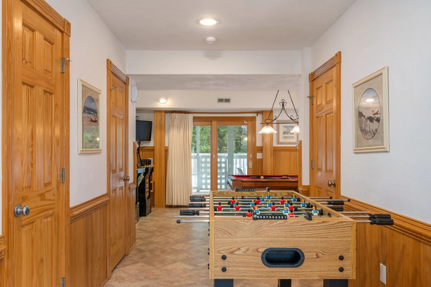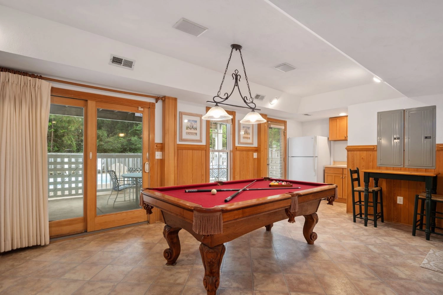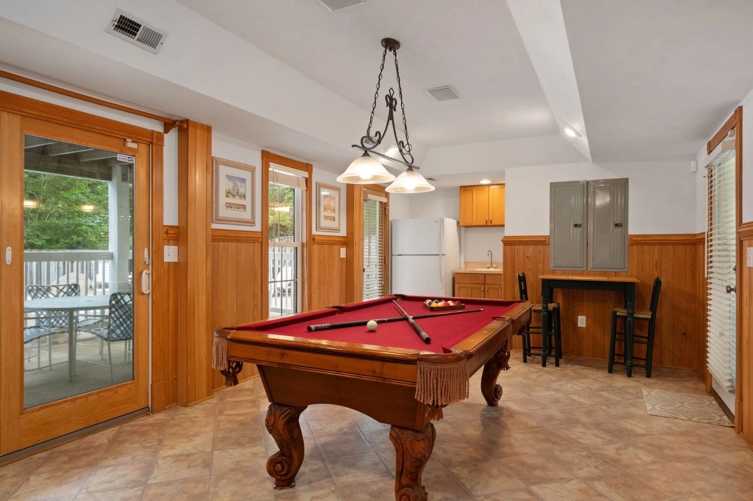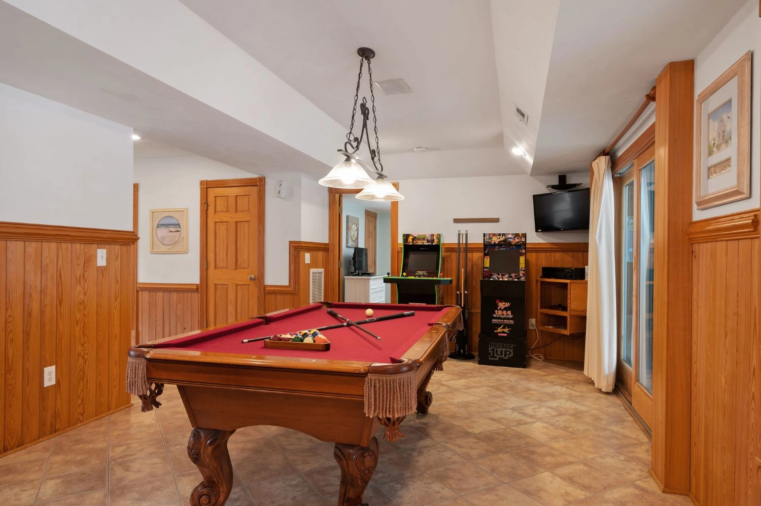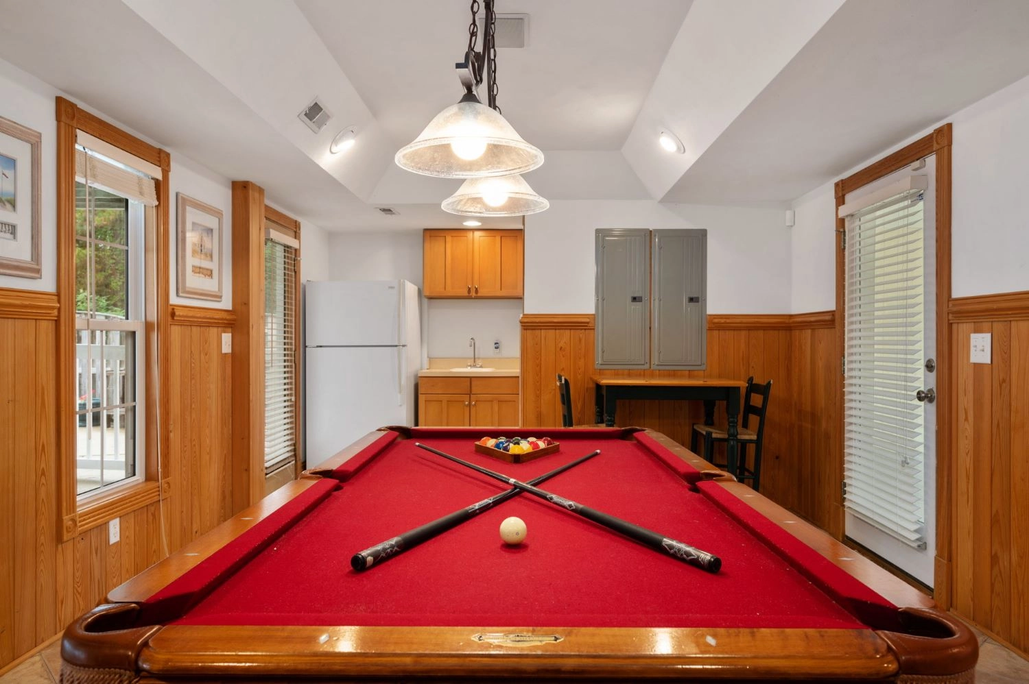 Rec room with pool table, arcade game, and wet bar with refrigerator.