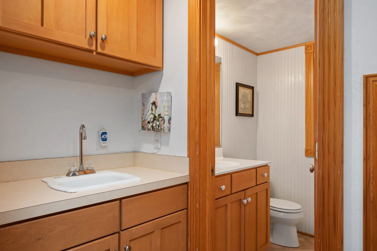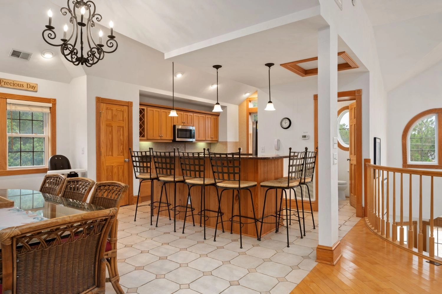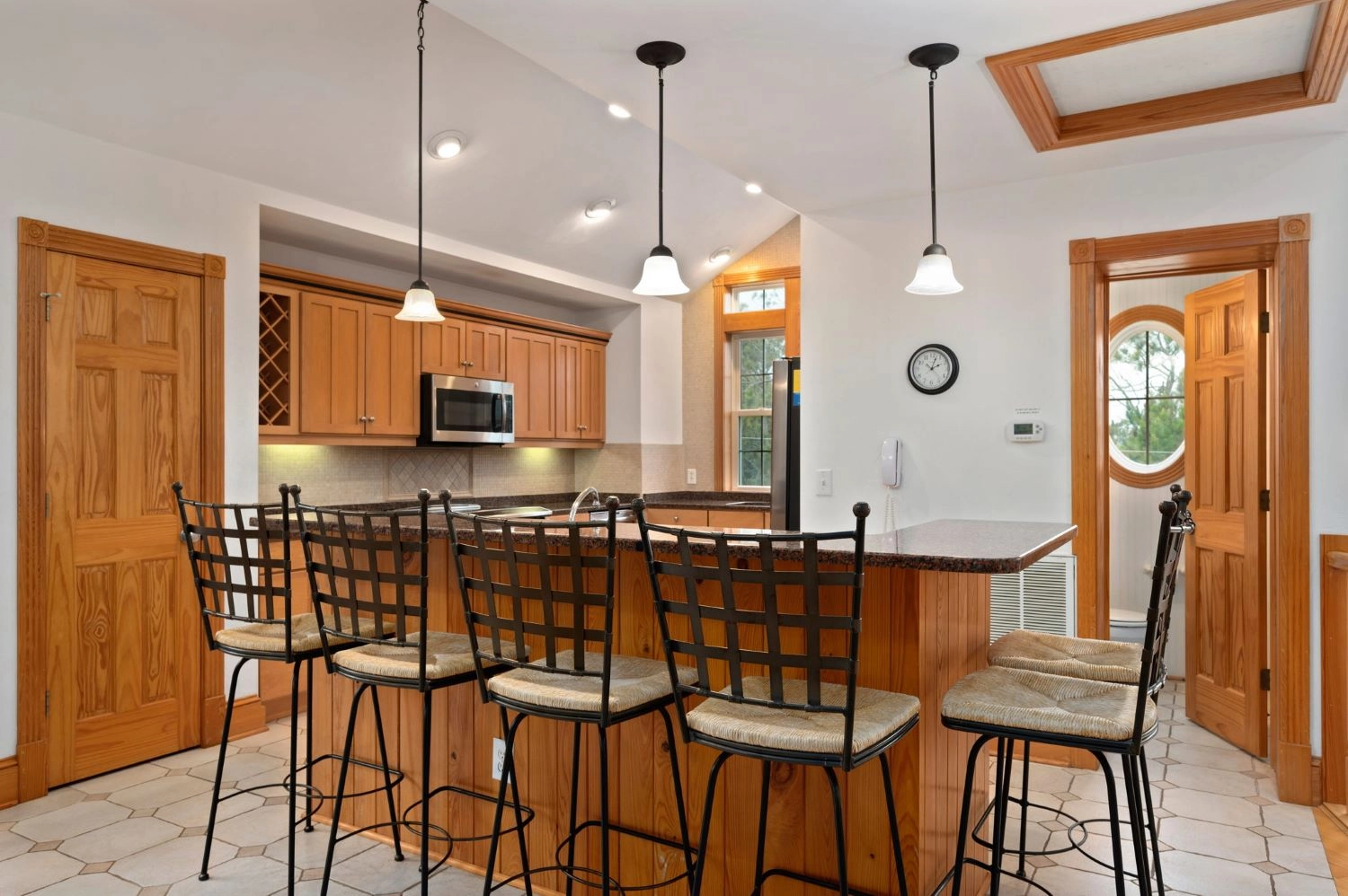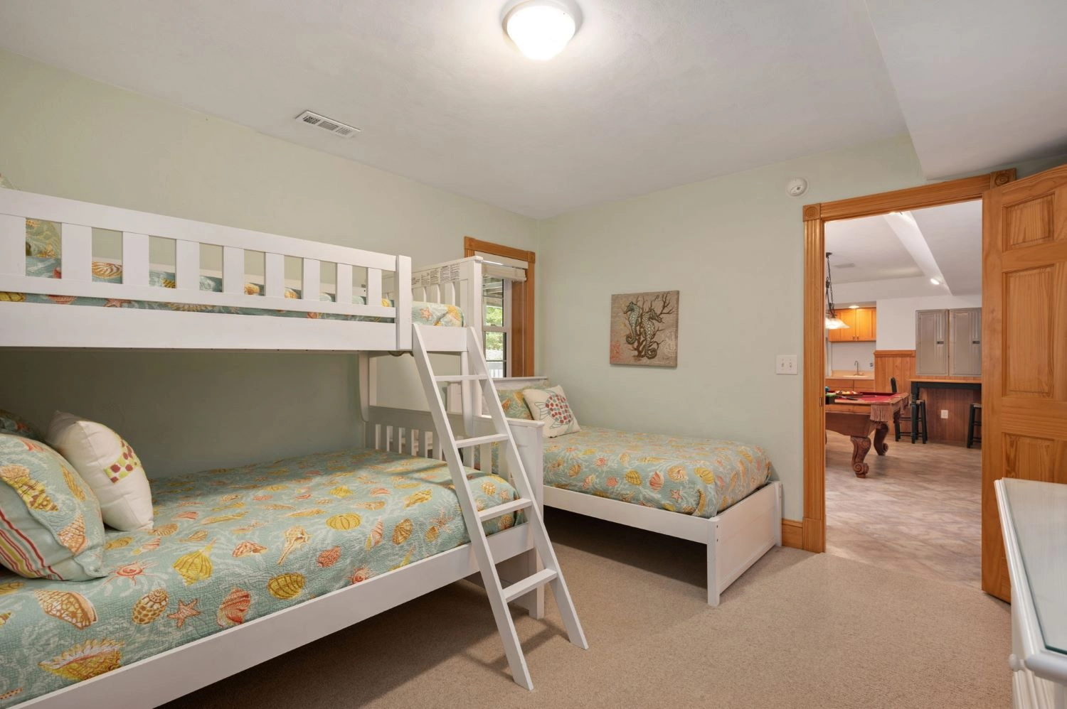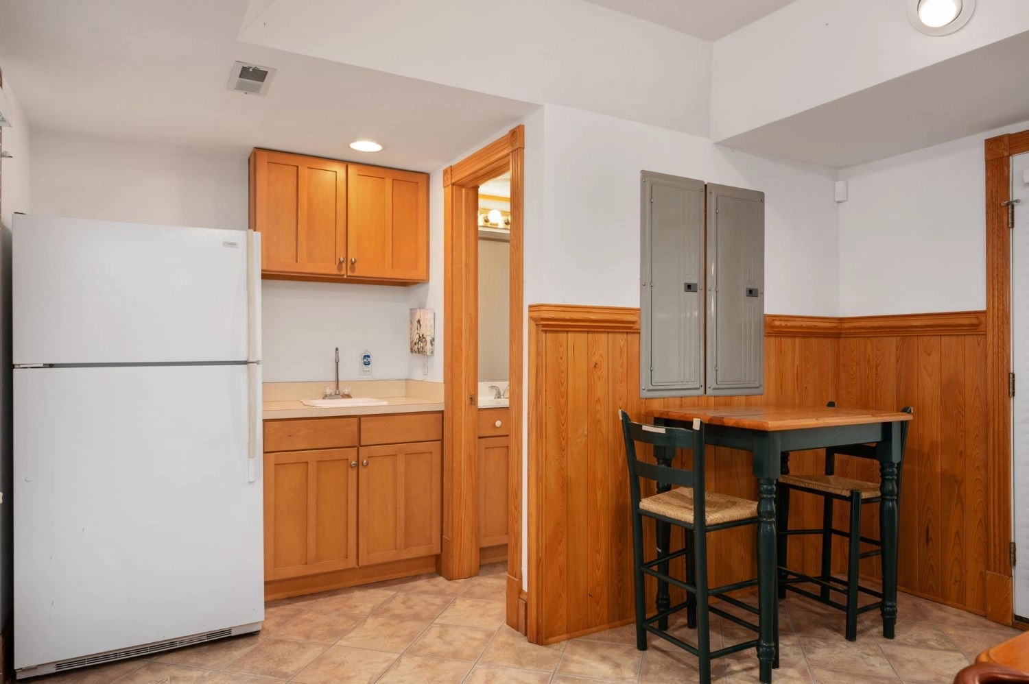 Rec room with pool table, arcade game, and wet bar with refrigerator.