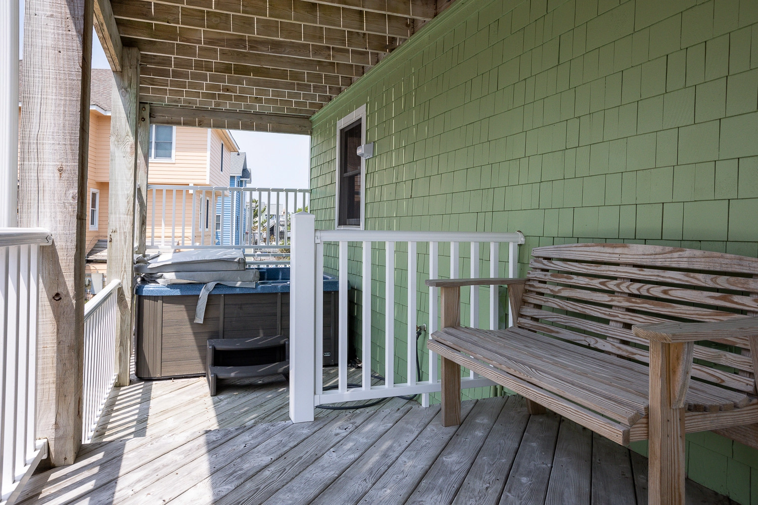Covered decks with six-person hot tub.